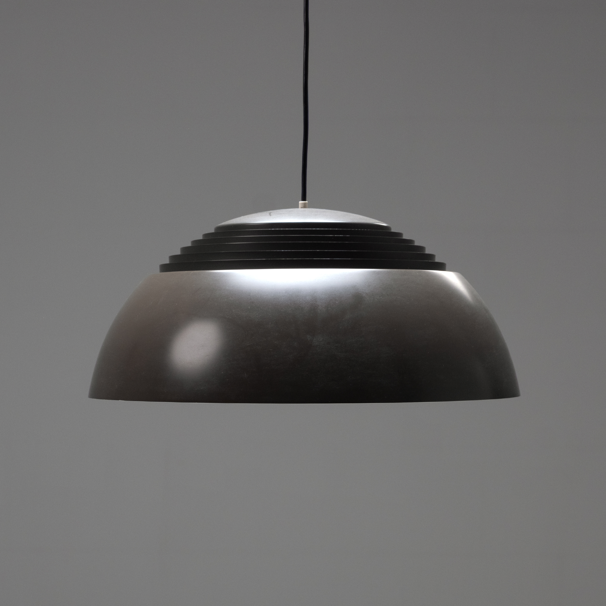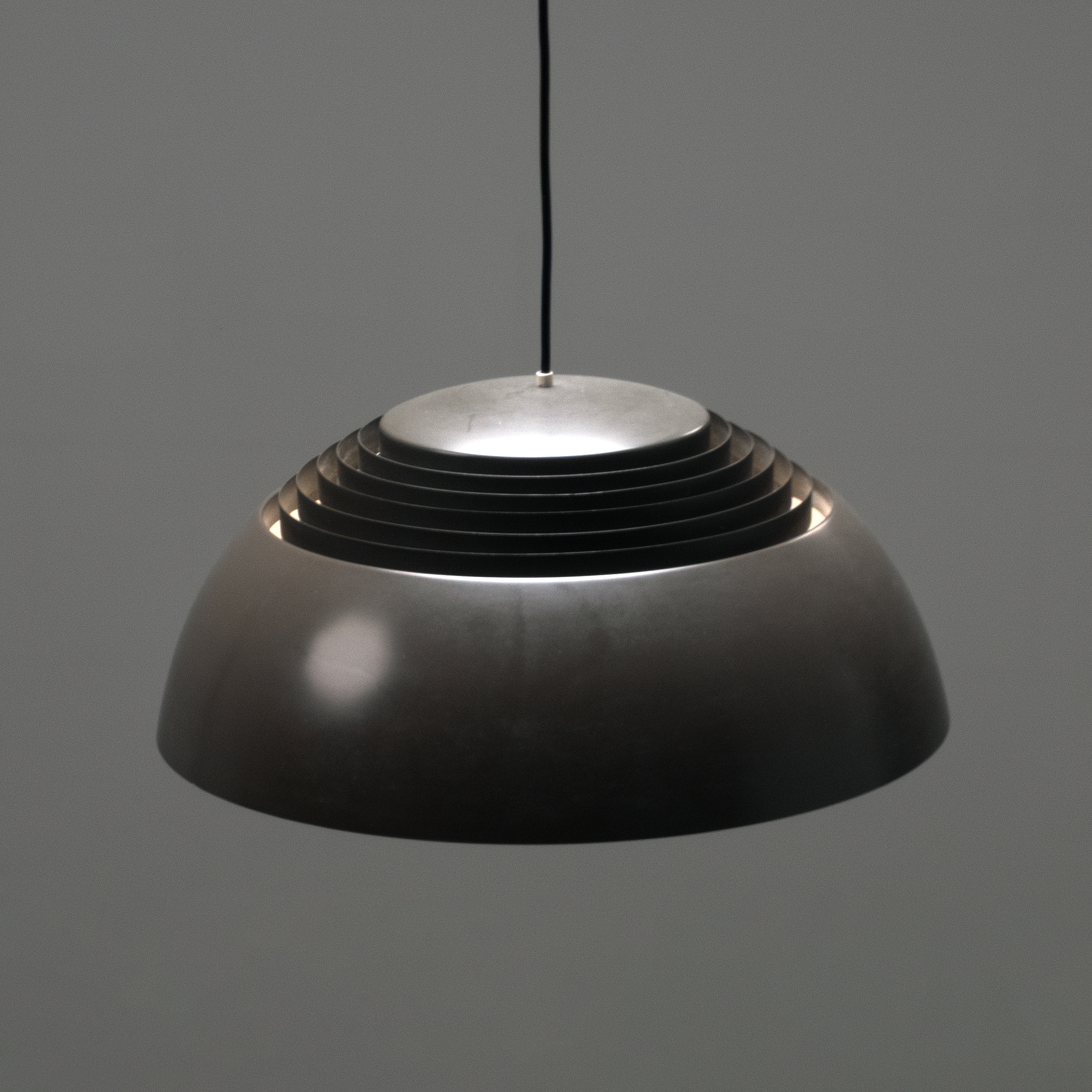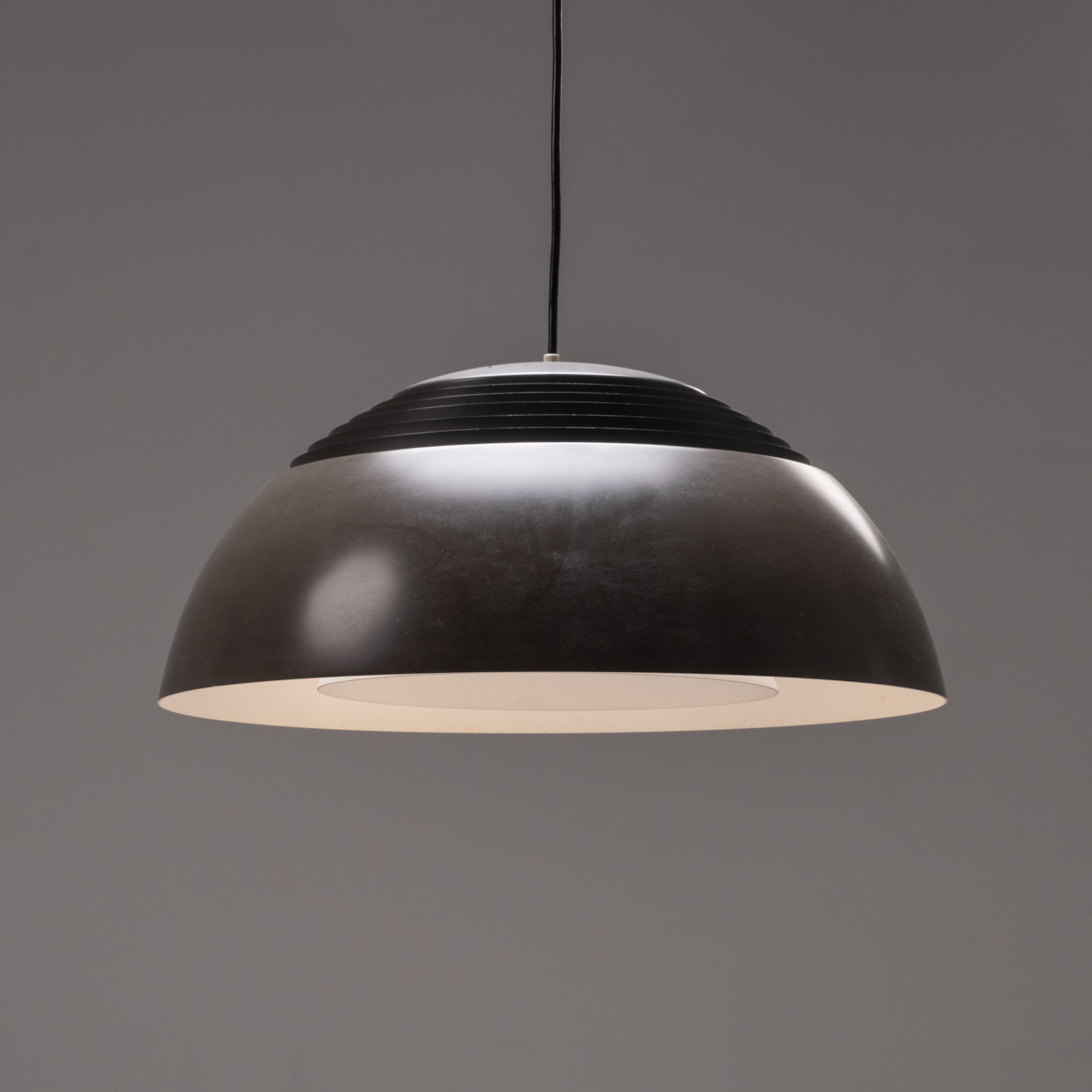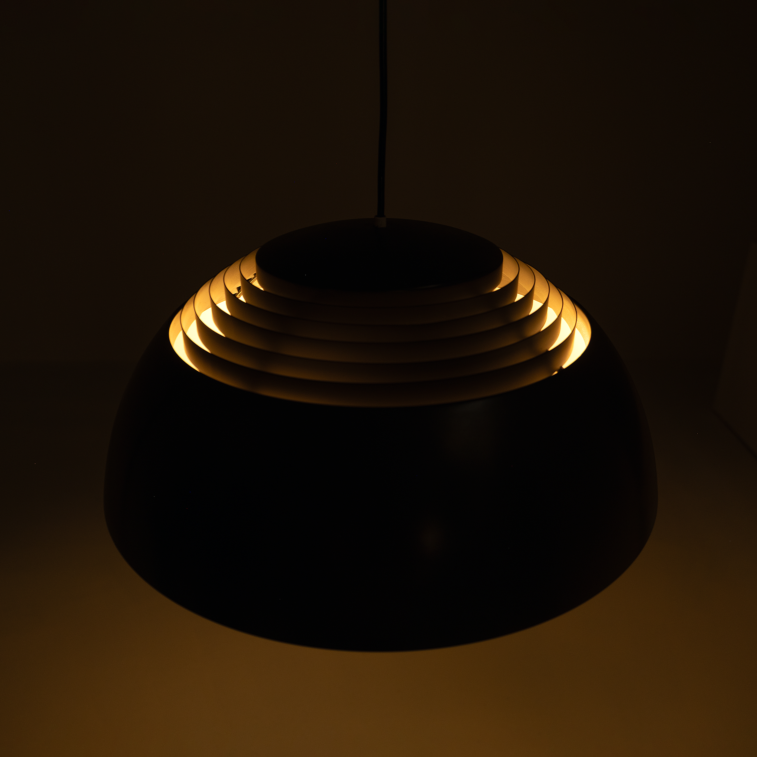 The AJ Royal Lamp, designed by Arne Jacobsen for Louis Poulsen in 1957, is a classic example of modern Danish lighting design. Originally created for the SAS Royal Hotel in Copenhagen, the lamp embodies Jacobsen’s signature minimalism and architectural precision. Its distinctive dome-shaped shade, paired with a louvered interior that softens and directs light downward, creates a warm and glare-free ambience.
