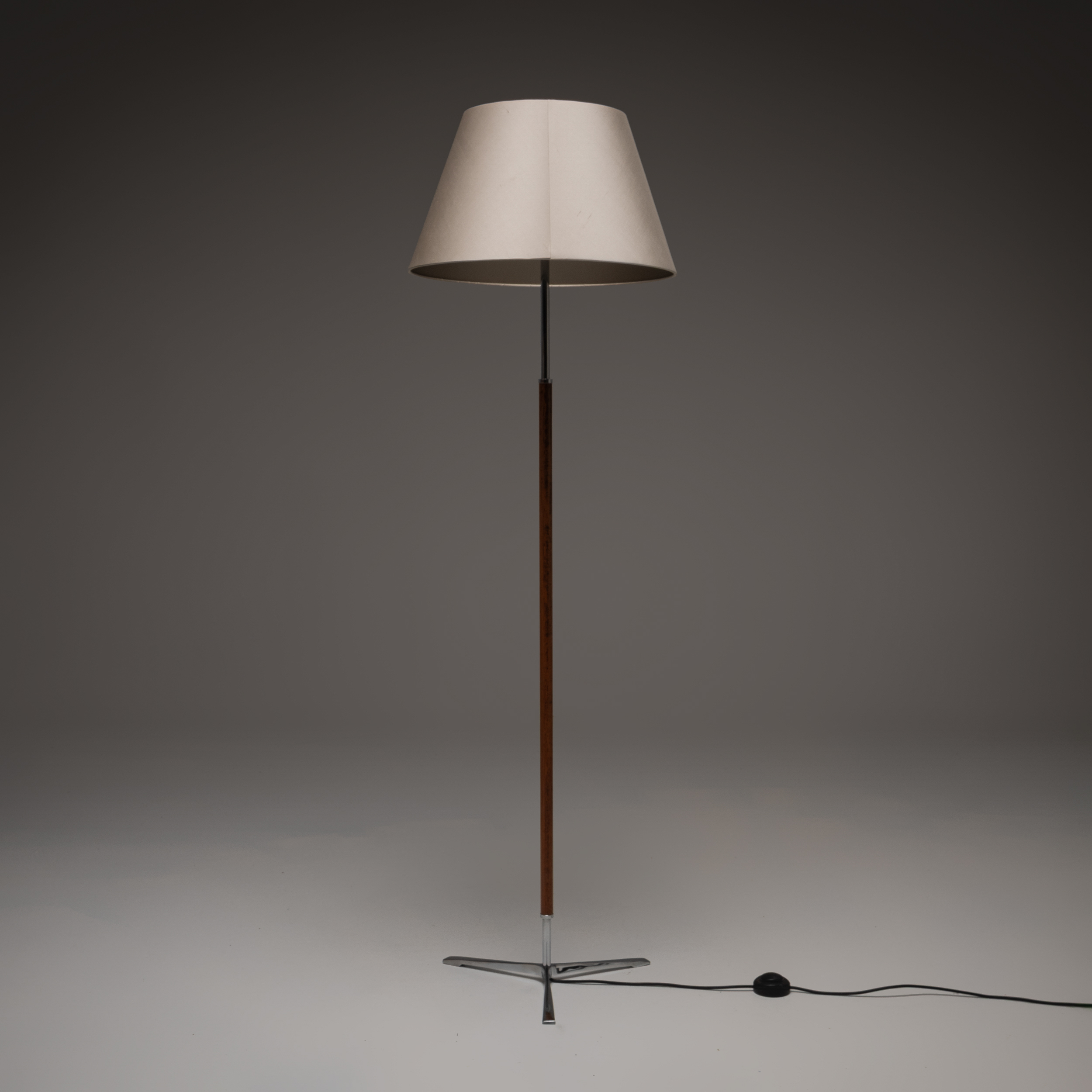 This elegant chrome and teak with shade floor lamp from the 1960s is a beautifully balanced example of mid-century European design. Combining a slender chrome stem with a teak-veneered wooden shaft and a three-point metal base, the lamp embodies precision, proportion, and understated sophistication.