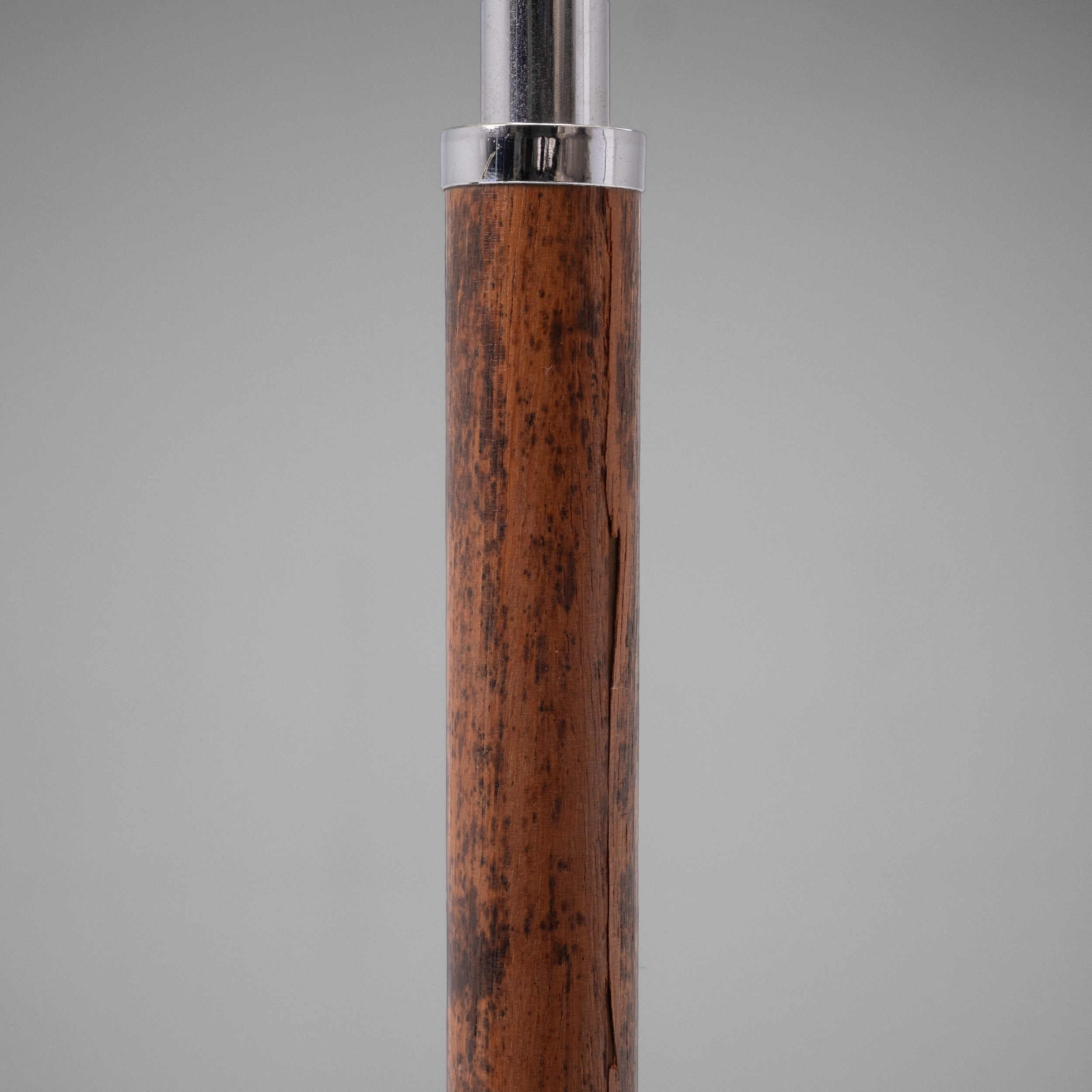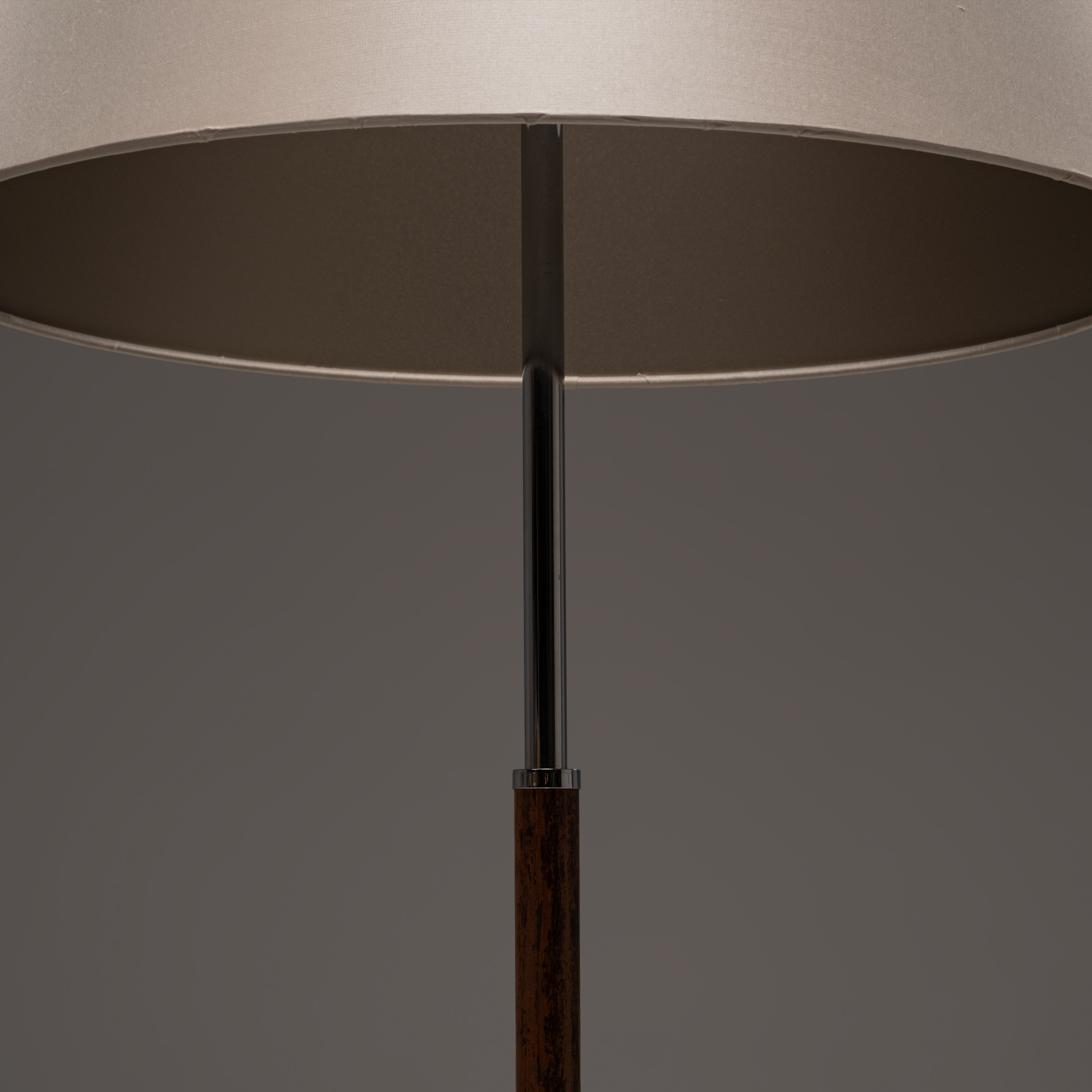Topped with a cream-colored fabric shade, it emits a soft, warm light that highlights the natural warmth of the wood and the sleek character of the chrome. A timeless interplay of natural and industrial materials.
