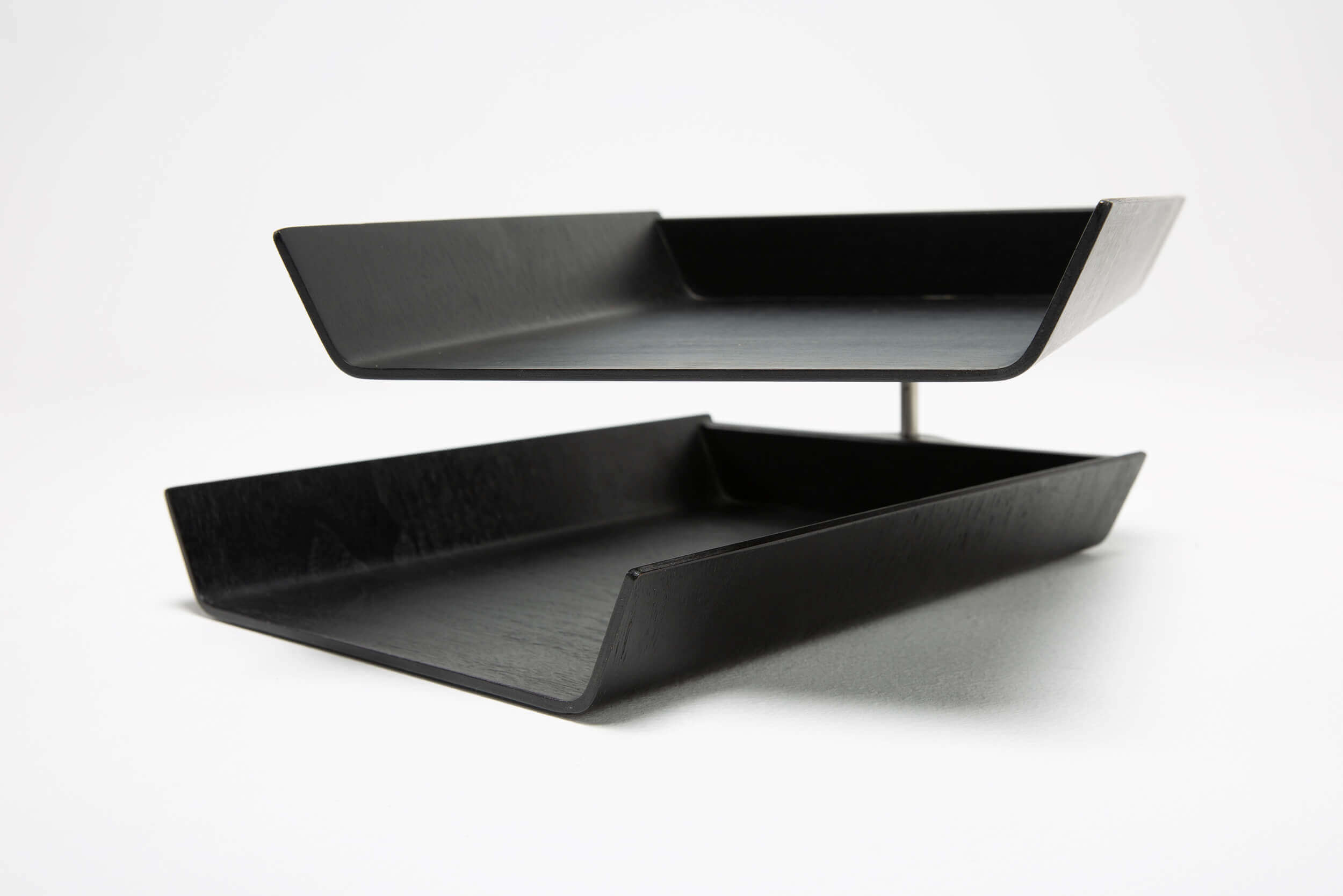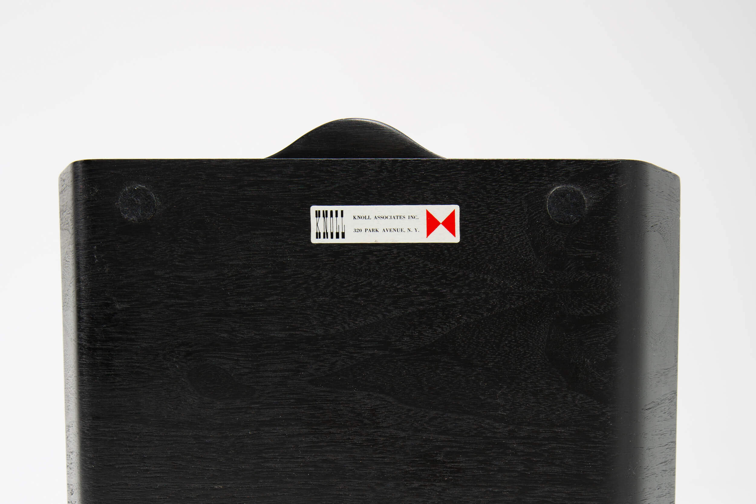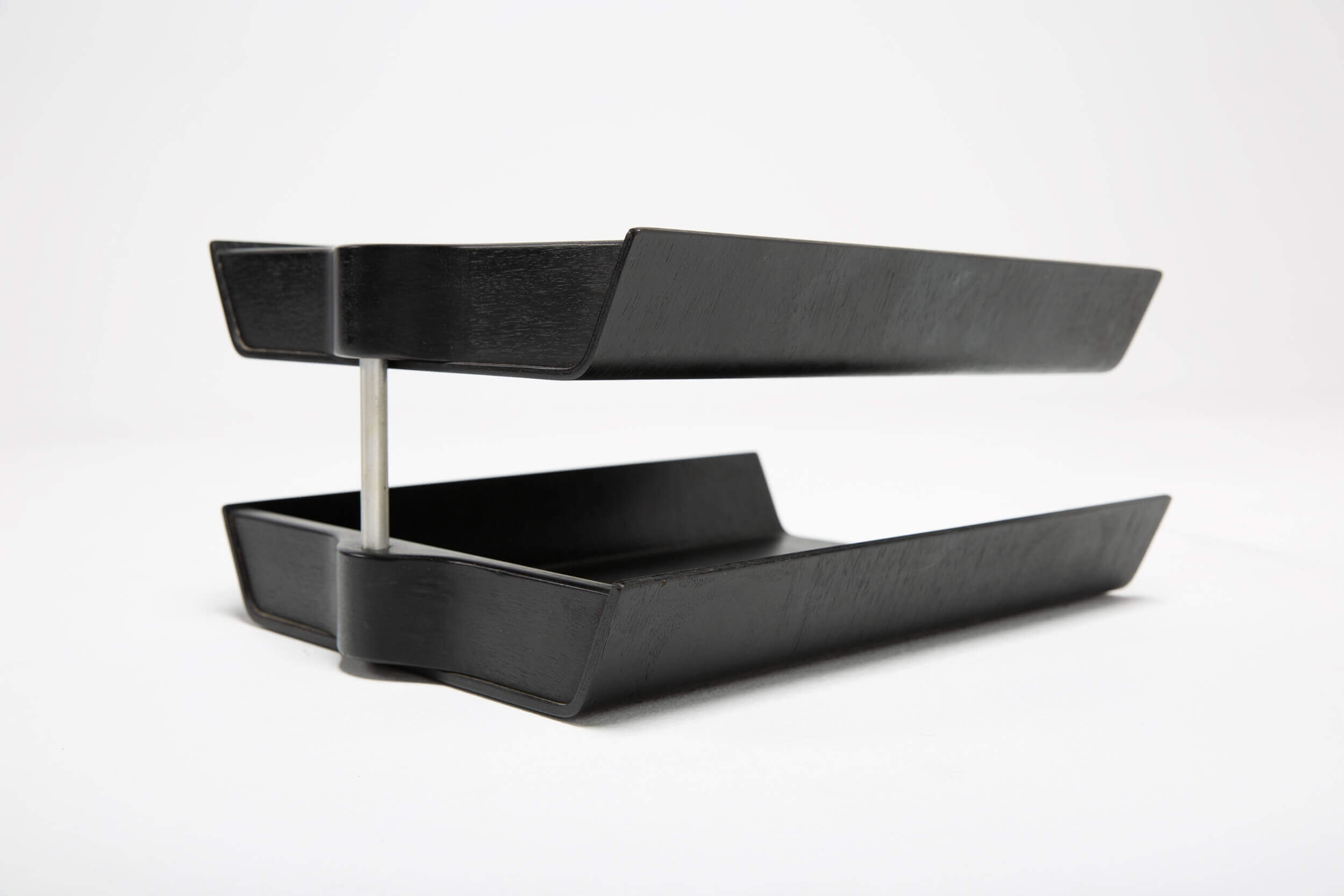 Upgrade your (home) office with this original Florence Knoll design. This black ebonized two-tier wooden and aluminum pivoting letter tray/desk organizer dates back to the 1950s and is still in very good condition.