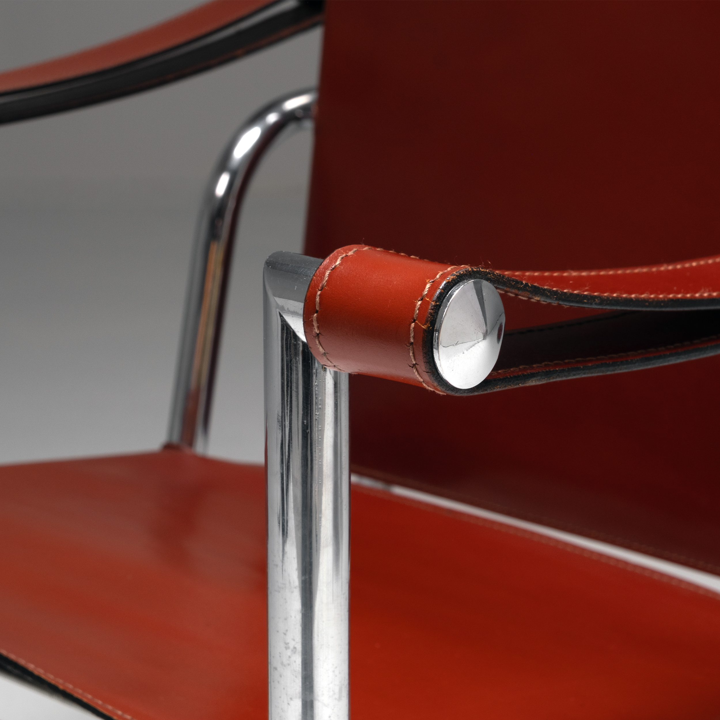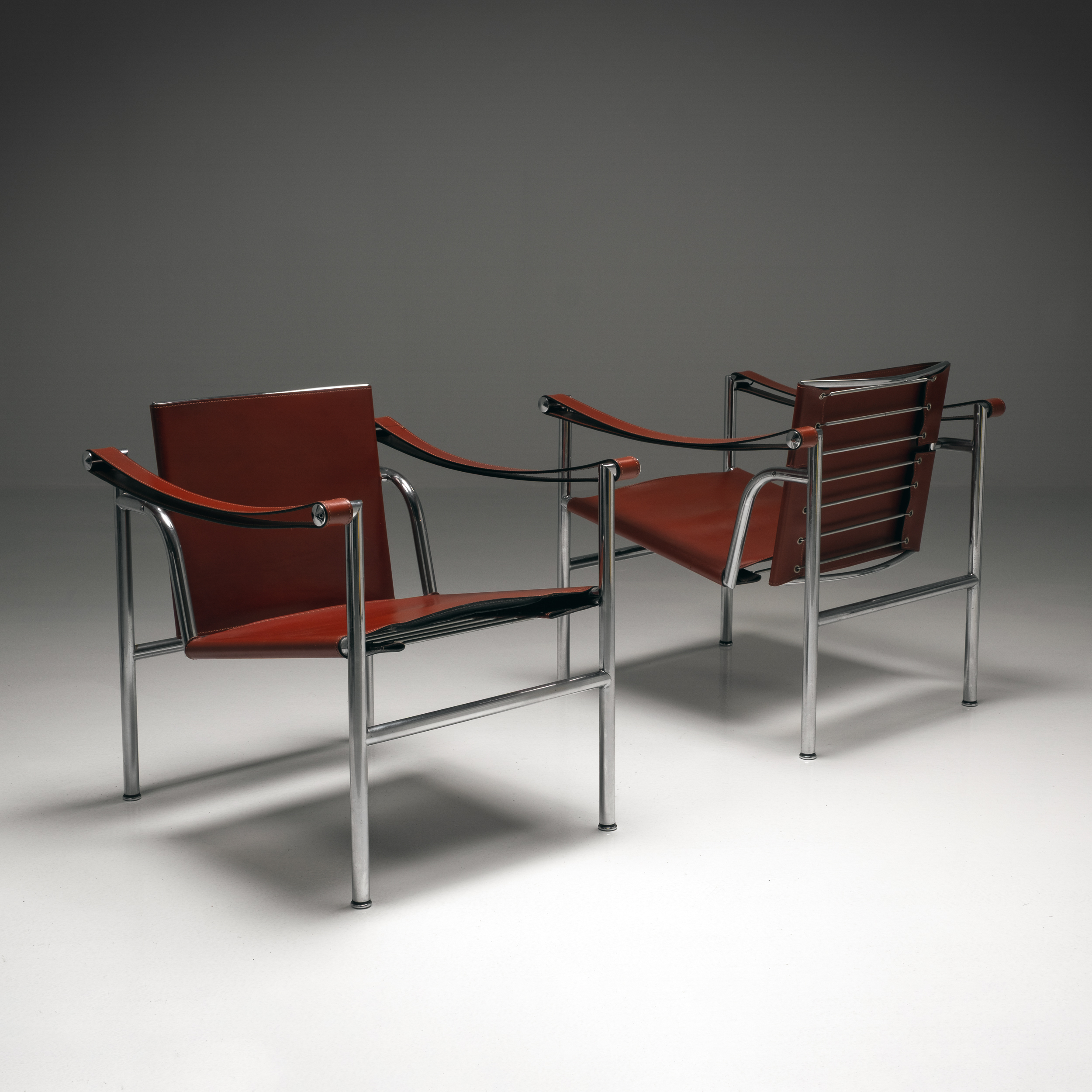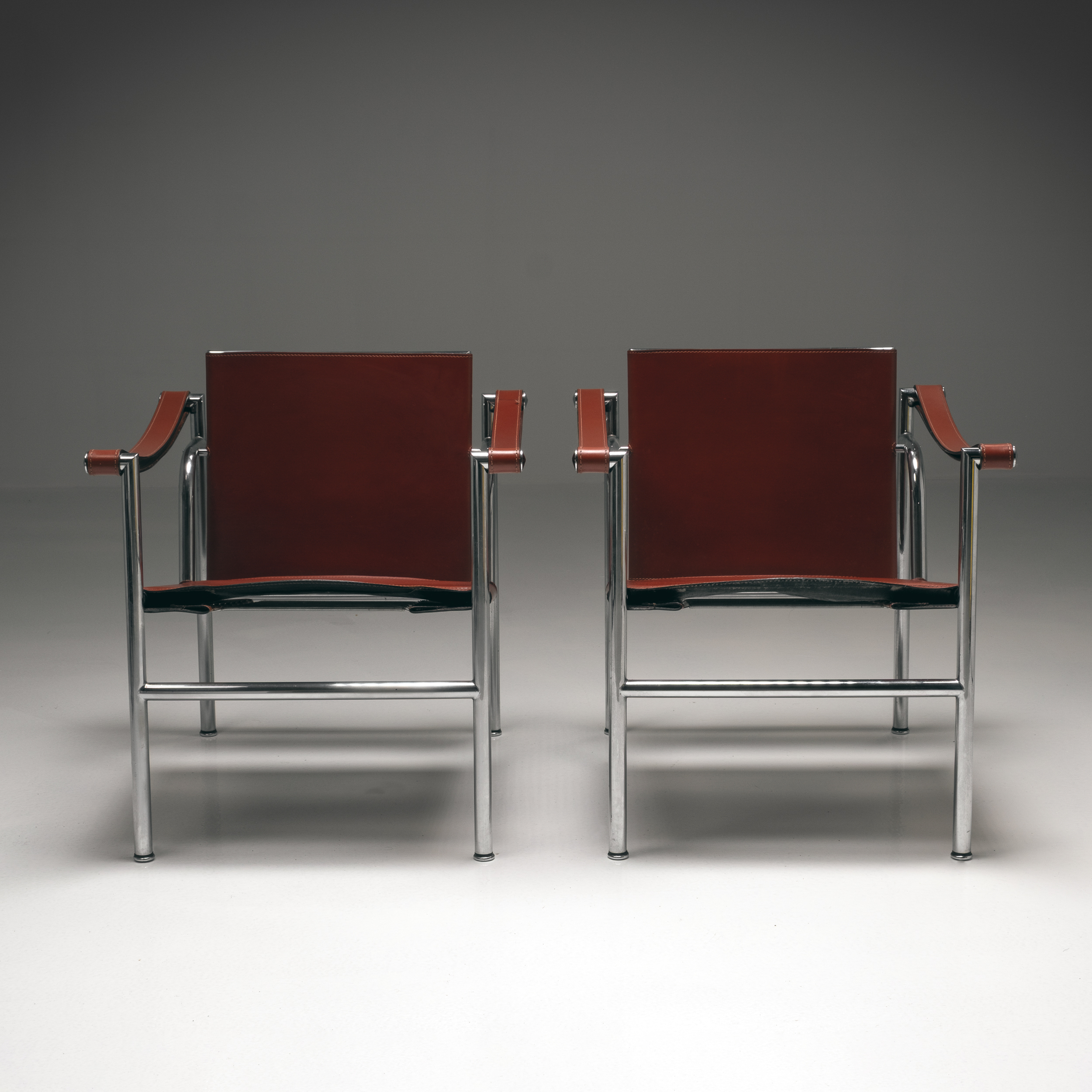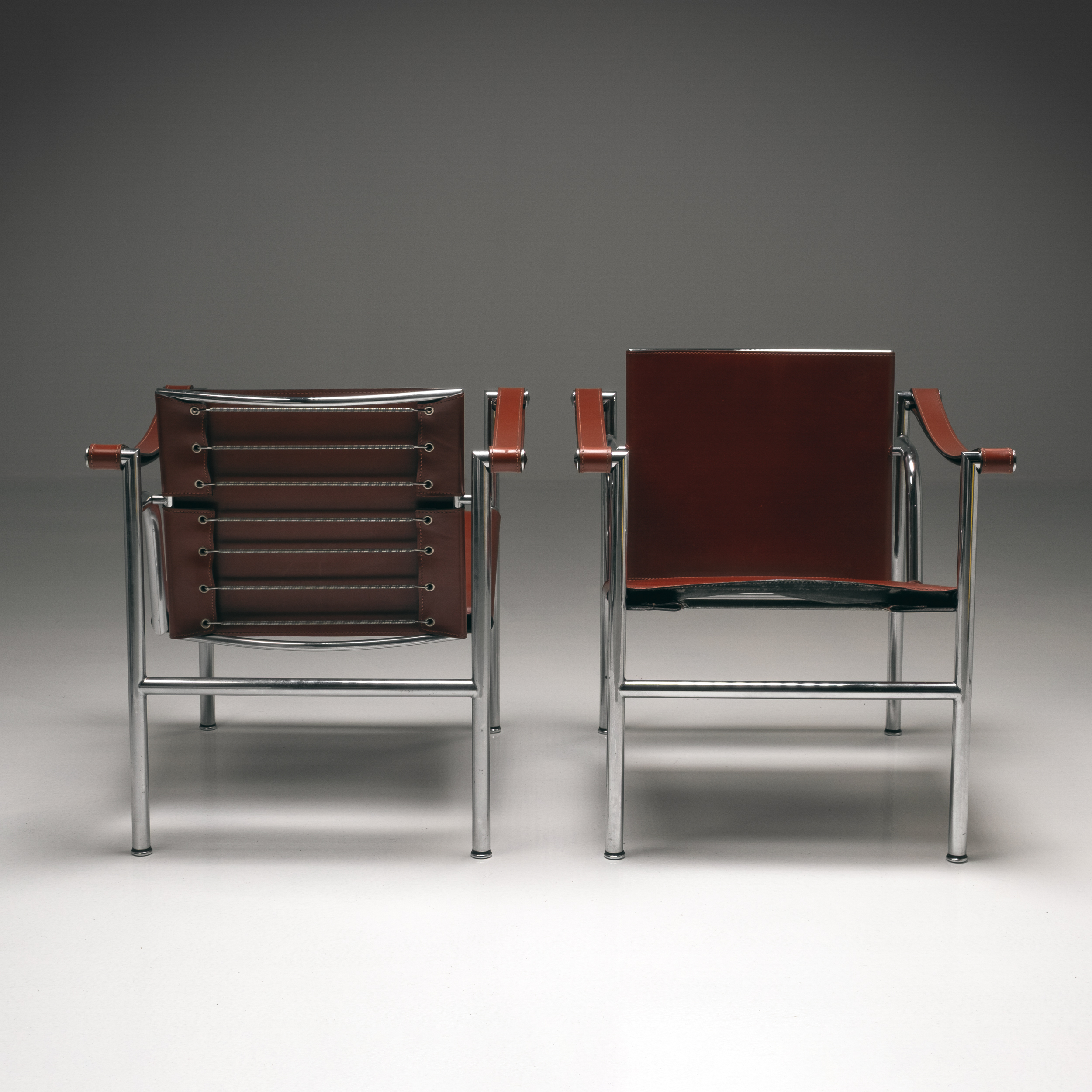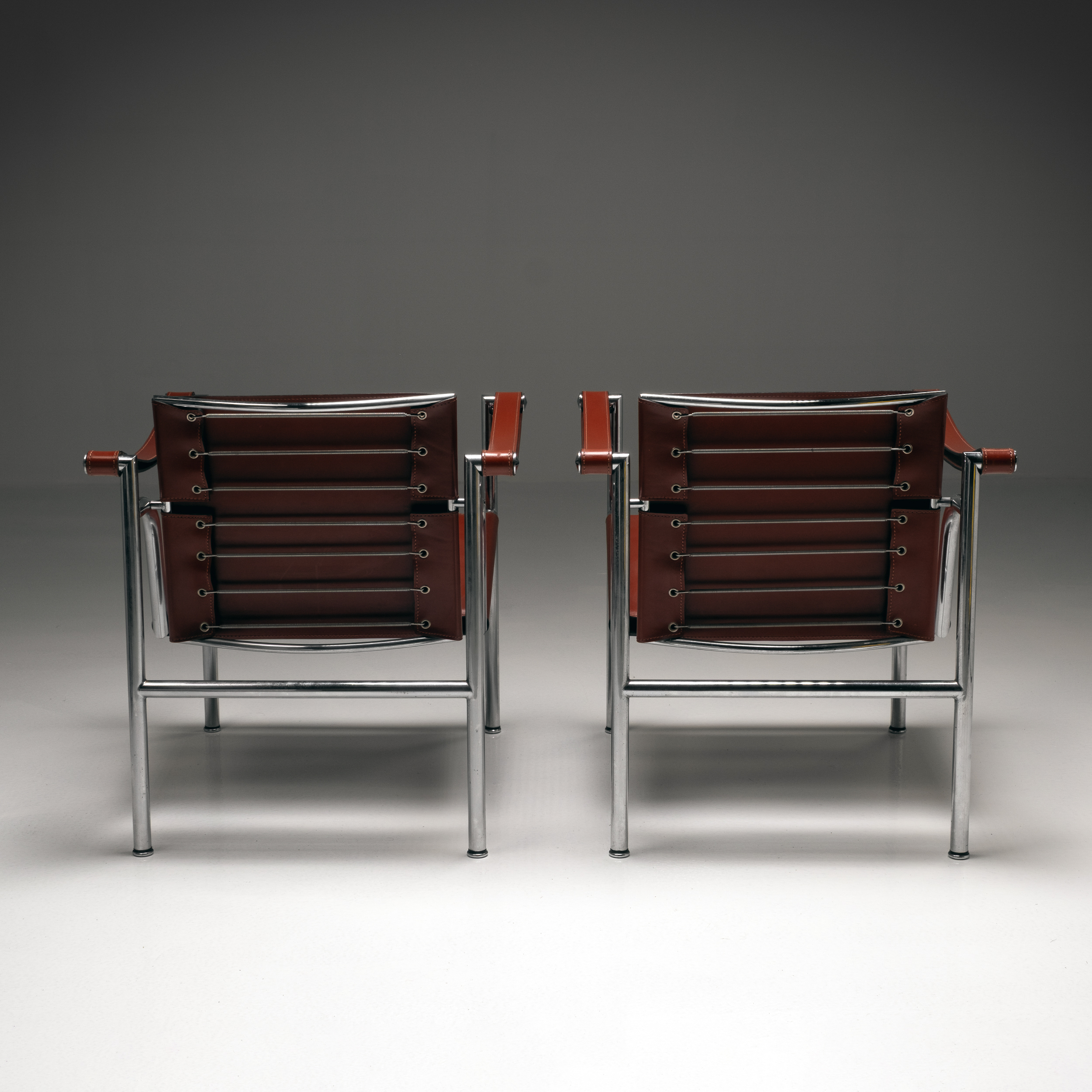 Ideal as a pair in a reading corner, living space, or office, these LC1 chairs exemplify timeless modernism, functional art that transcends eras.