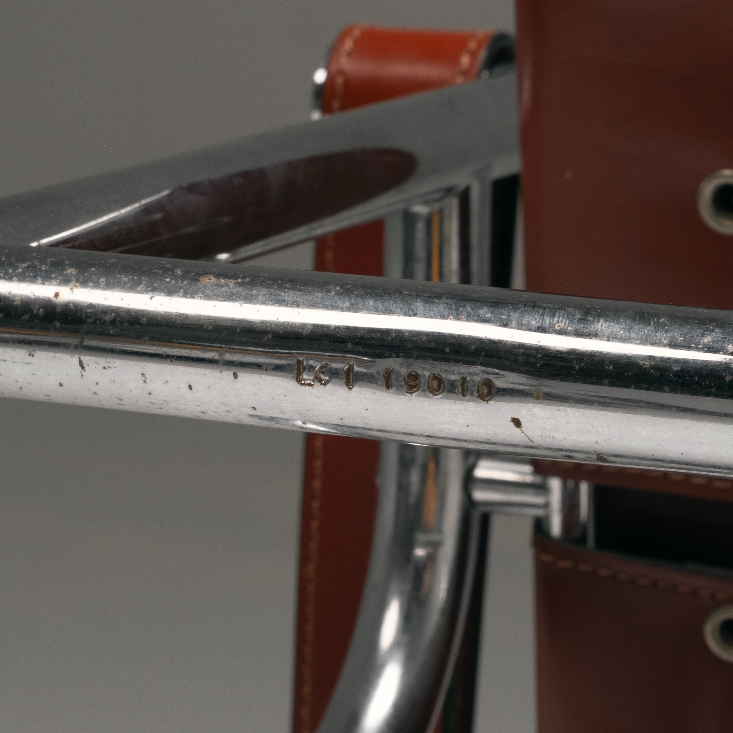 The chairs are in very good vintage condition, featuring beautiful brown leather and minor signs of use consistent with age. Comes with original markings/serial number.