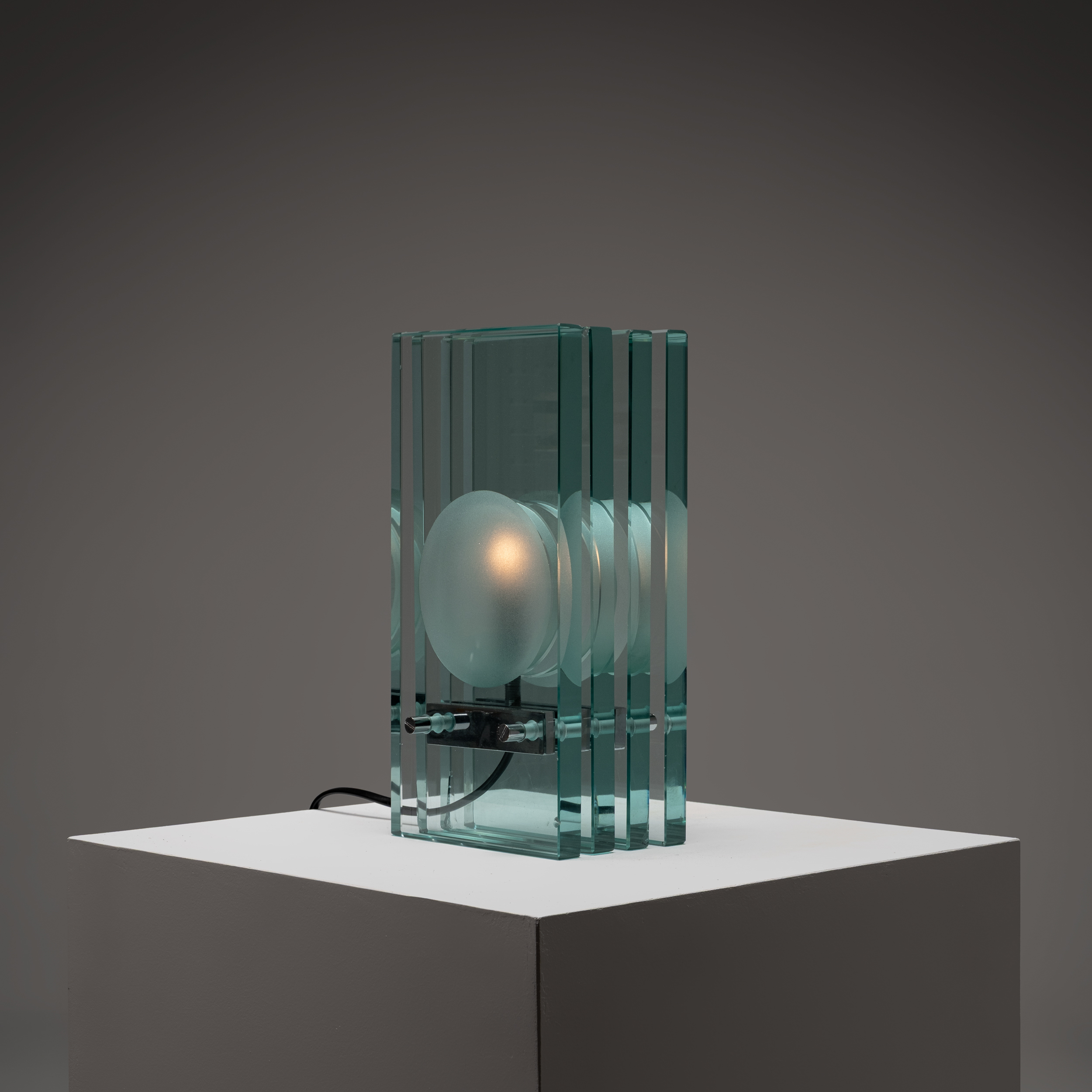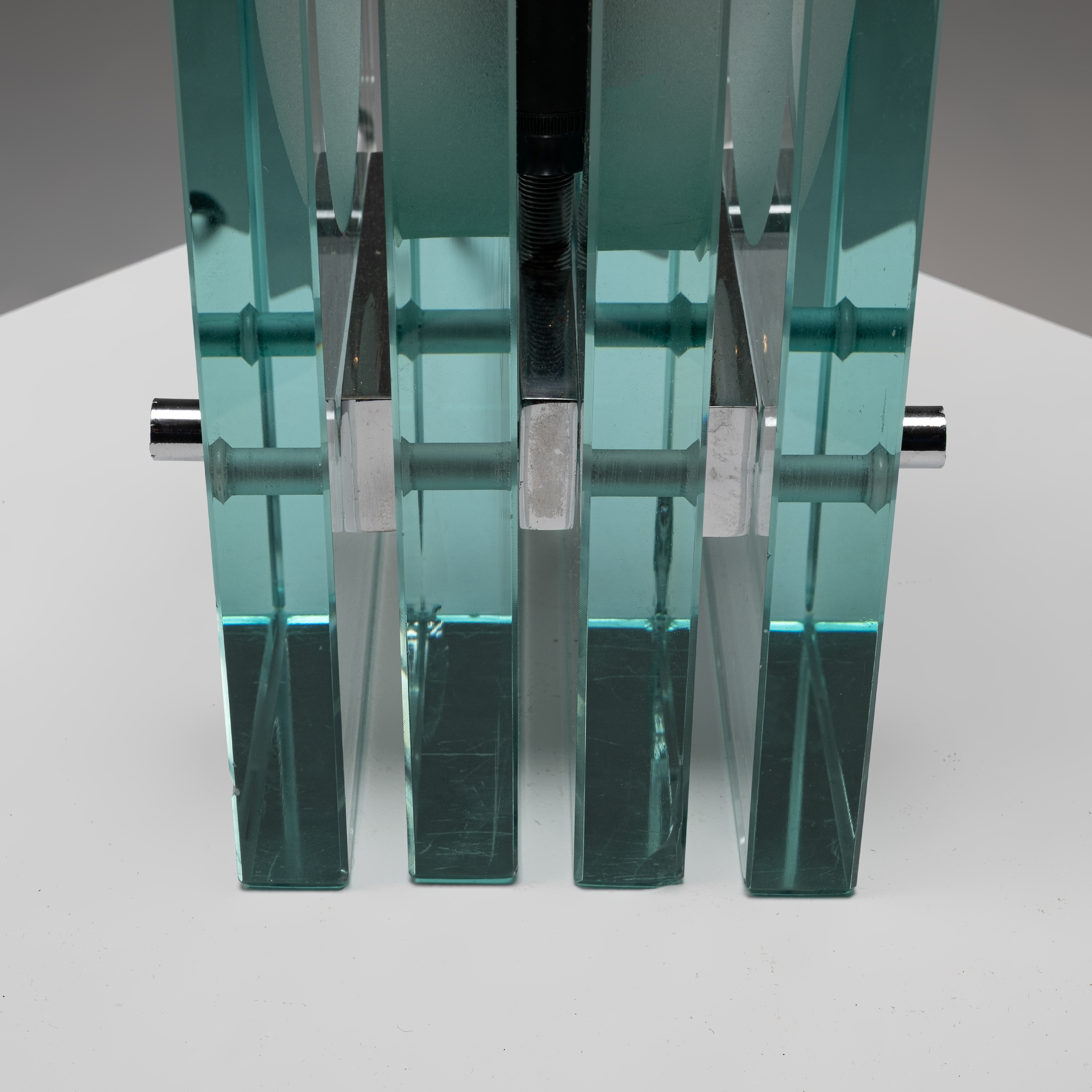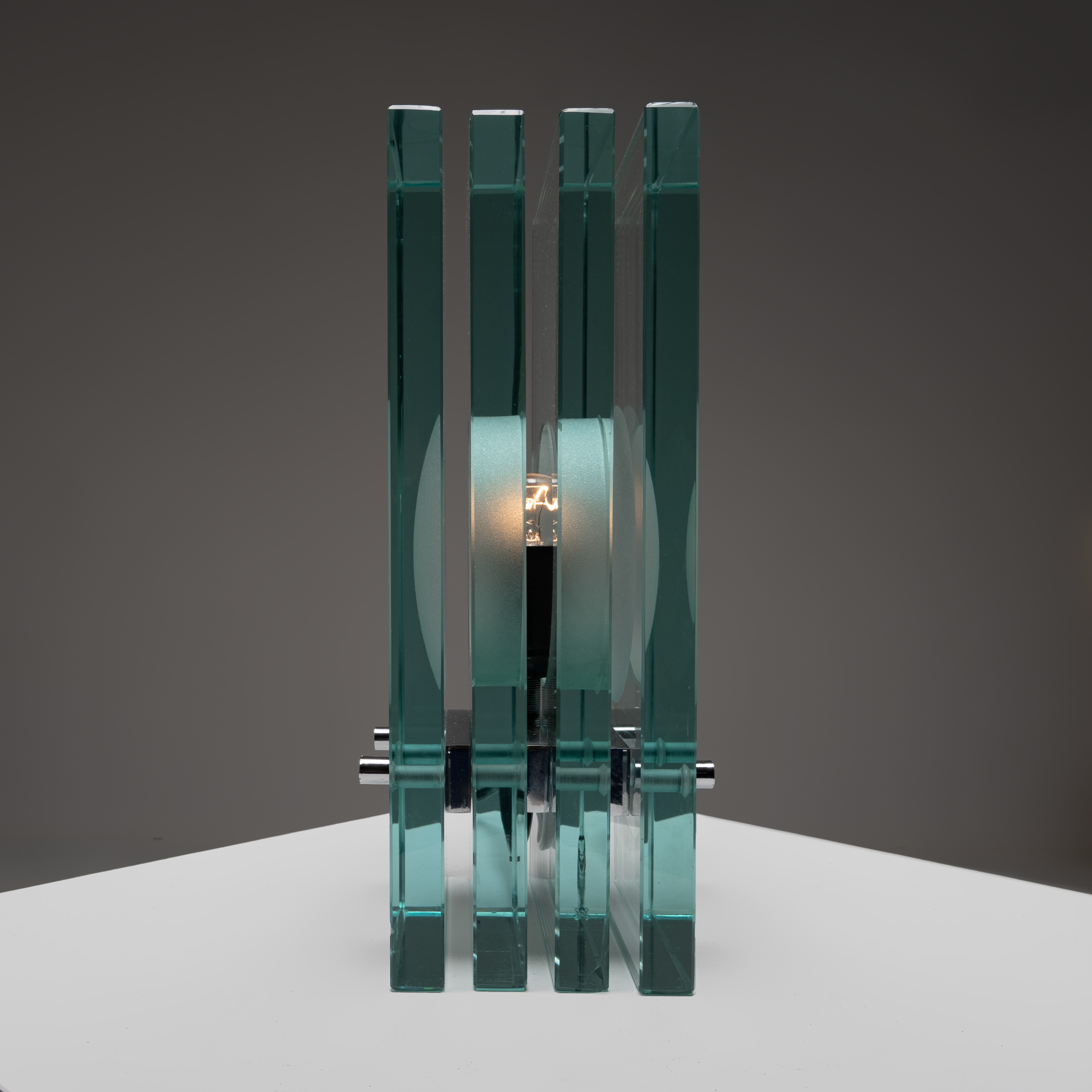 A refined example of Italian glass design from the 1970s, this table lamp by Giorgio Reggiori for Gallotti & Radice showcases a striking architectural composition. Vertical panels of thick, green-tinted glass frame a central frosted diffuser, creating a rhythmic interplay of transparency, depth, and light.