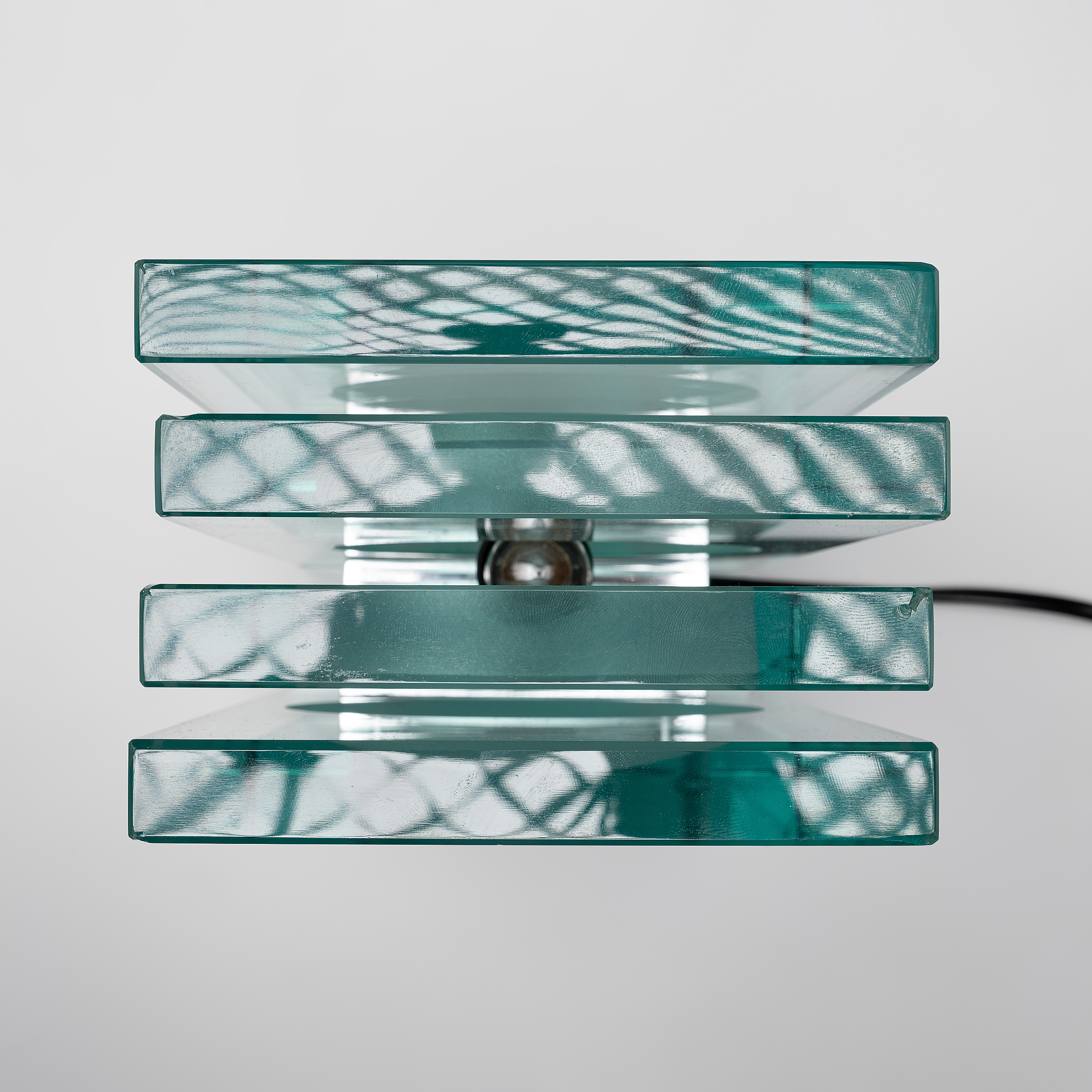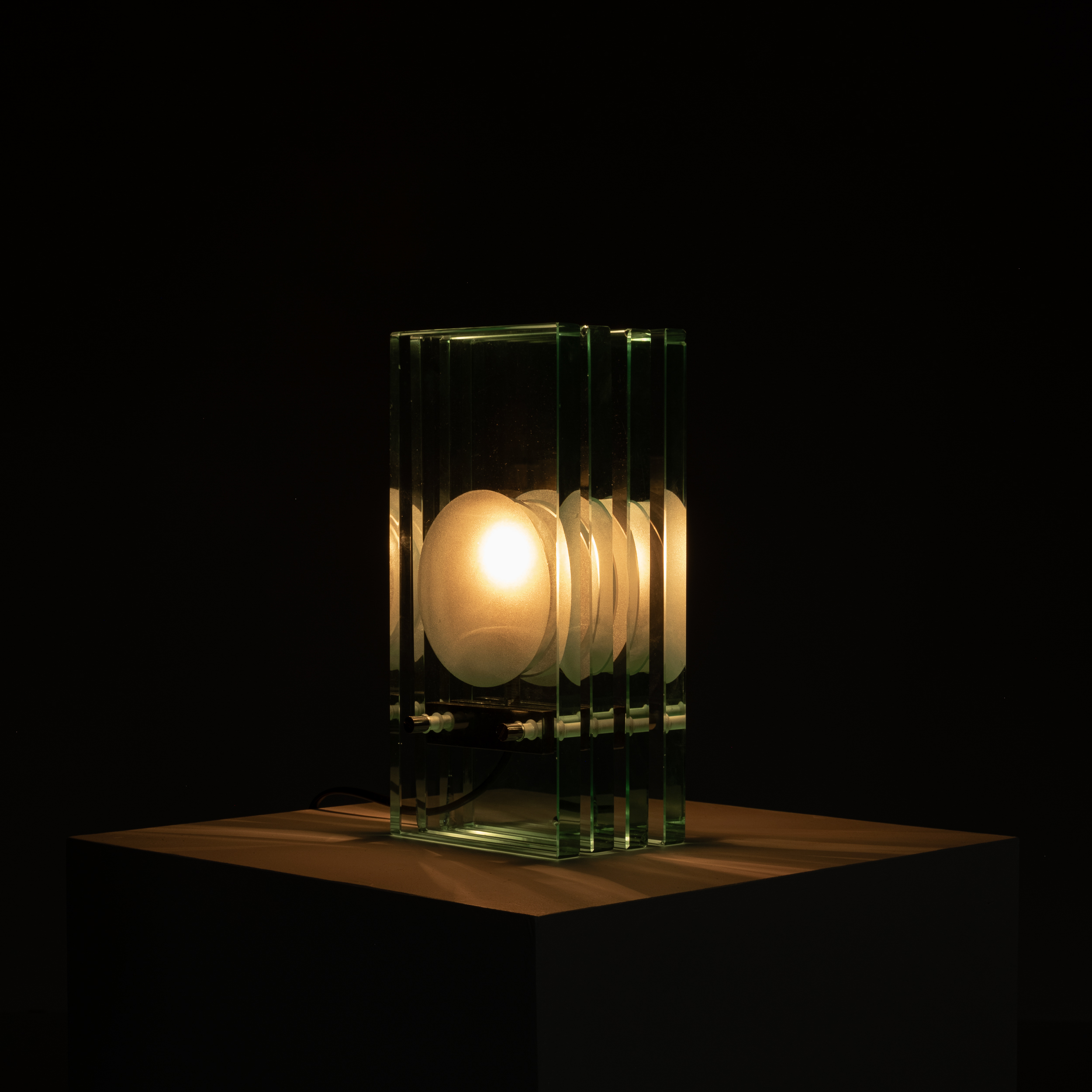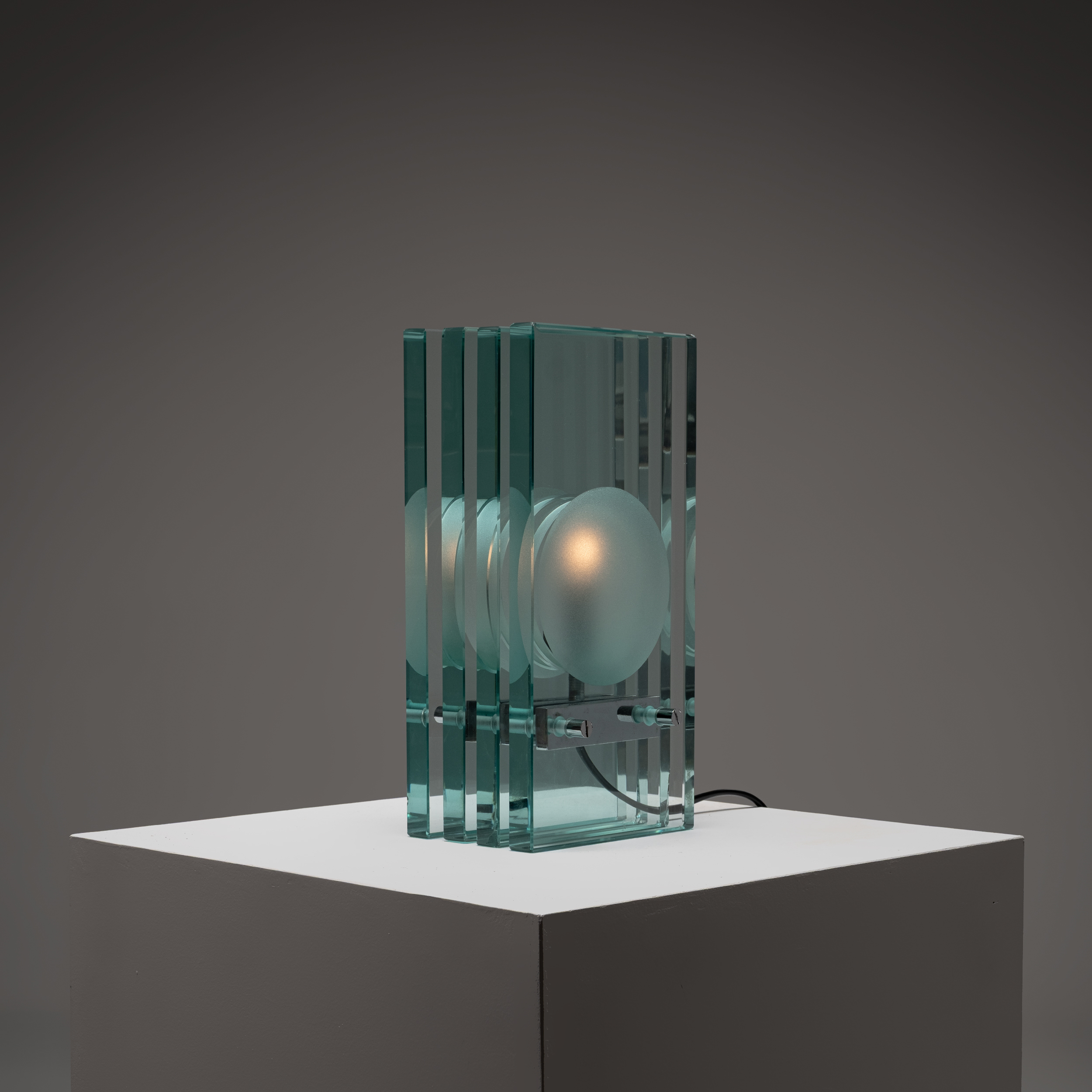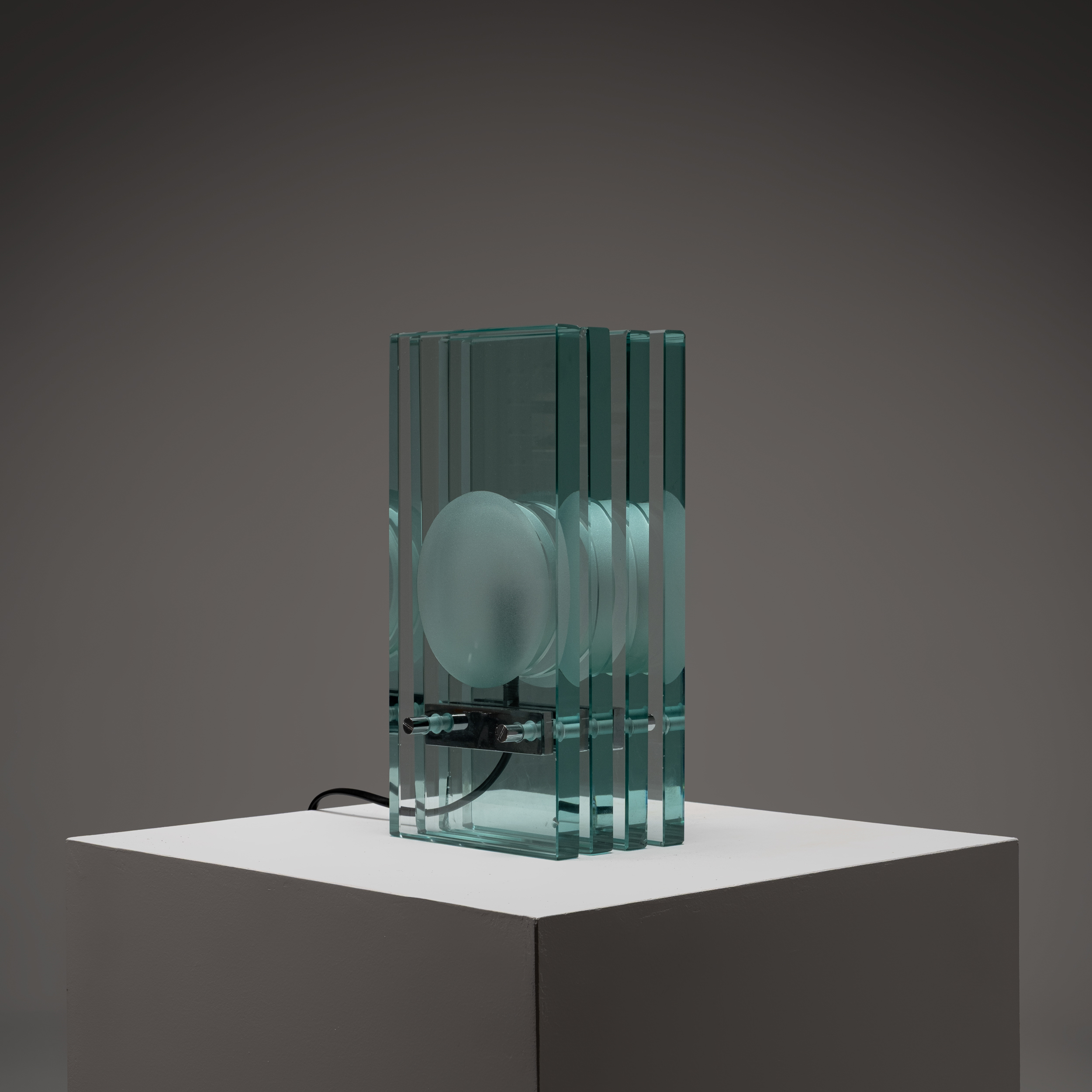 A refined example of Italian glass design from the 1970s, this table lamp by Giorgio Reggiori for Gallotti & Radice showcases a striking architectural composition. Vertical panels of thick, green-tinted glass frame a central frosted diffuser, creating a rhythmic interplay of transparency, depth, and light.