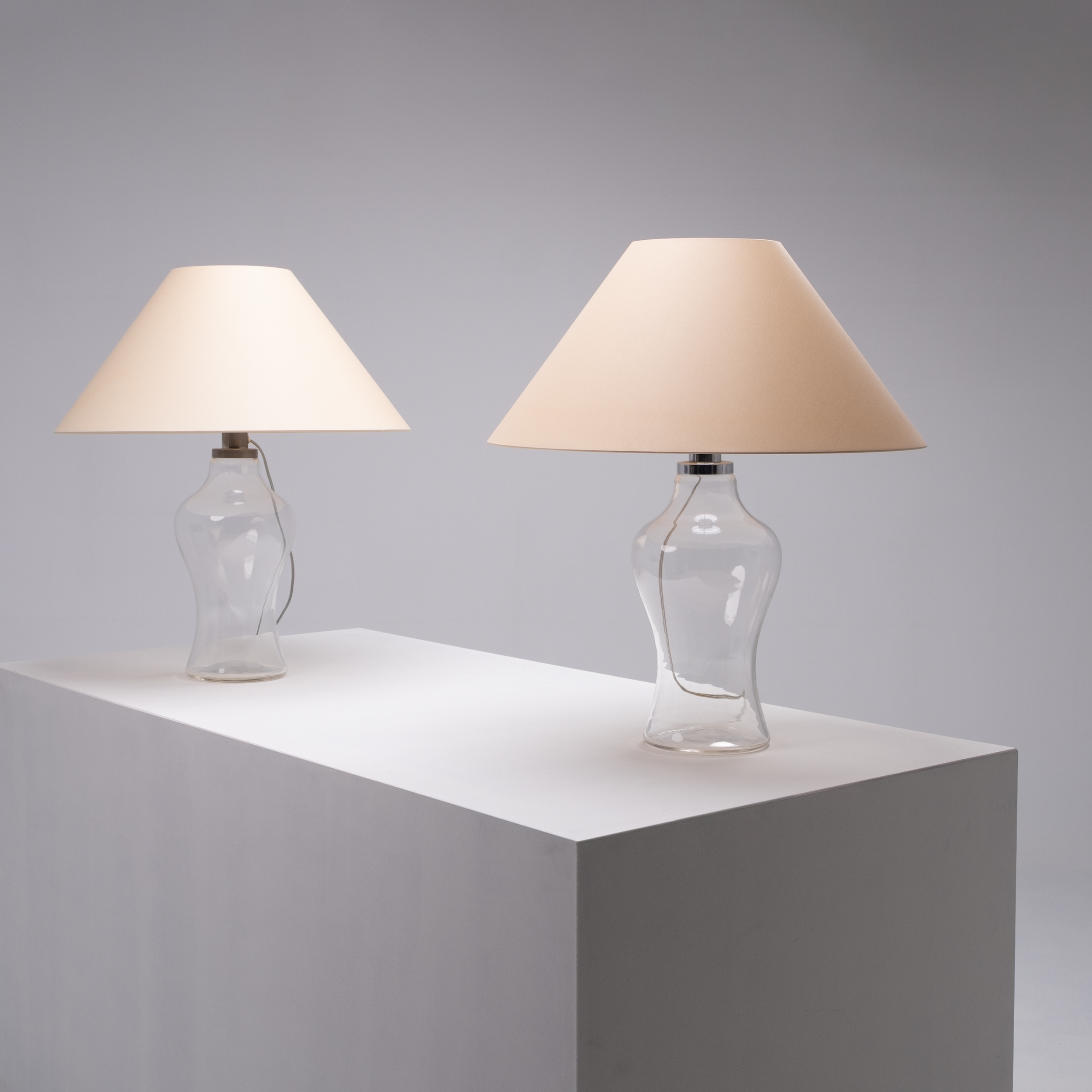 Designed by Ingo Maurer for DesignM in the 1970s, this elegant set of two table lamps exemplifies the designer’s refined sense of proportion and material harmony. Each lamp features a hand-blown clear glass base with soft, organic curves that subtly distort reflections and capture light in fluid form. Topped with a cream-colored fabric shade, the composition achieves a perfect visual balance, pure, understated, and timeless.