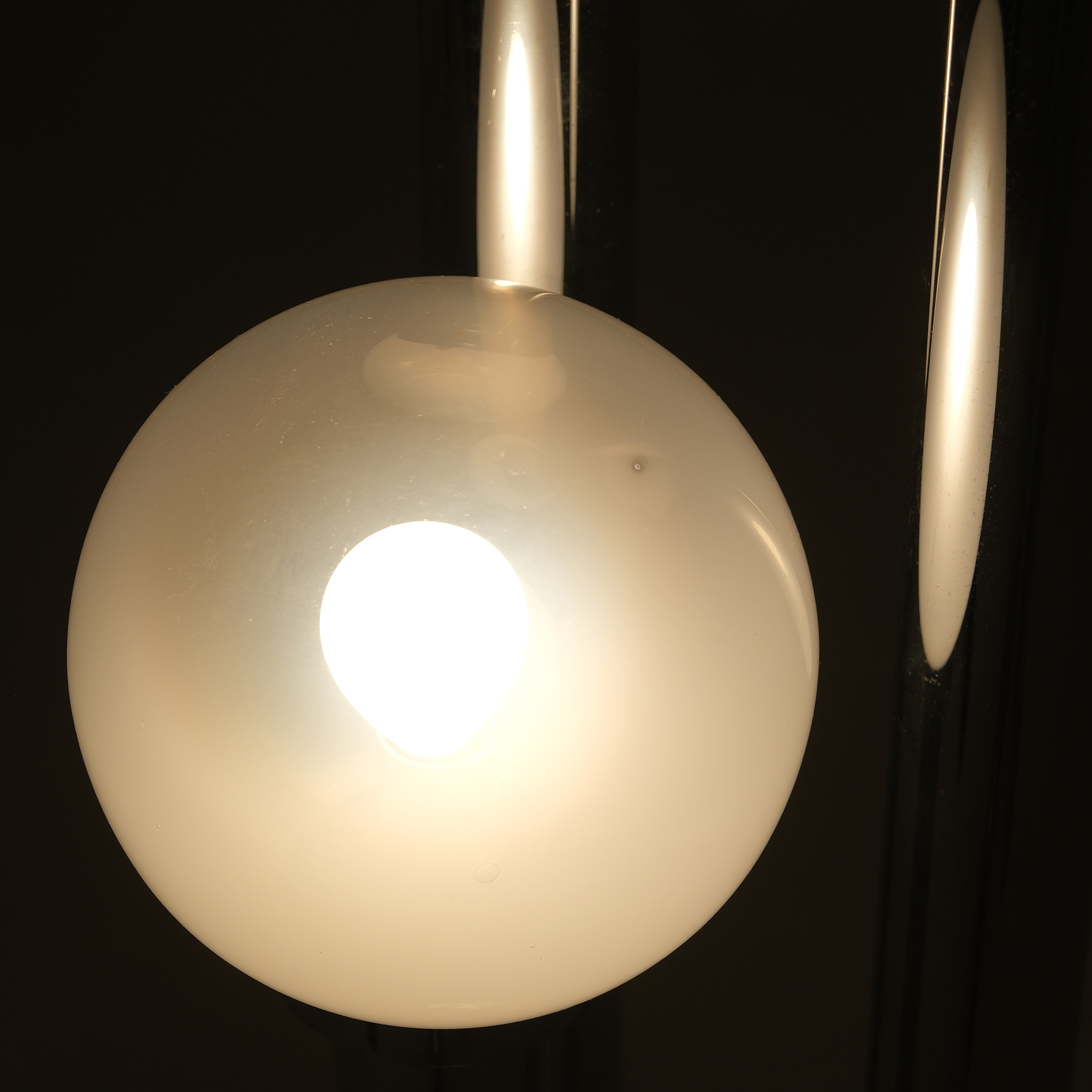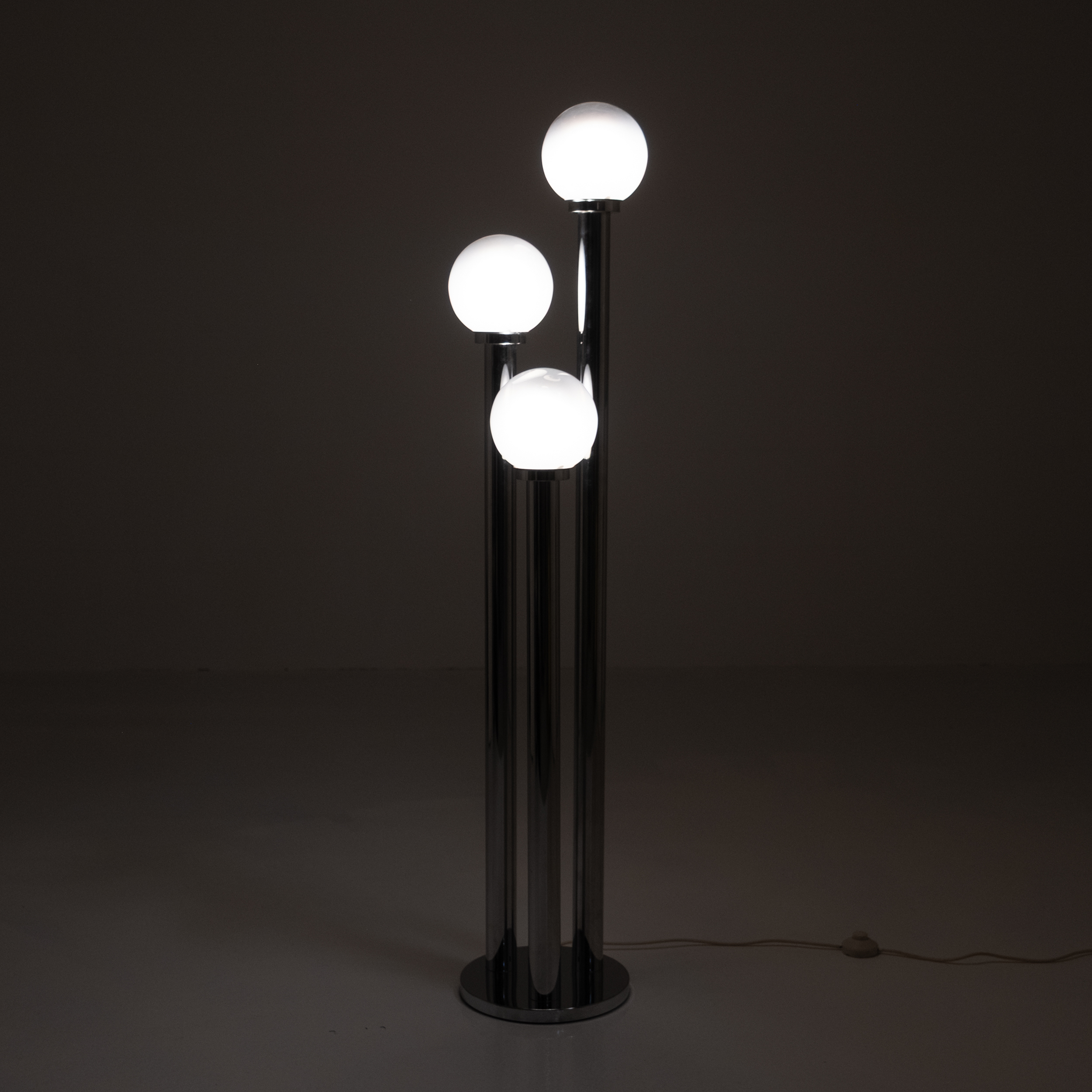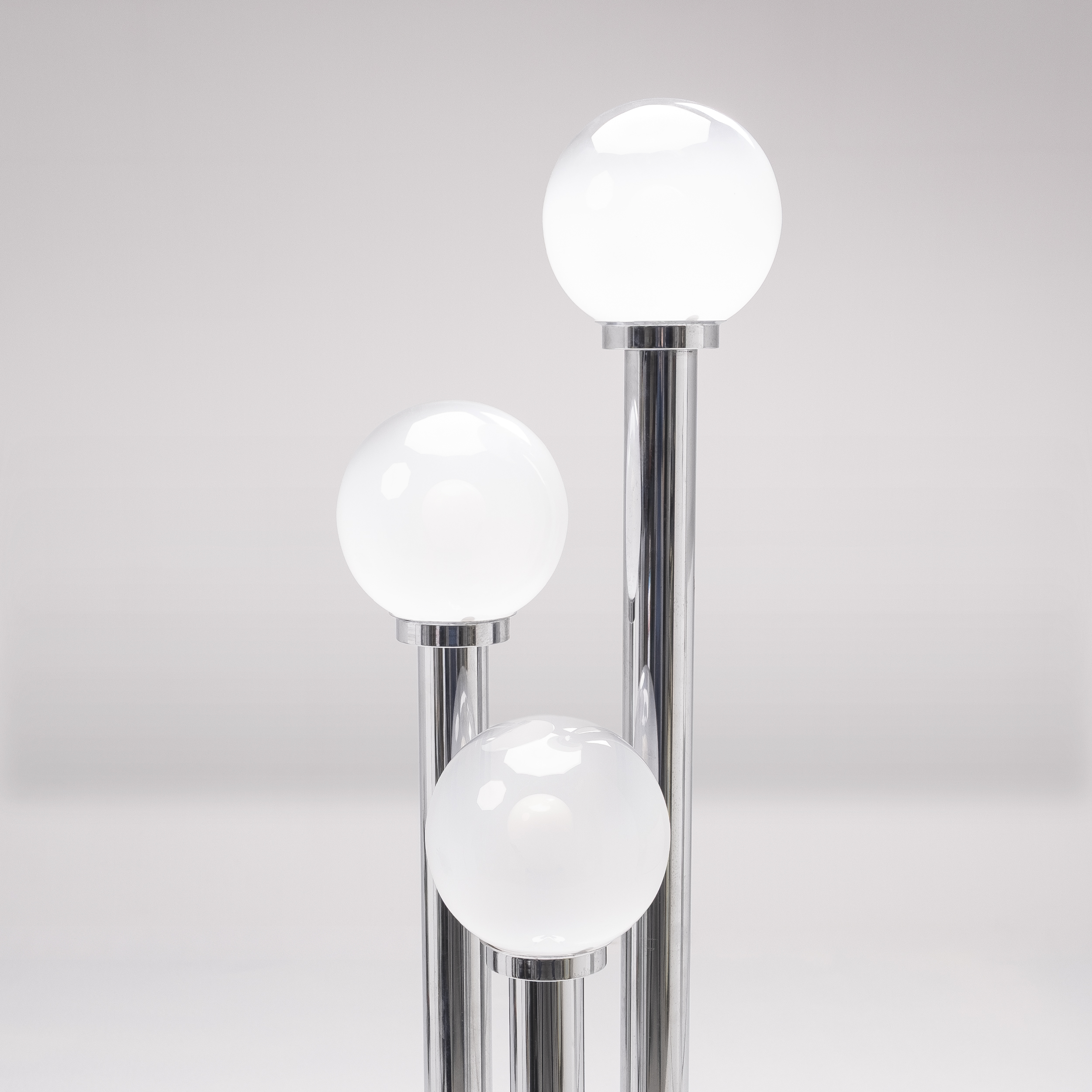 The chrome tubes rise from a circular base in varying heights, creating a dynamic rhythm of light. Each opaline glass diffuser emits a warm, soft glow, producing an ambient atmosphere that is both sculptural and serene. Whether illuminated or not, the piece stands as a testament to mid-century Italian craftsmanship and modernist sophistication.