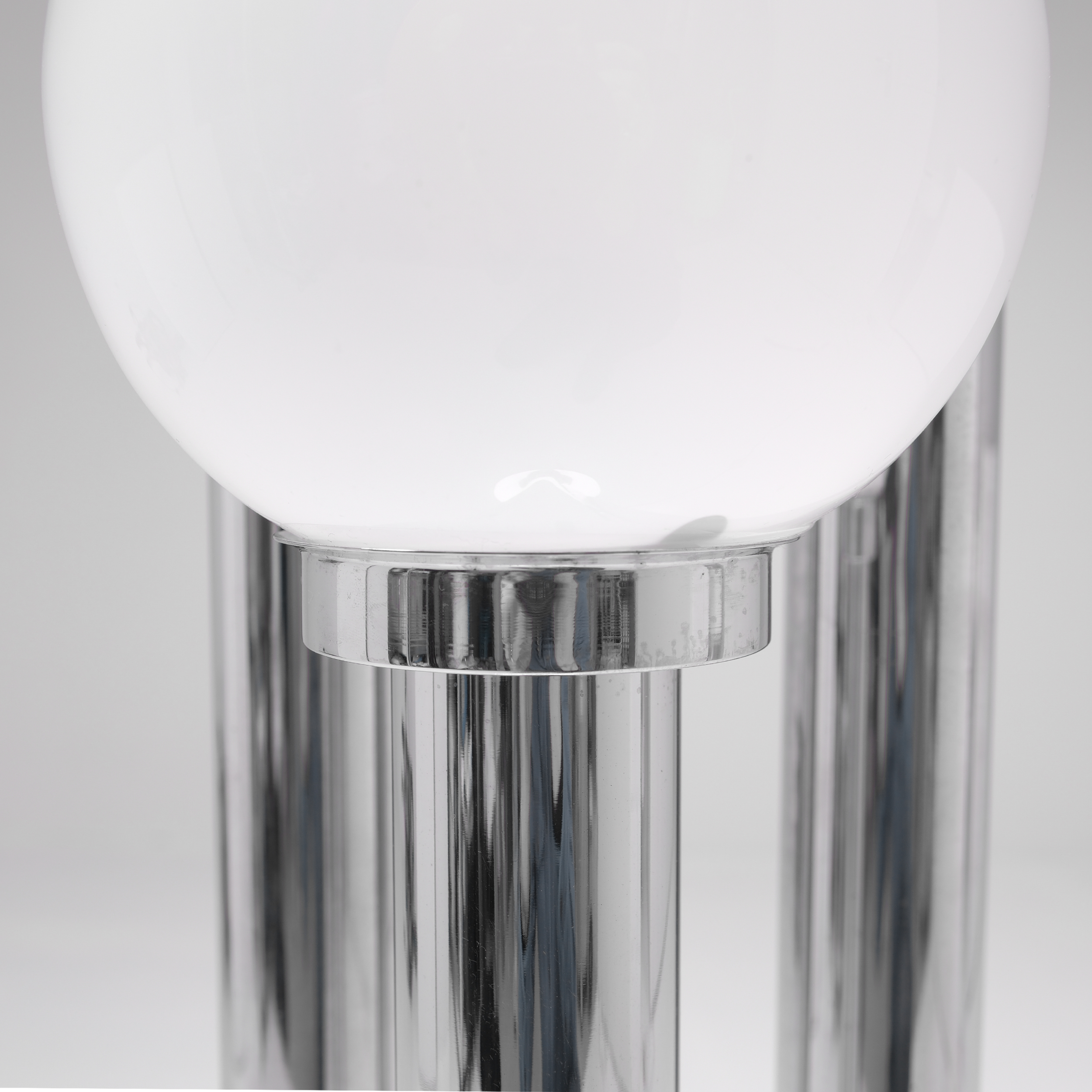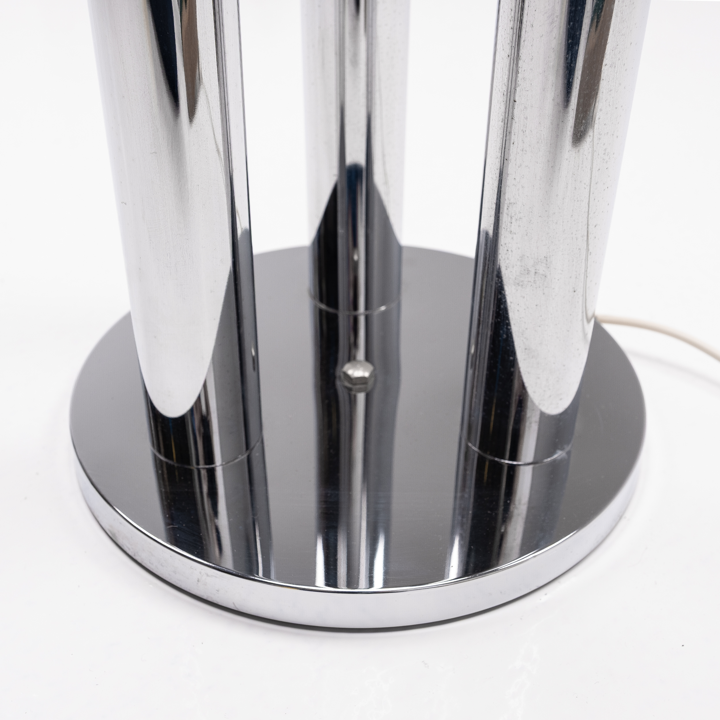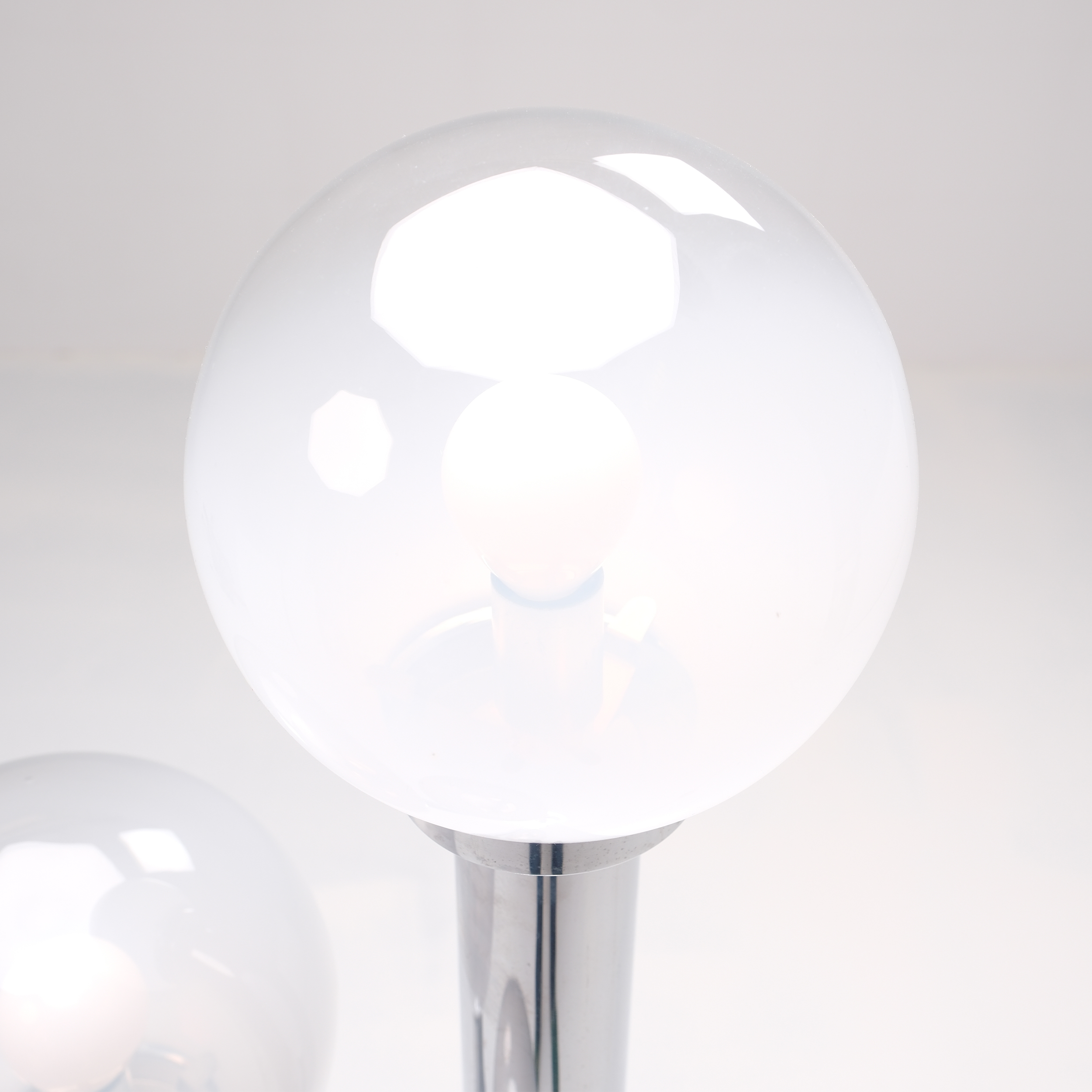 The chrome tubes rise from a circular base in varying heights, creating a dynamic rhythm of light. Each opaline glass diffuser emits a warm, soft glow, producing an ambient atmosphere that is both sculptural and serene. Whether illuminated or not, the piece stands as a testament to mid-century Italian craftsmanship and modernist sophistication.