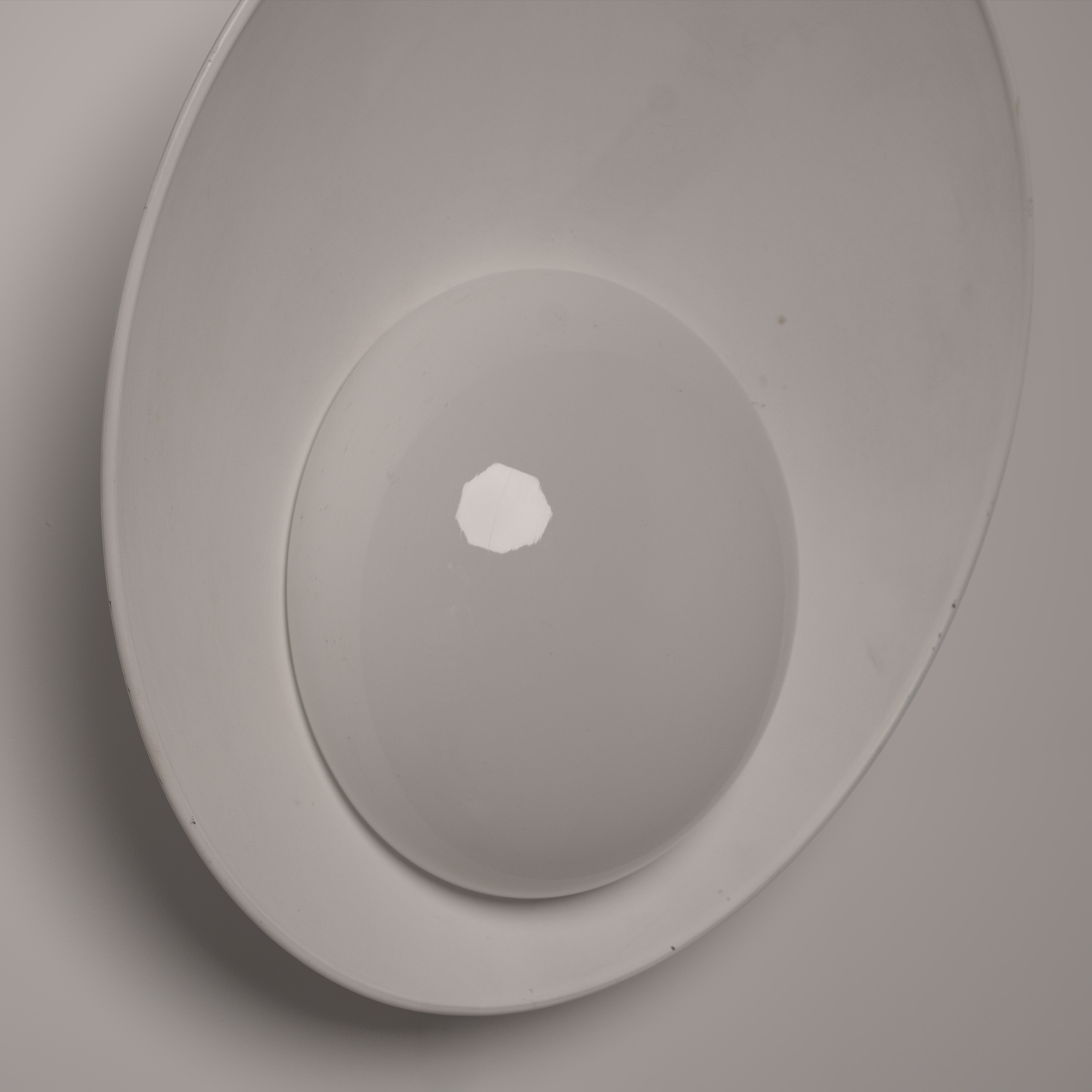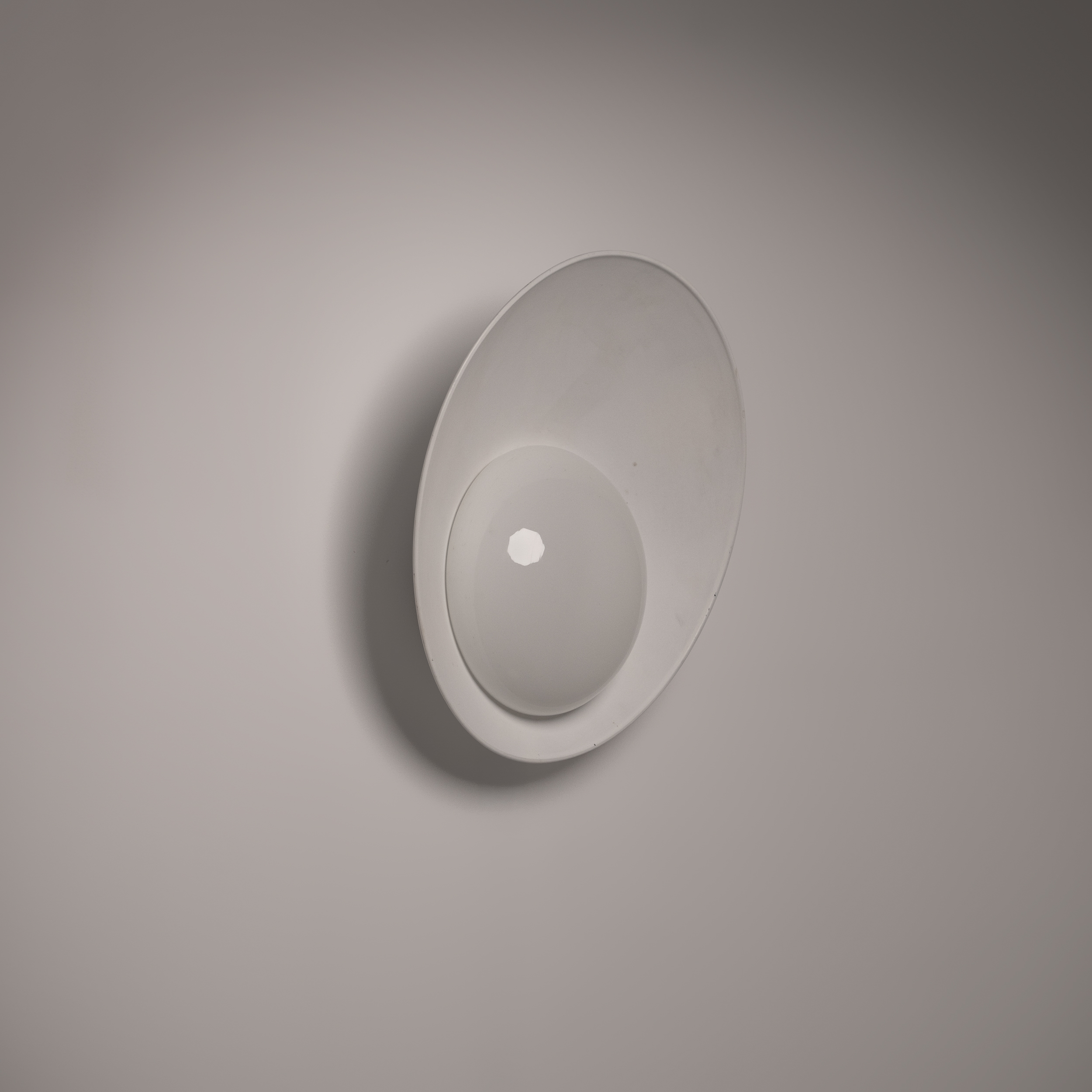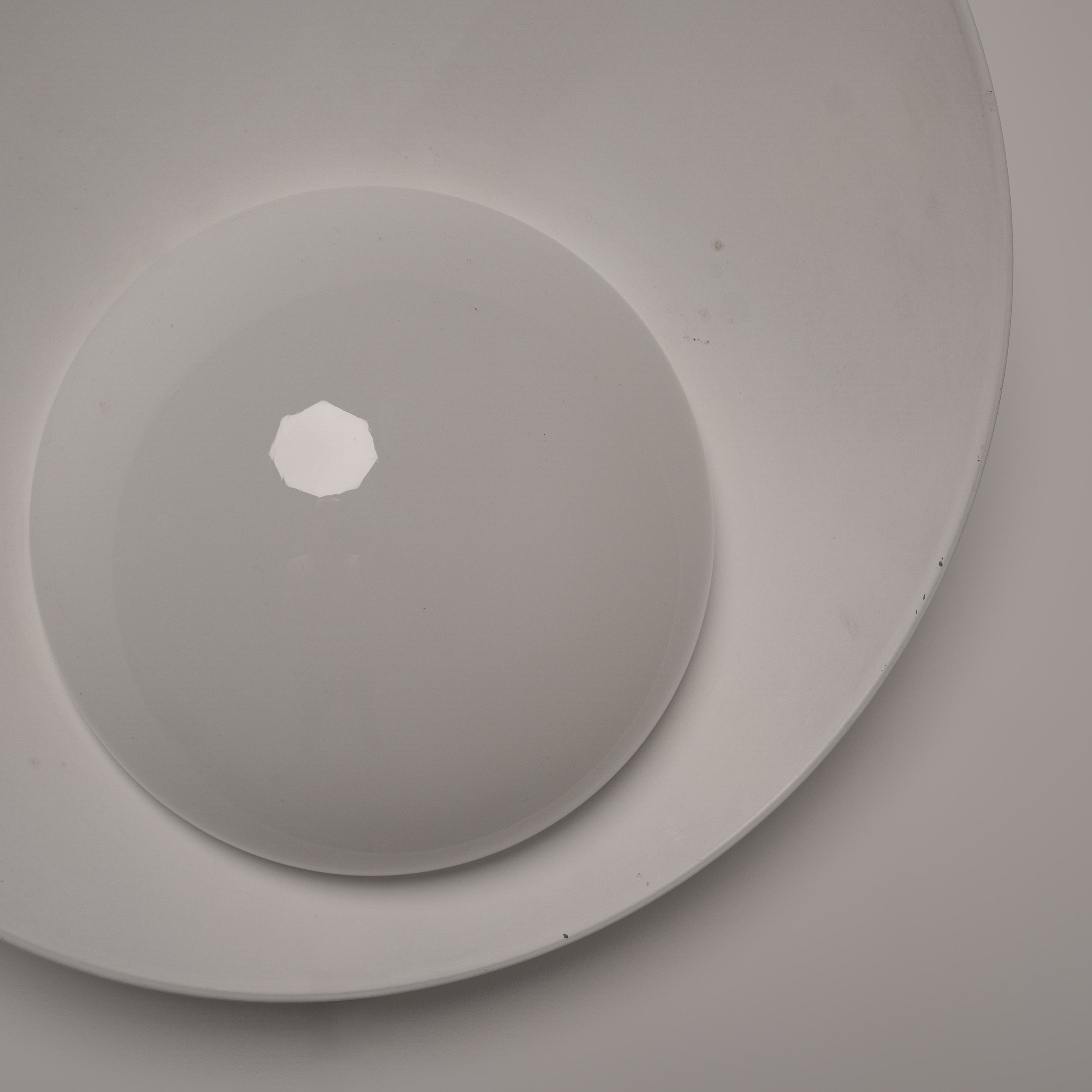 The design features a broad, concave painted metal reflector paired with a white opaline glass diffuser, delivering soft, glare-free light suited to both public and residential interiors. The generous scale and pared-back expression epitomise early Danish modern lighting — timeless, utilitarian and refined.