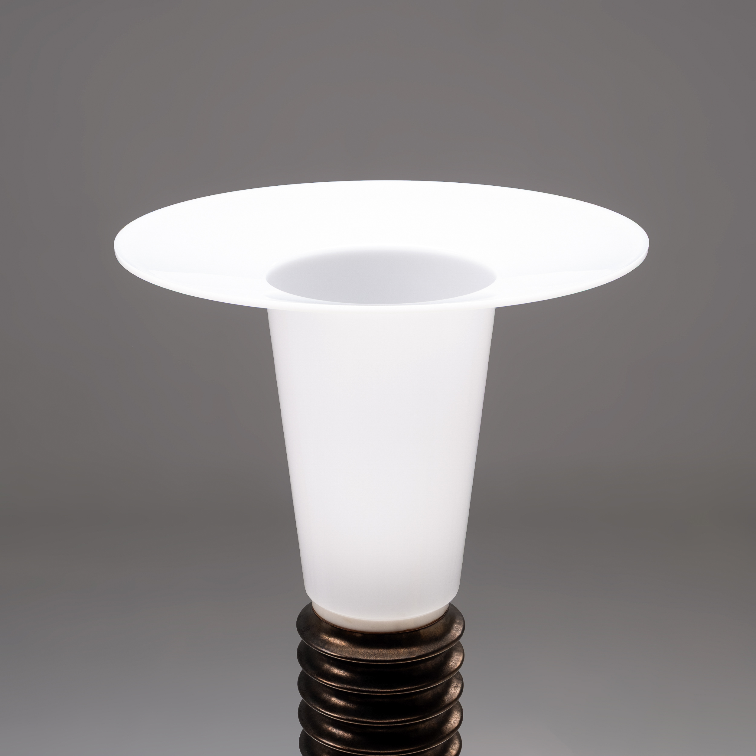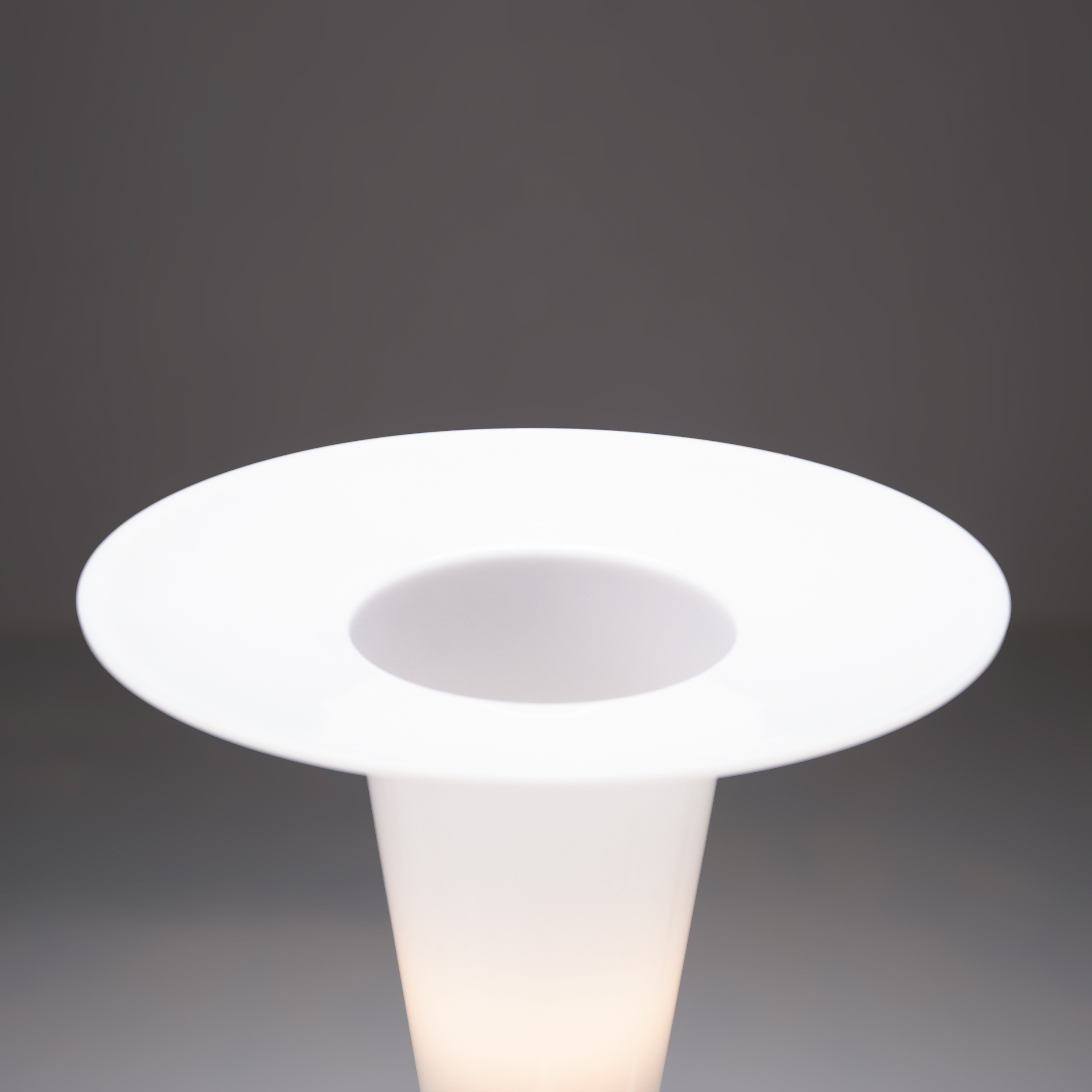 Each lamp features a striking contrast between the tapered acrylic shade and the robust cylindrical ceramic base. The result is a bold yet balanced silhouette,architectural, almost industrial, yet softened by the diffused glow of the white acrylic. Whether illuminated or not, the lamps read as sculptural objects with a strong visual presence.