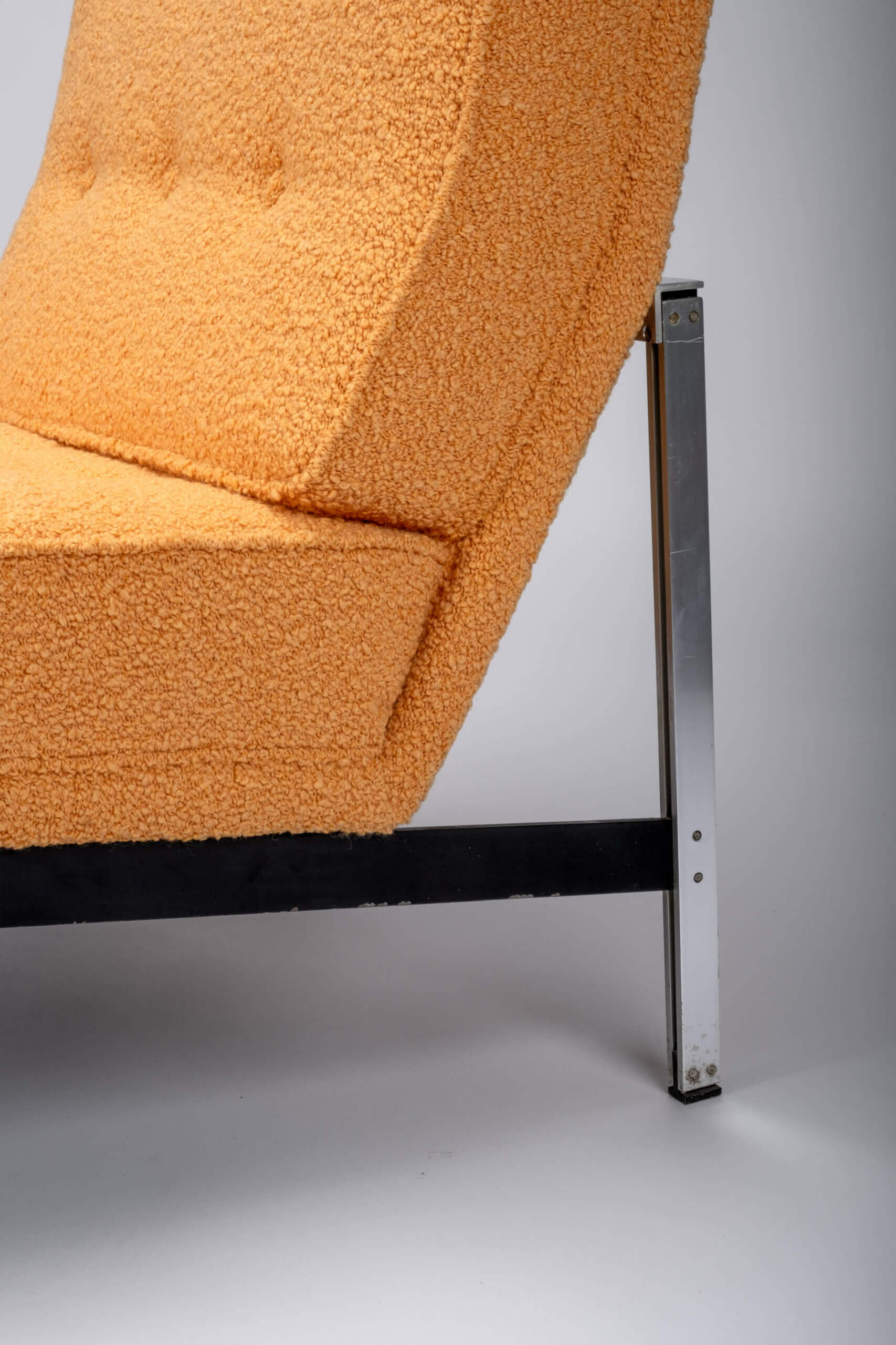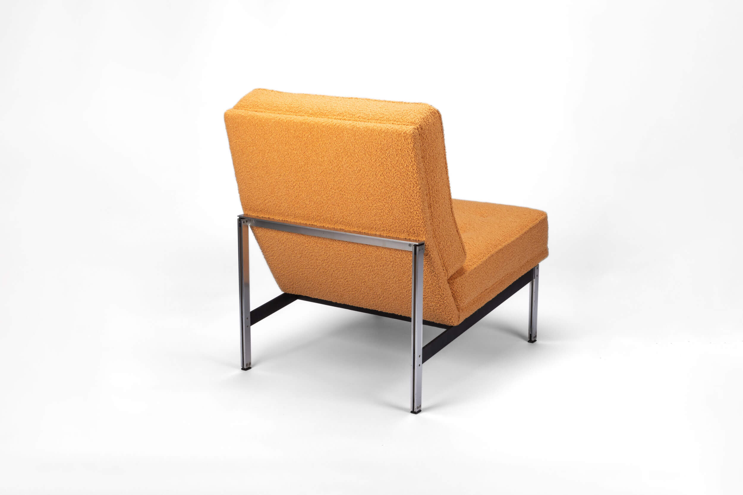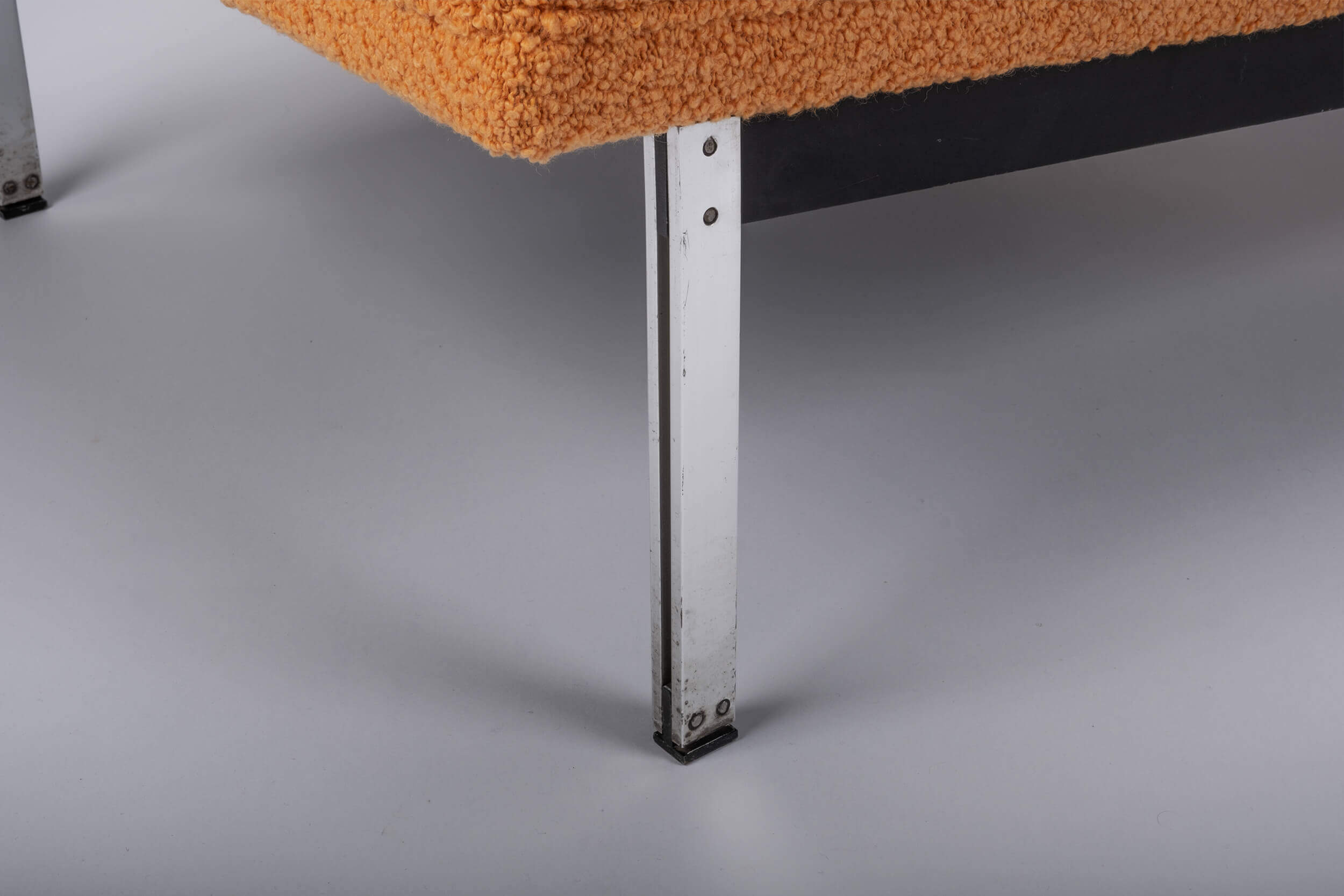 Orange is the new black! This classic original design for Knoll Inc. got quite a transformation. This piece is fully reupholstered from the tensioning straps to the foam interior. The high-end, padded fabric on both cushions emphasizes the square-shaped model.