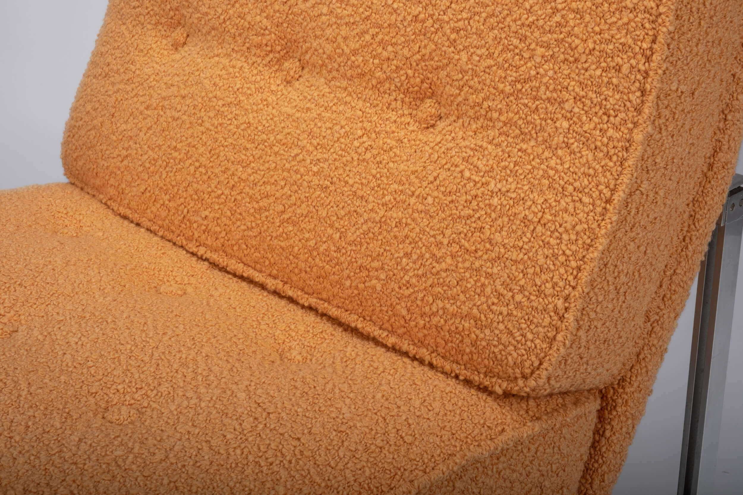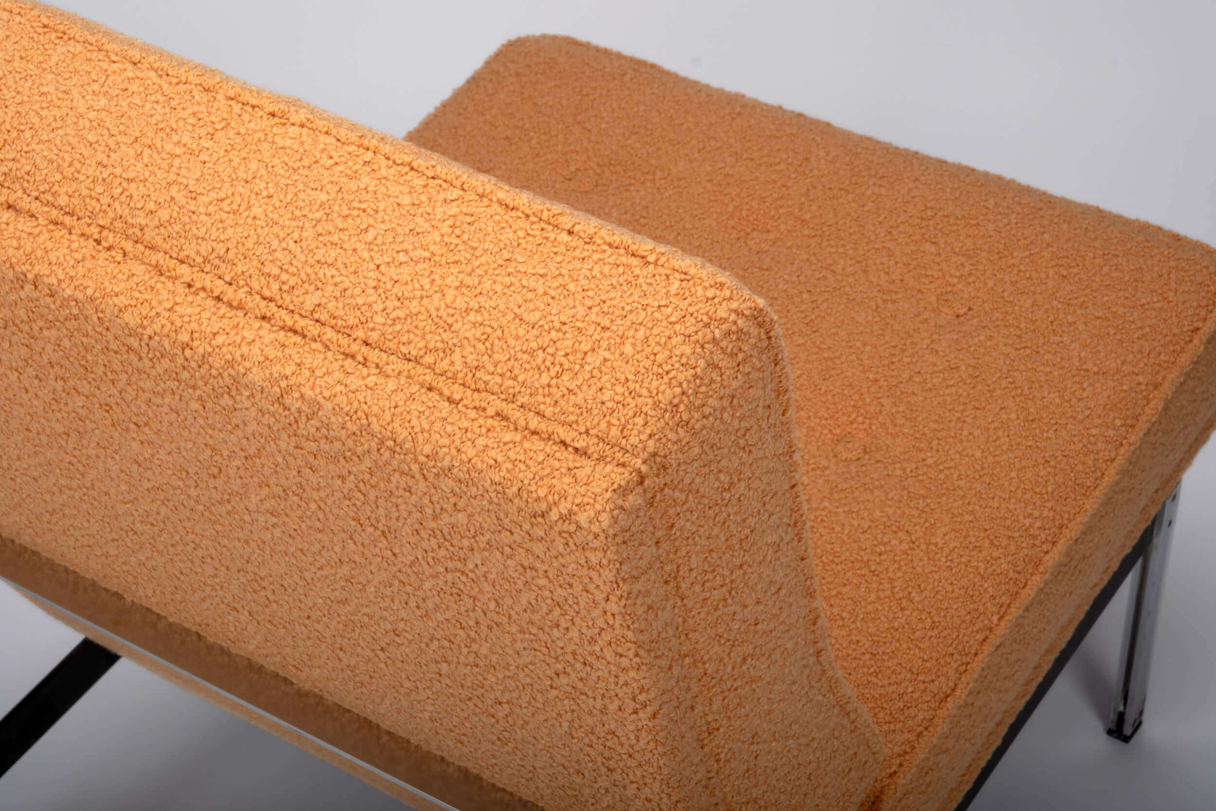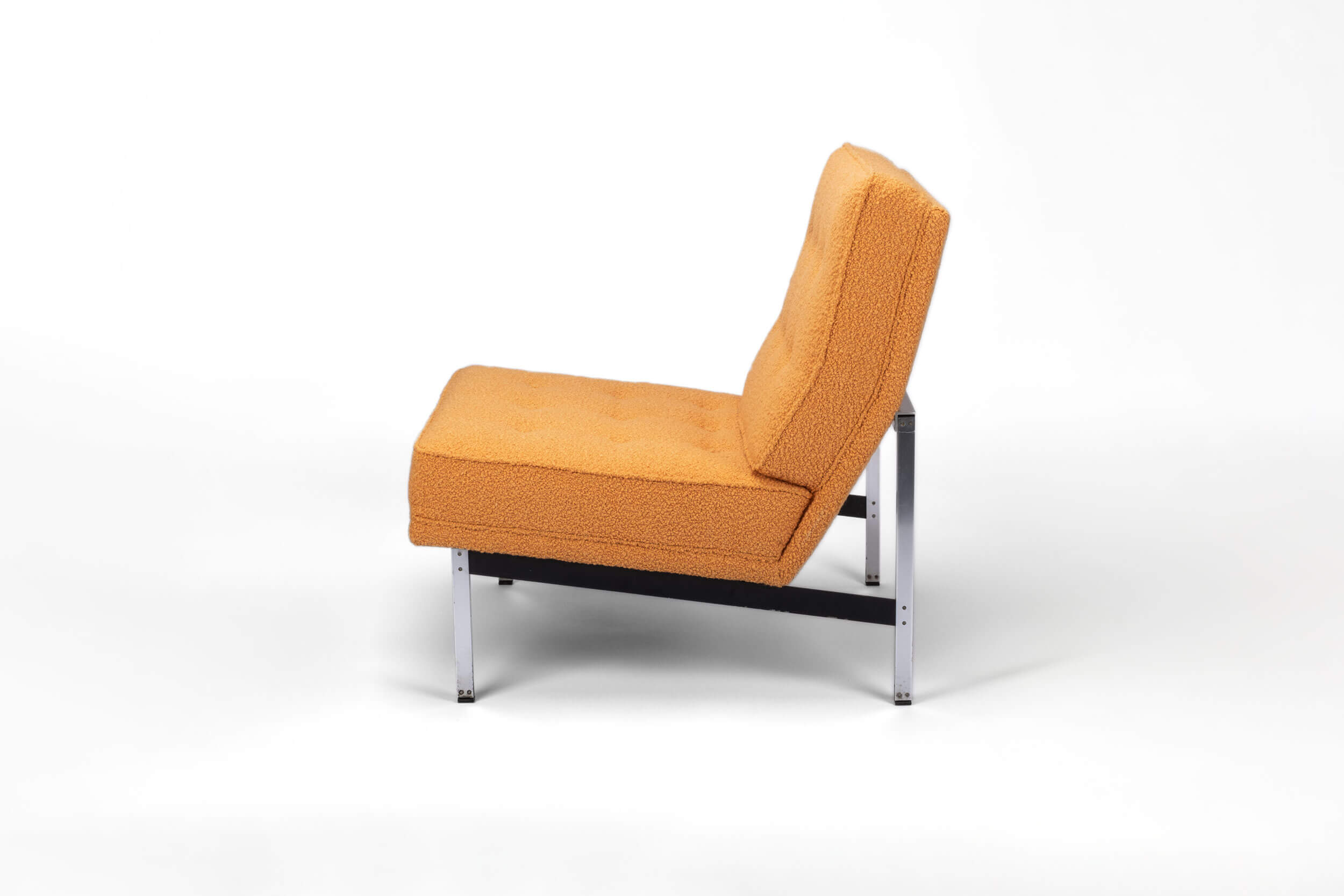 Orange is the new black! This classic original design for Knoll Inc. got quite a transformation. This piece is fully reupholstered from the tensioning straps to the foam interior. The high-end, padded fabric on both cushions emphasizes the square-shaped model.