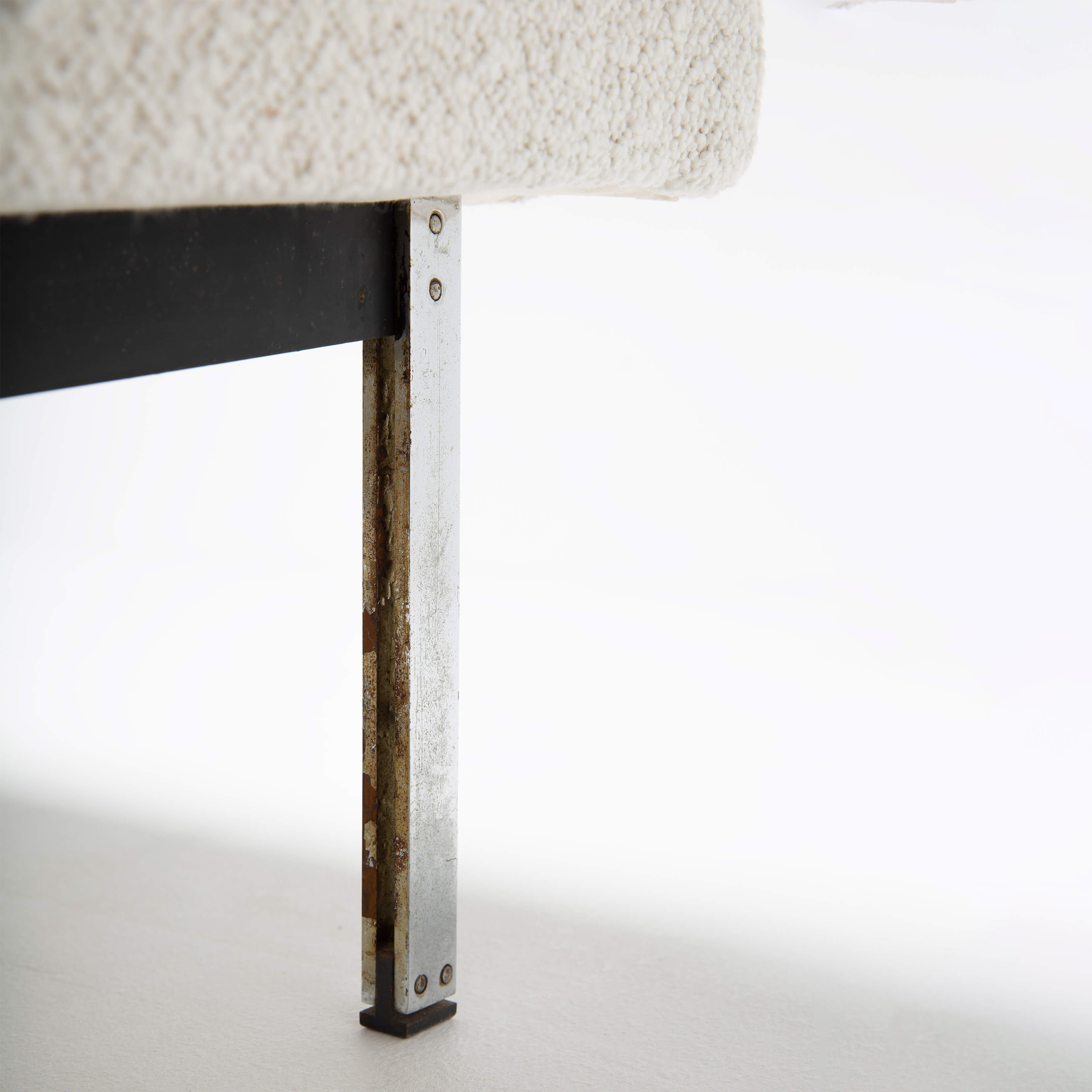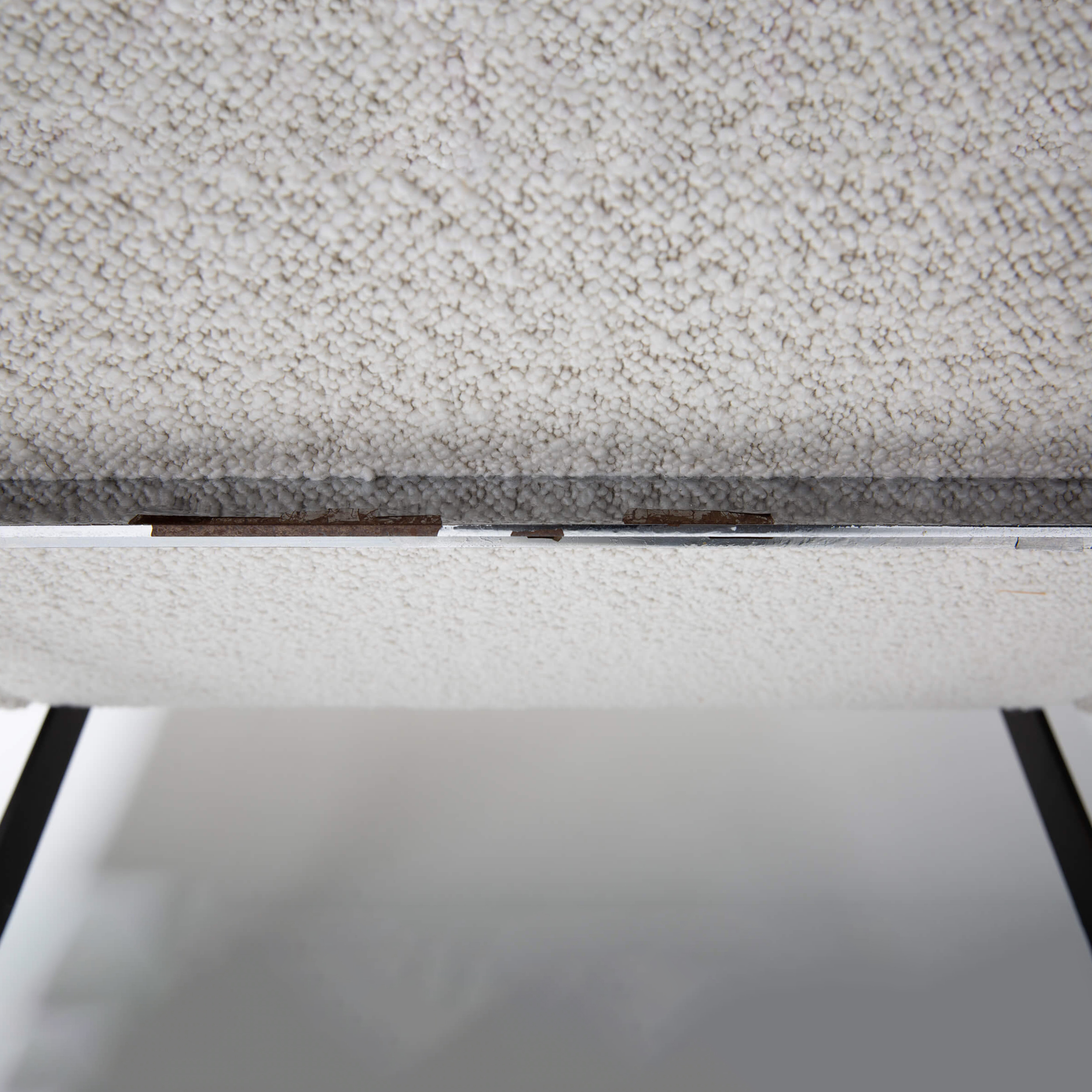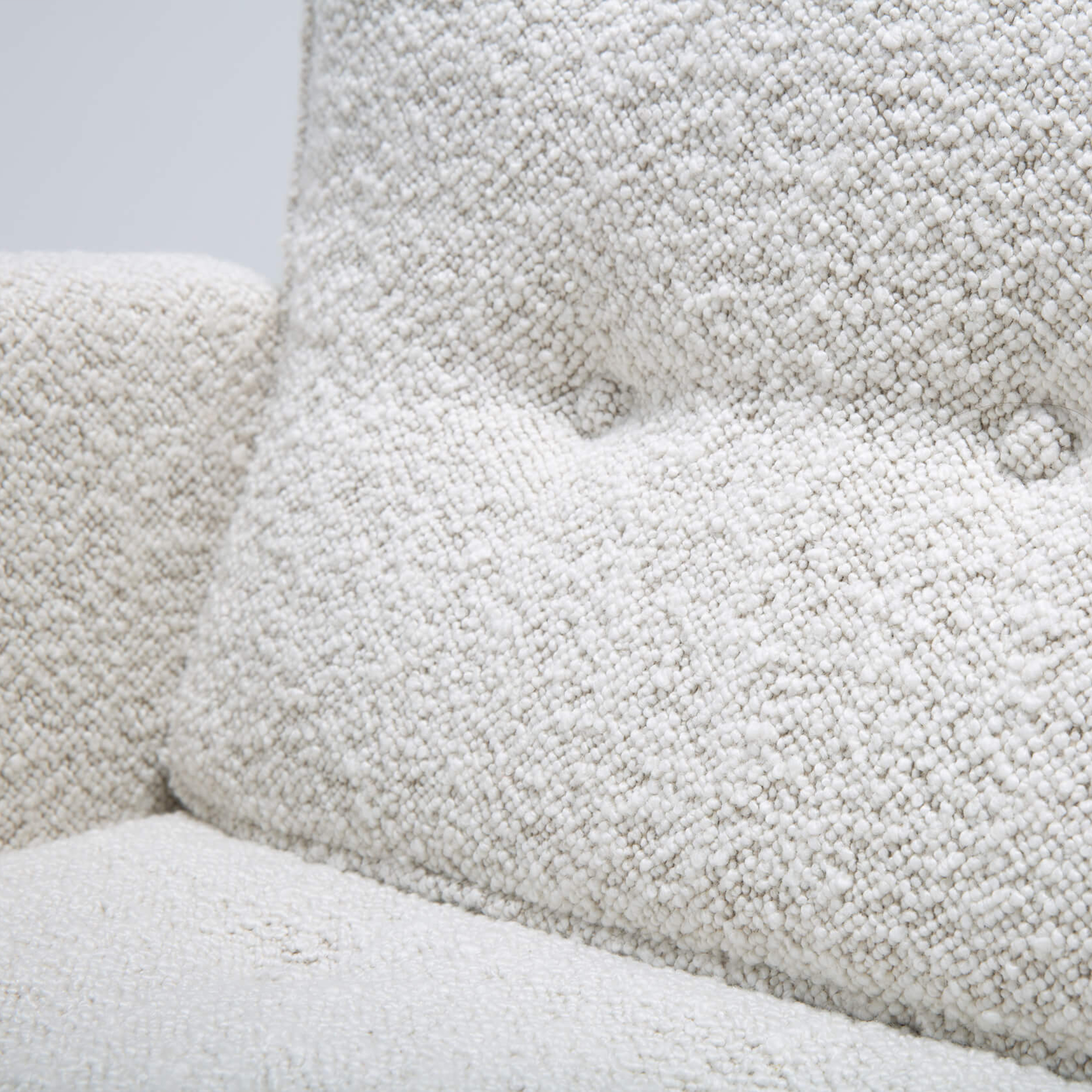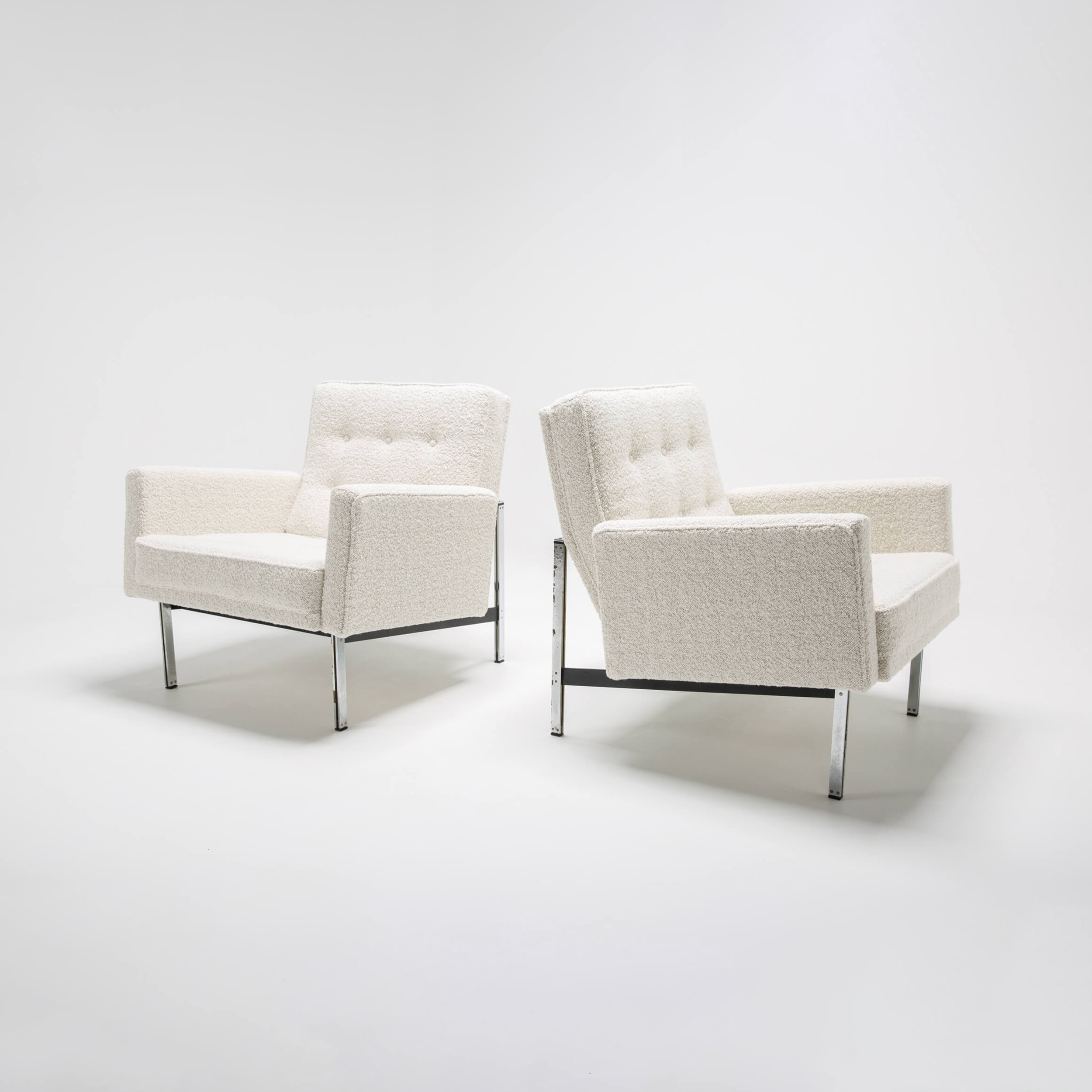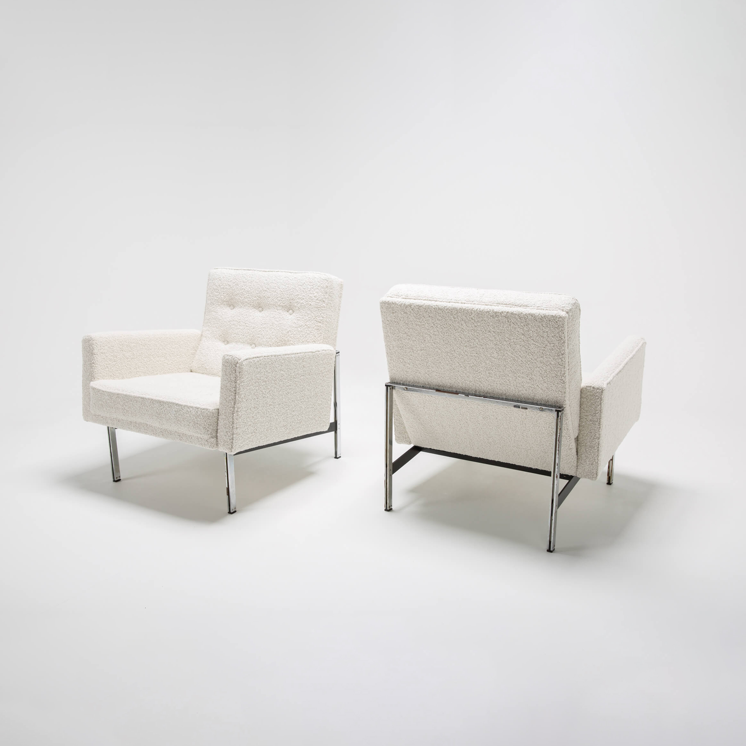 This set of timeless armchairs is the perfect example of comfort without compromising design. Reupholstered in a soft, plush, off-white bouclé fabric, it is irresistible. In addition, the geometric shape maintains its aesthetic to fit contemporary interiors.