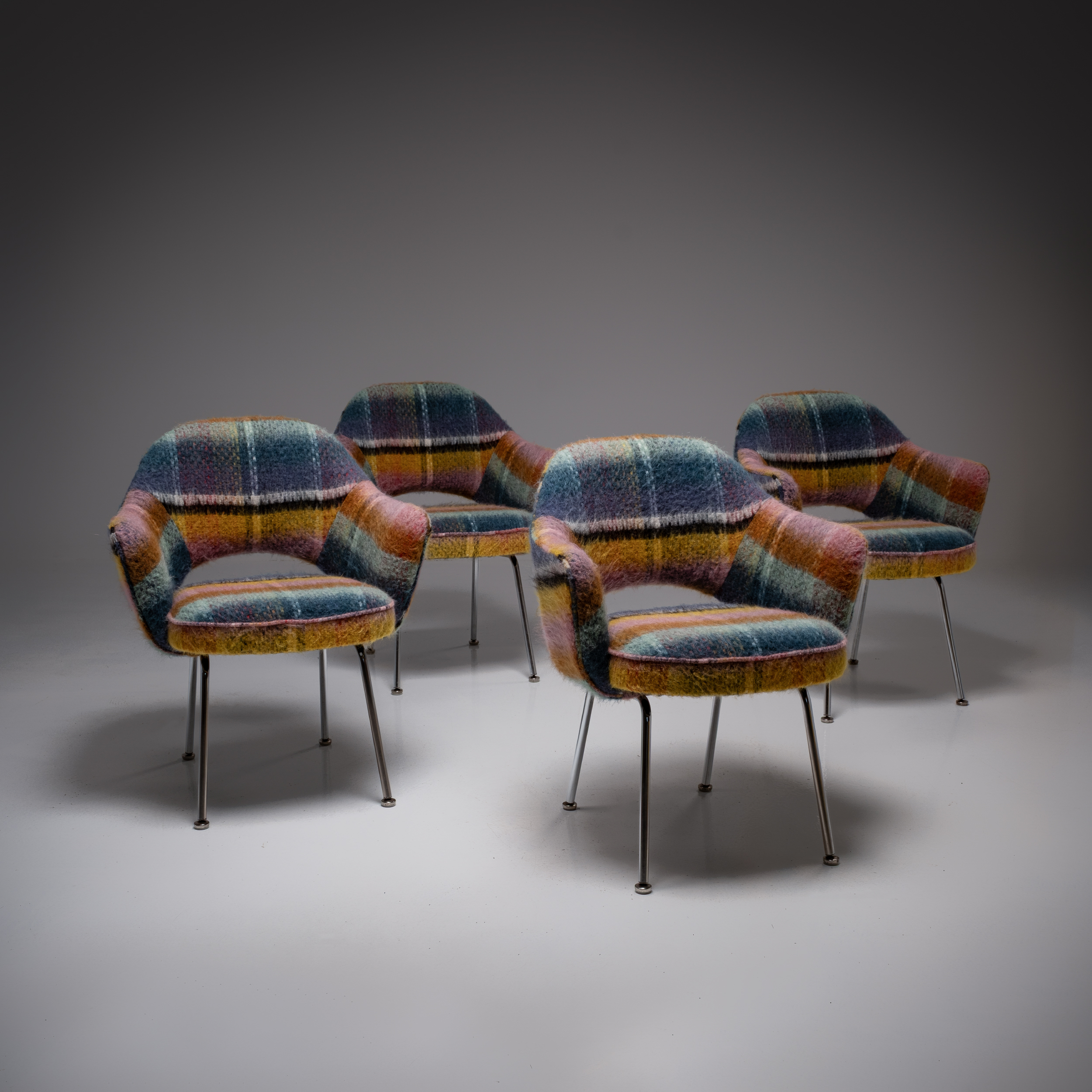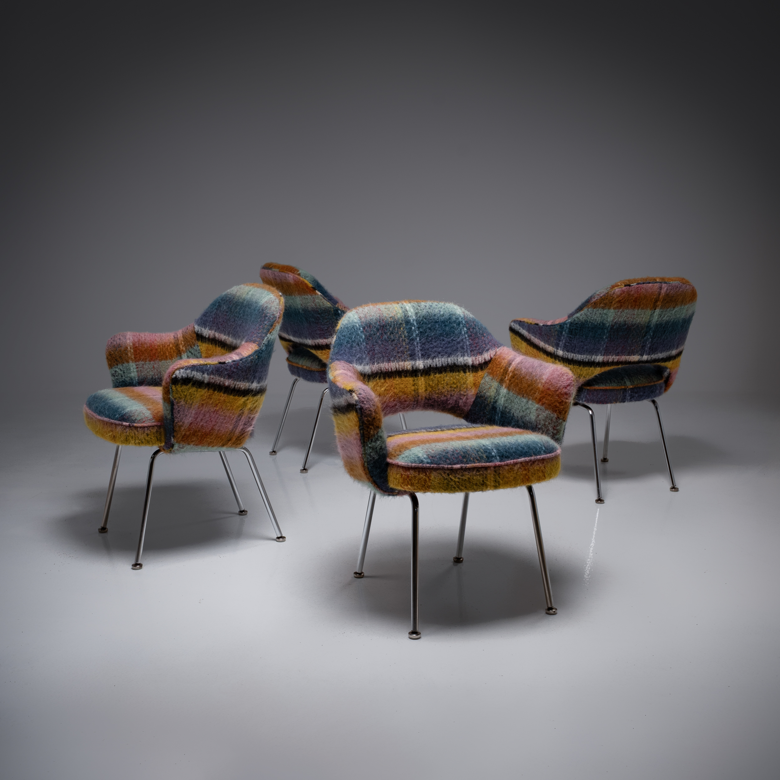 This particular set stands out through its rich, tactile upholstery, newly executed in a luxurious Pierre Frey fabric, composed of mohair, alpaca, and wool. The vibrant, almost painterly interplay of colours enhances the chair’s organic form, adding depth, warmth, and a subtle sense of movement. Beneath, the original chromed steel base provides a crisp, architectural counterpoint, grounding the design with lightness, and strength.