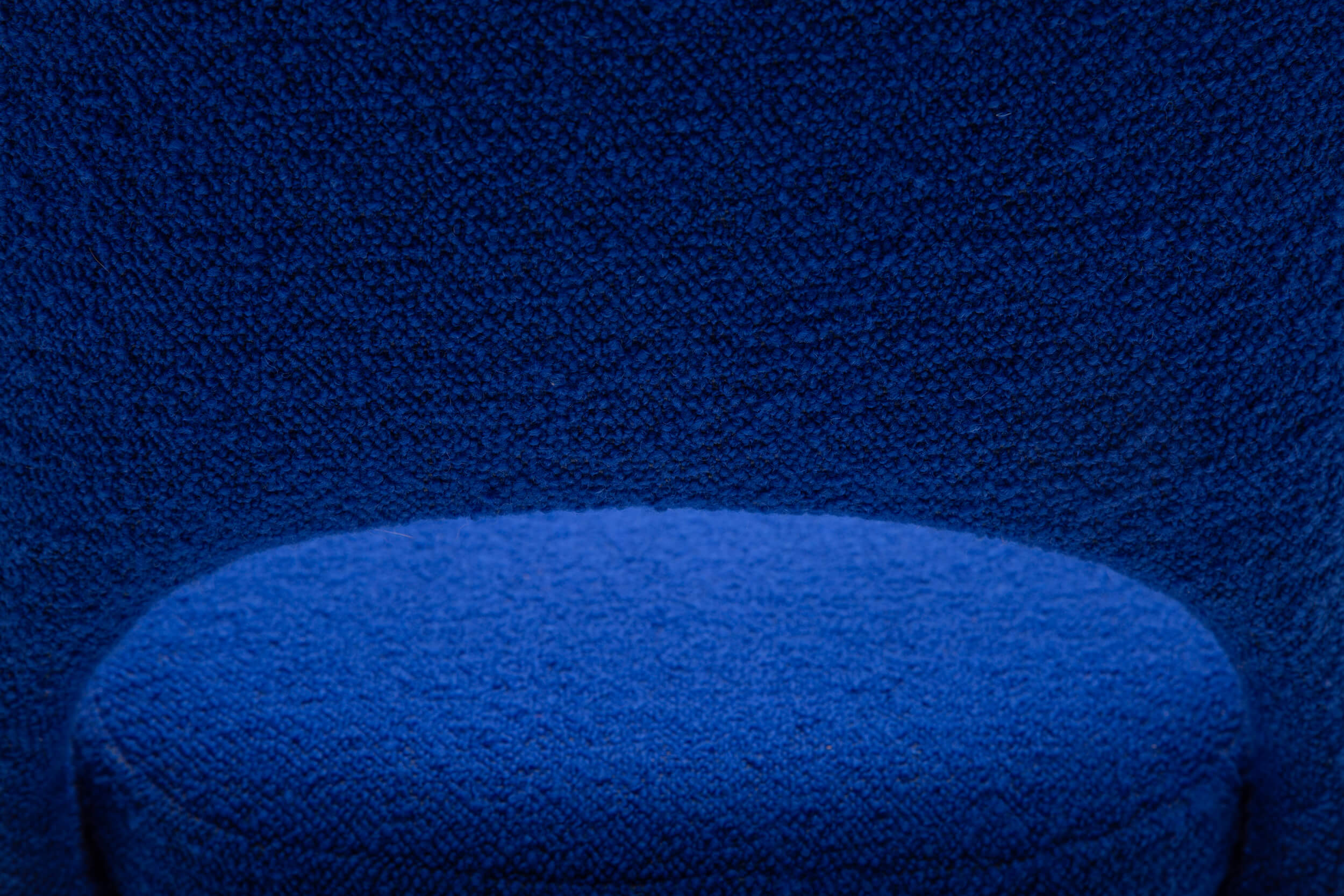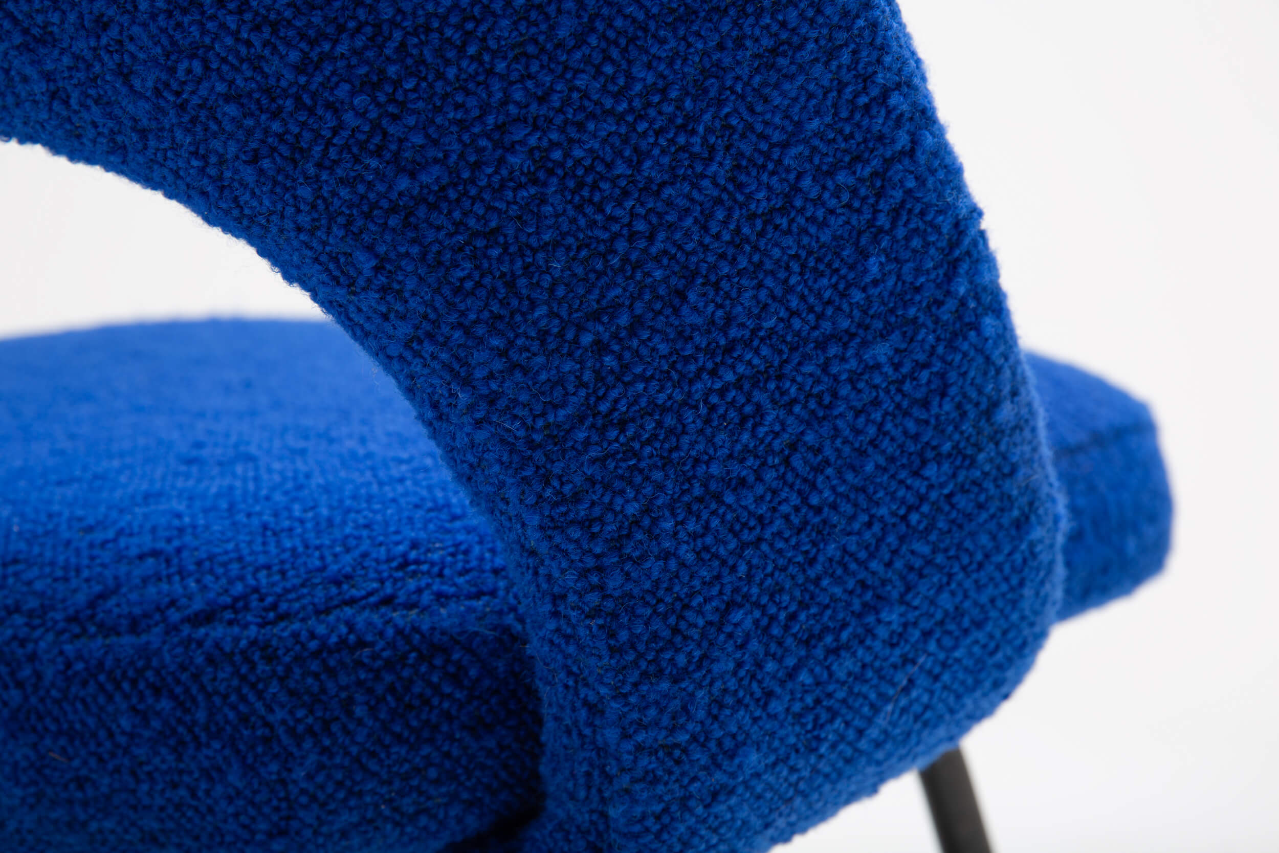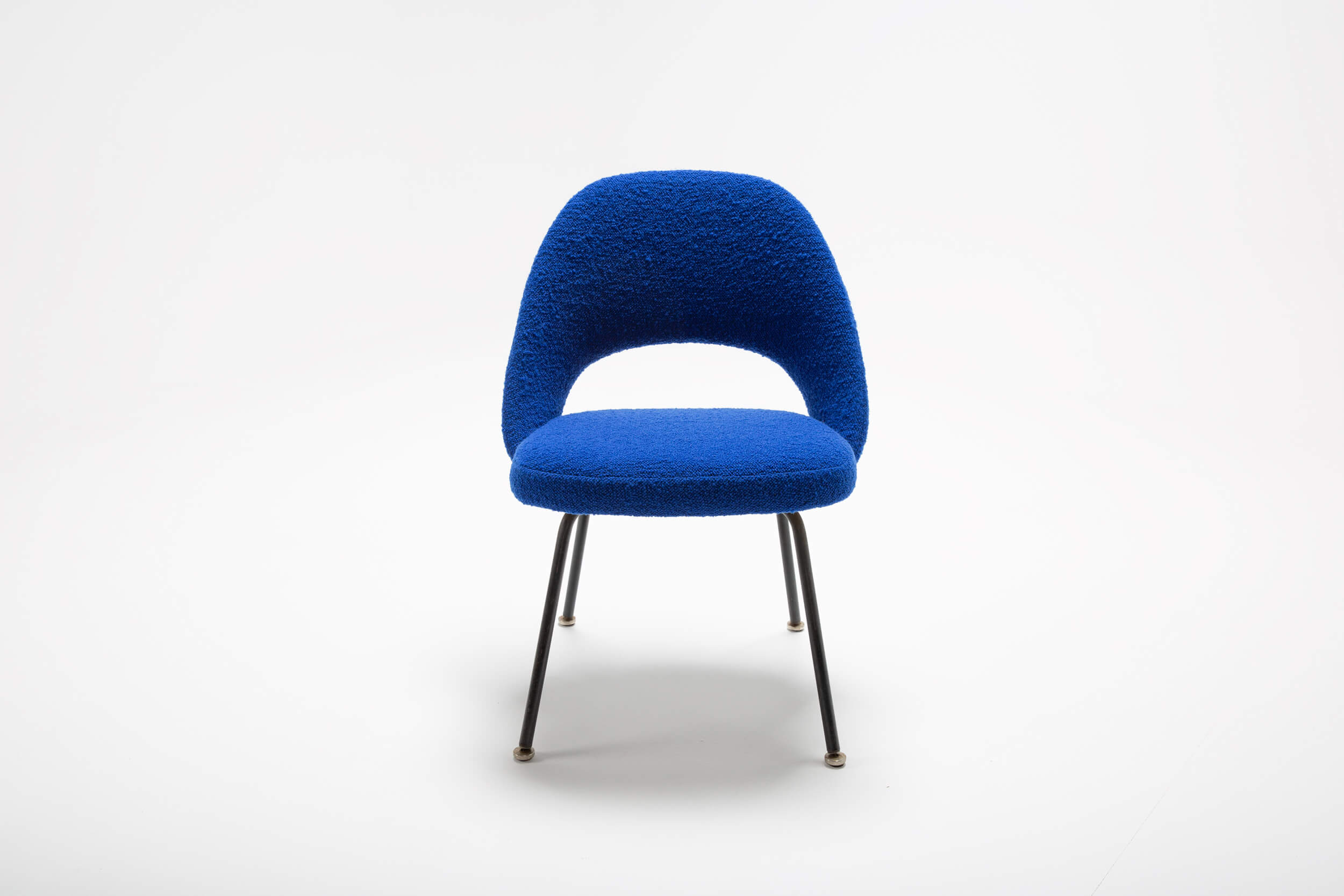 Who doesn’t feel like a boss in this Saarinen-designed chair? For over 70 years, this piece (model 72) has been popular in executive board offices and residential interiors. This design instantly upgrades any dining room. The organically shaped chair is upholstered in a bright blue bouclé by Dedar with an all-new foam interior. The chair asks to be cuddled.