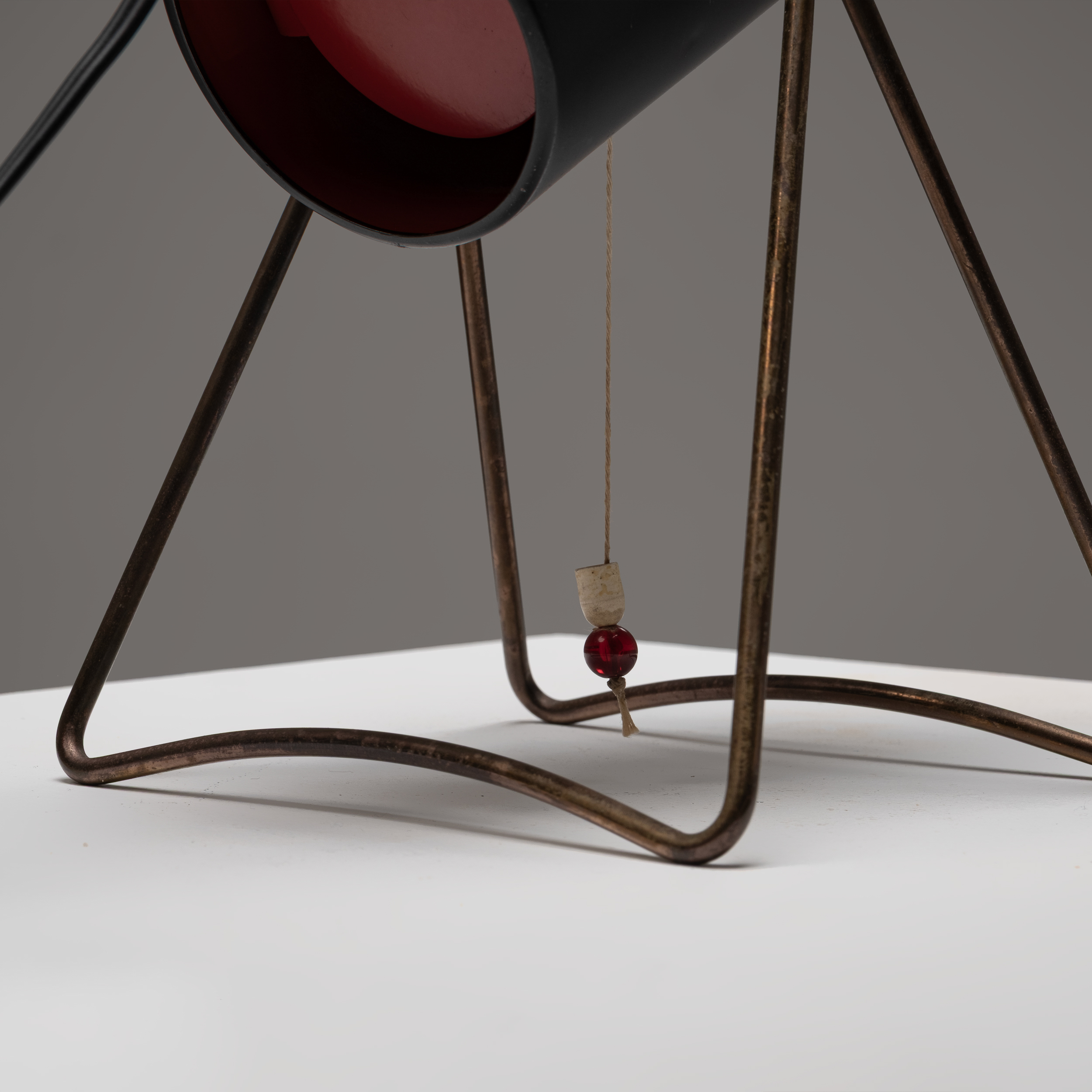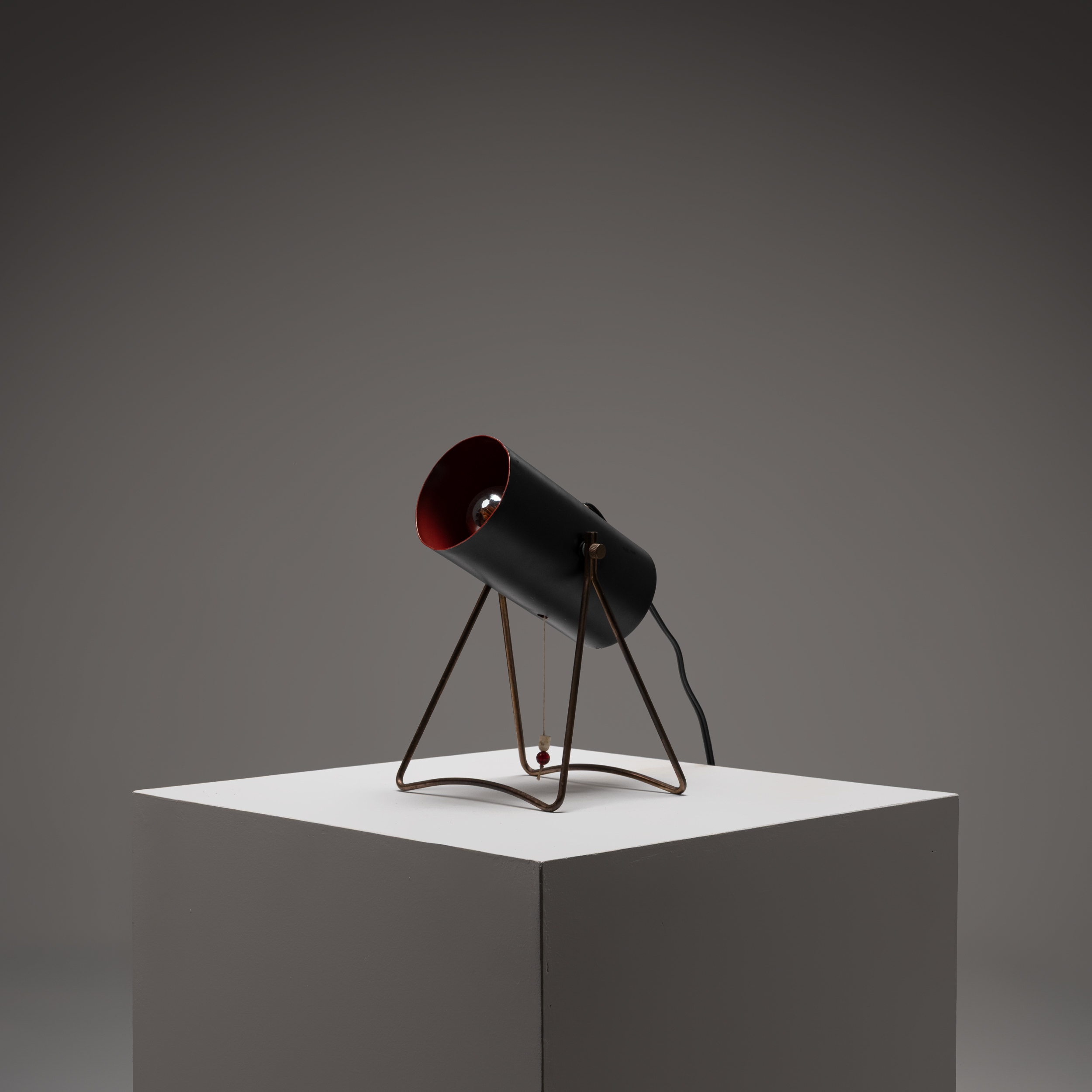 A striking example of Scandinavian mid-century design, this table lamp by Svend Aage Holm Sørensen for ASEA embodies the refined industrial aesthetic of the 1950s. The adjustable cylindrical metal shade, finished in matte black with a contrasting red-toned interior, directs light with precision while creating a soft, atmospheric glow.