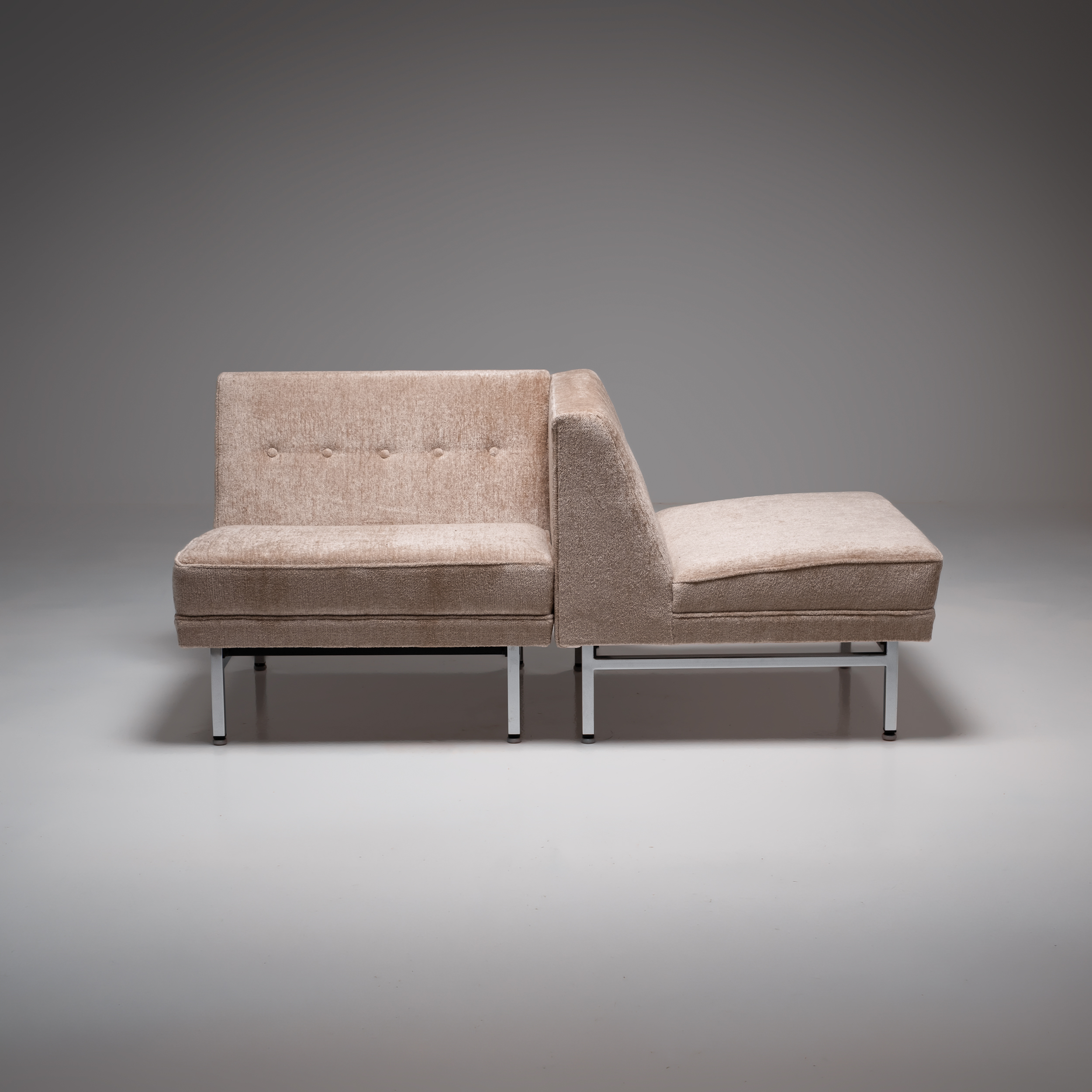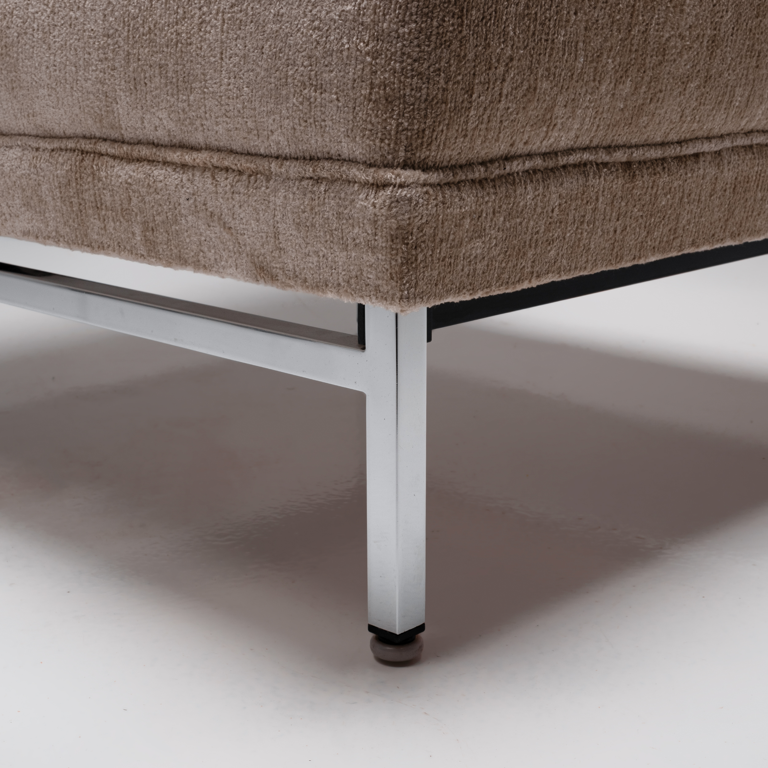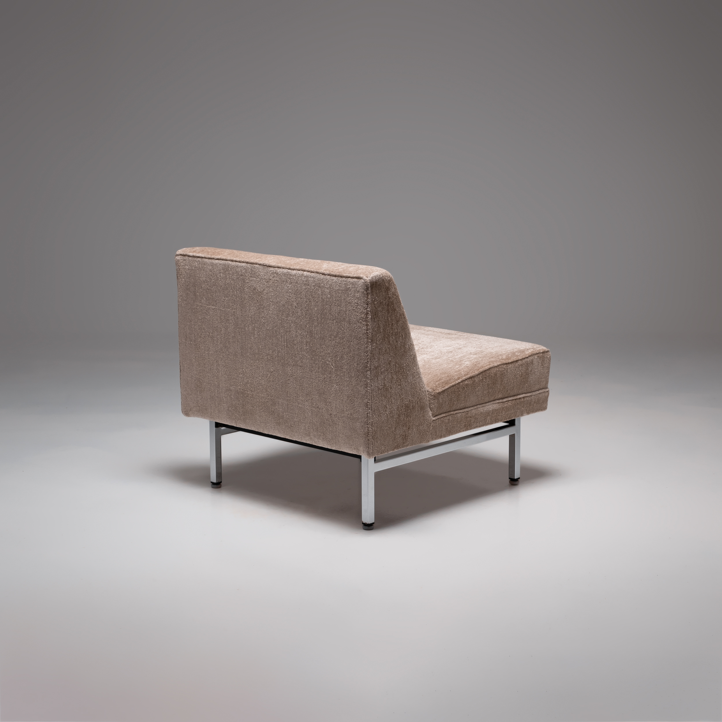 This comfortable two-piece lounge chair designed by George Nelson for Herman Miller creates the perfect centerpiece for any living room. This timeless statement of style is reupholstered in a pale pink champagne chenille fabric with a subtle shimmer by Dedar. The seating is attached to a freshly polished chrome frame.