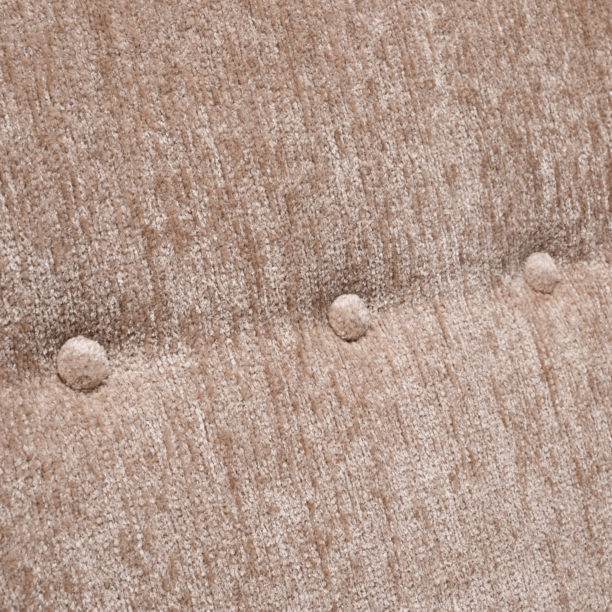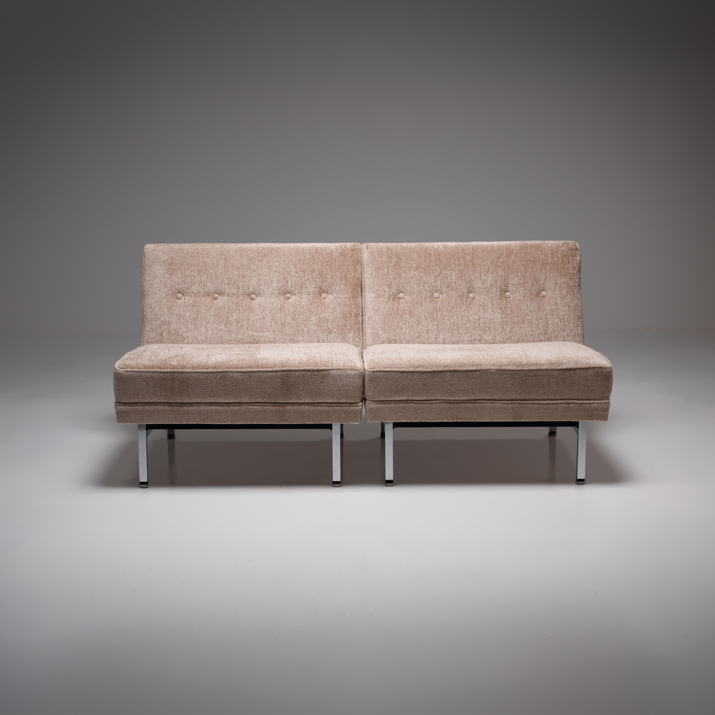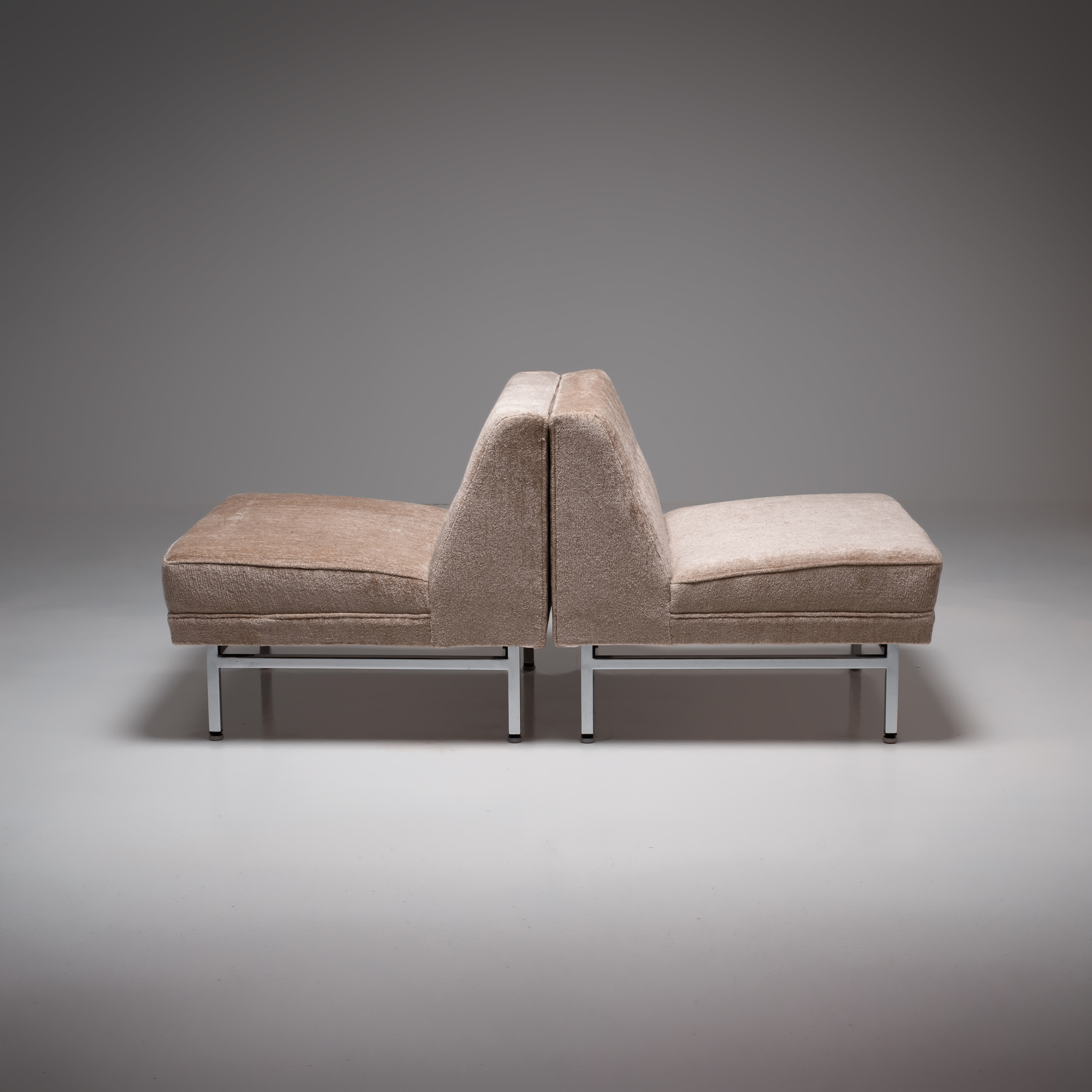 This comfortable two-piece lounge chair designed by George Nelson for Herman Miller creates the perfect centerpiece for any living room. This timeless statement of style is reupholstered in a pale pink champagne chenille fabric with a subtle shimmer by Dedar. The seating is attached to a freshly polished chrome frame.