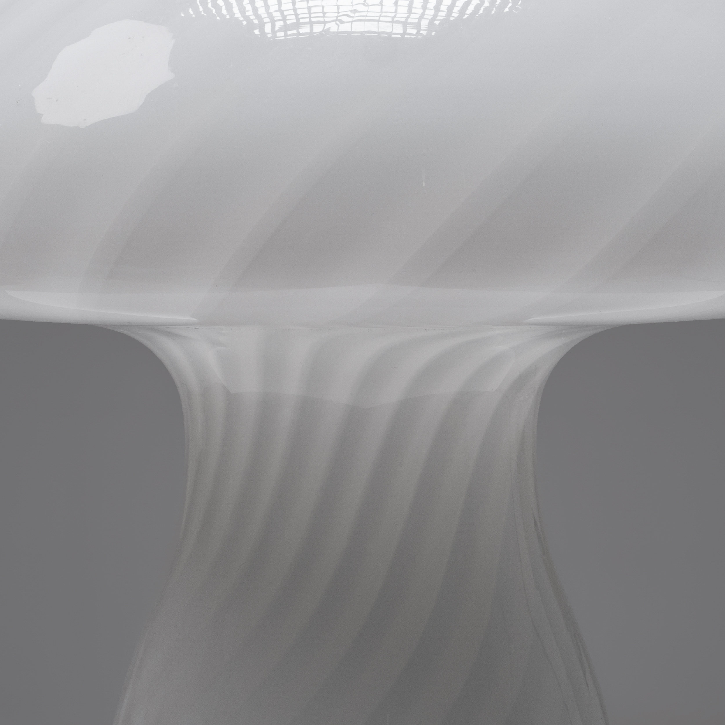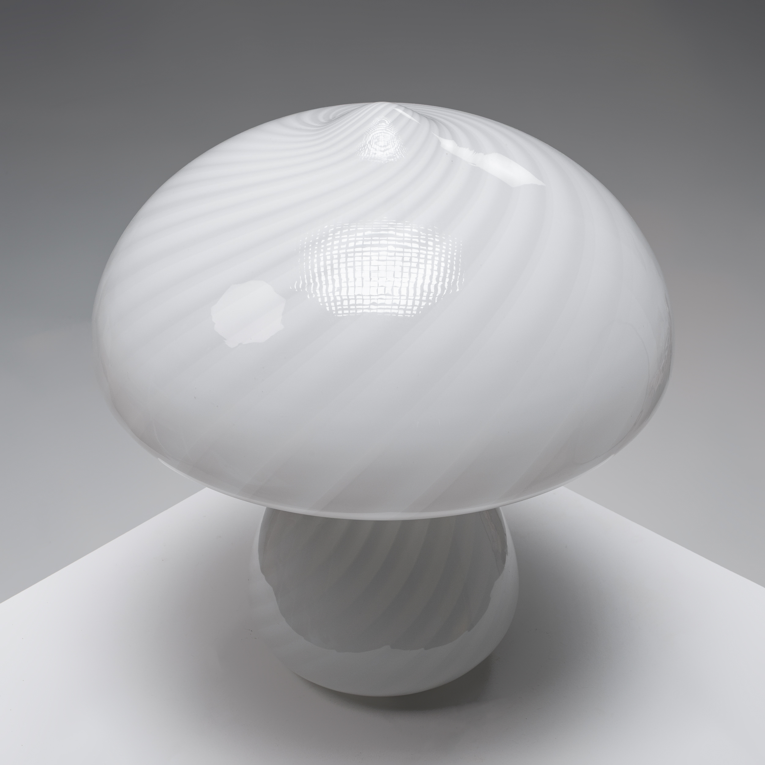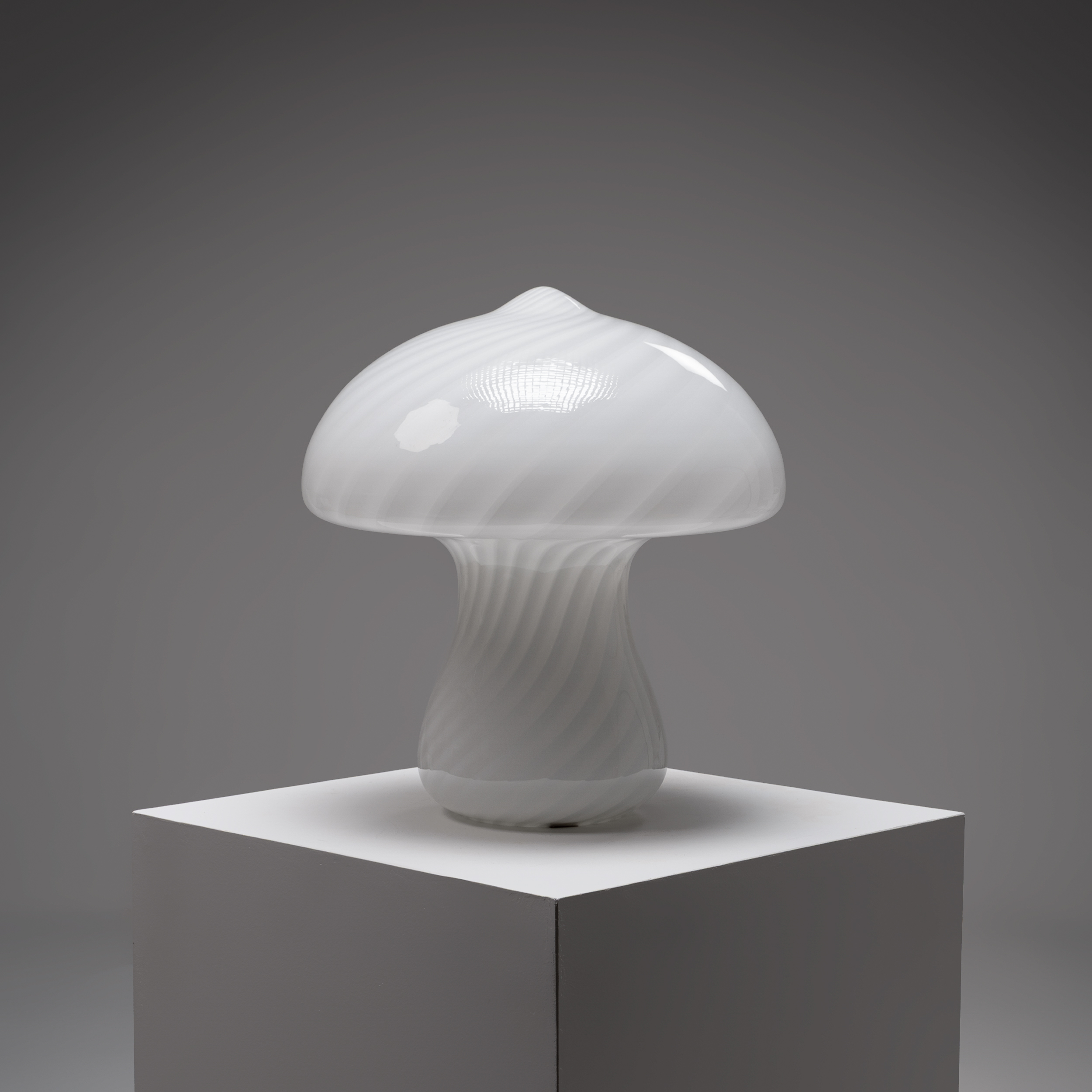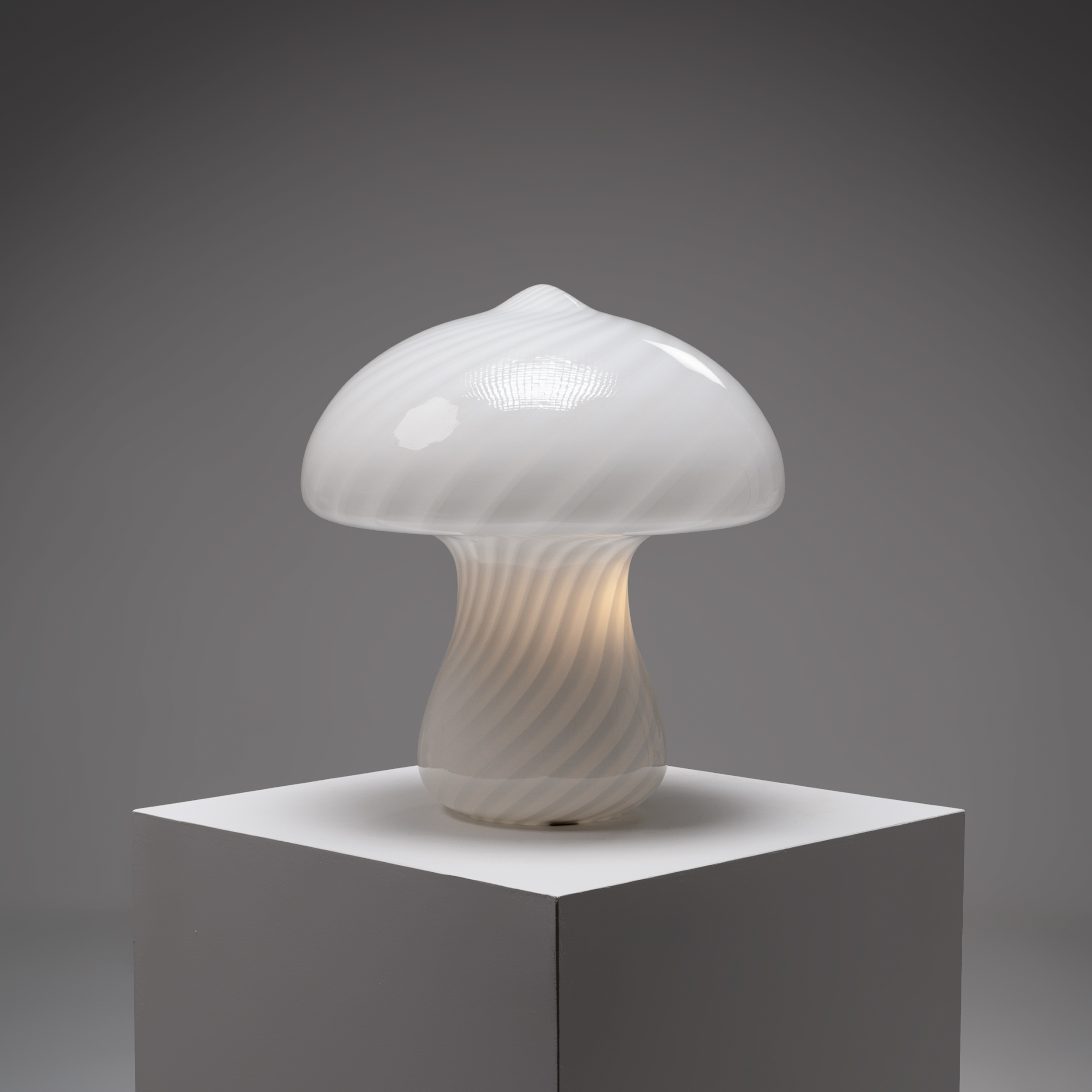 This charming Murano glass “Mushroom” table lamp is a beautiful example of Italian glass artistry. Its softly domed shade and gently curved base form the classic mushroom silhouette, crafted in opaline glass with delicate spiral patterns that add subtle movement and depth.