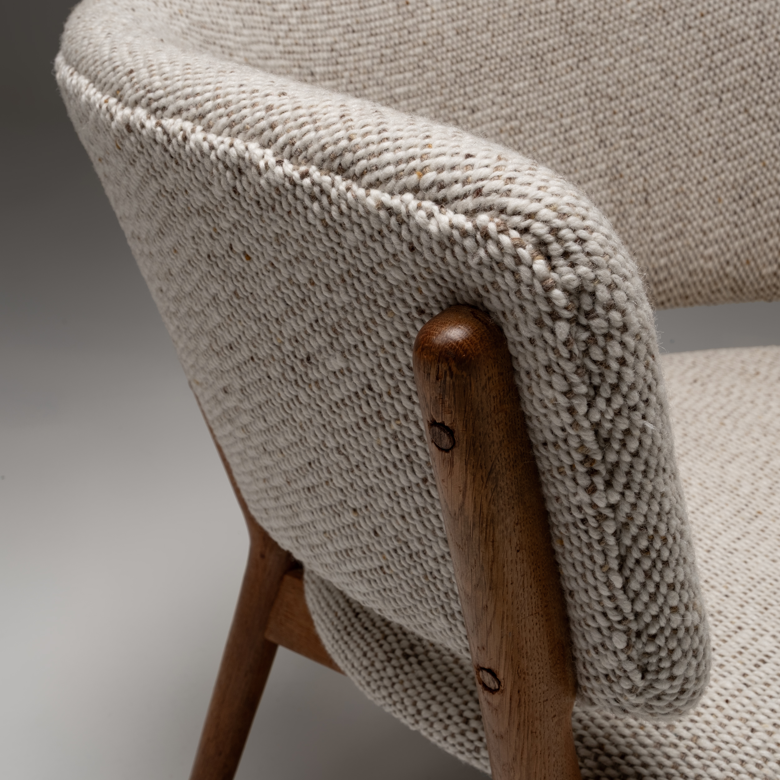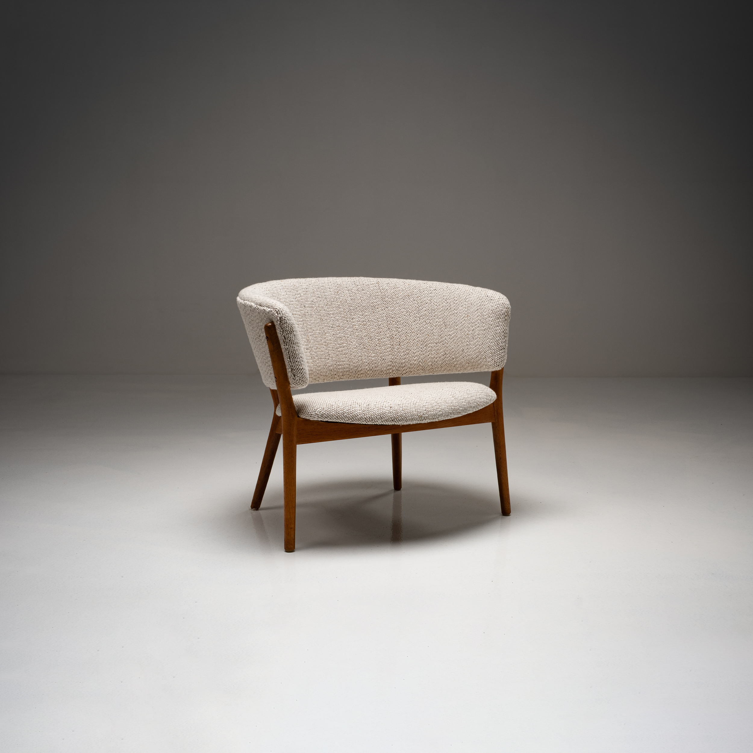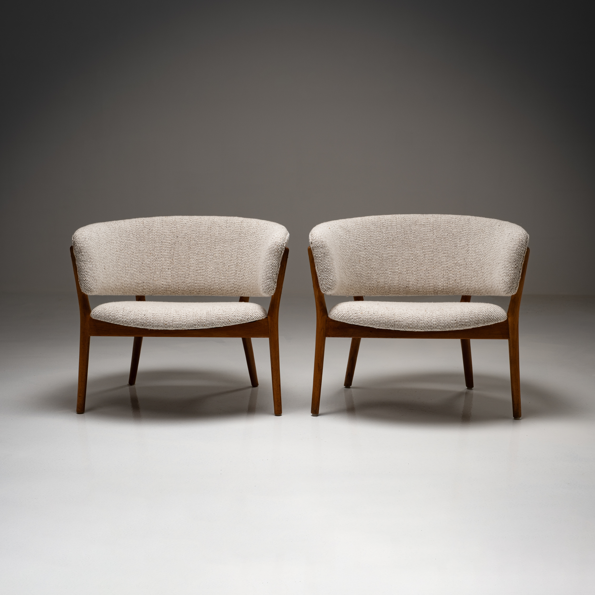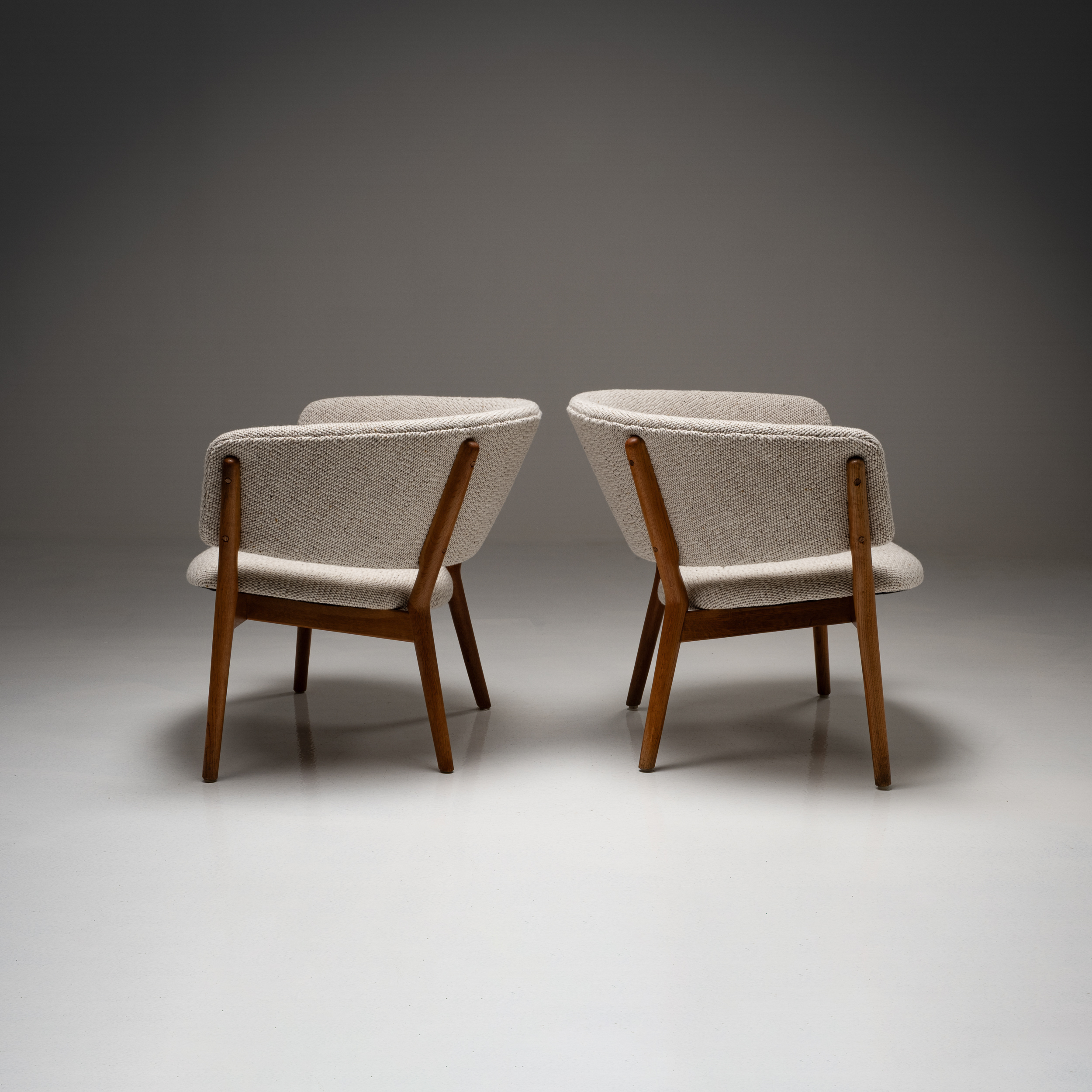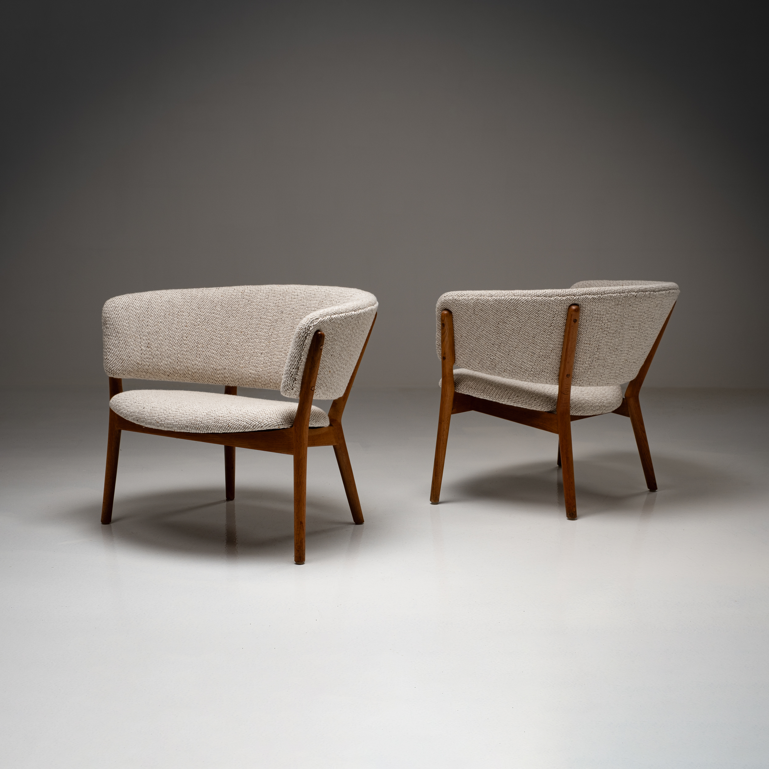 This set of Nanna Ditzel ND-83 lounge chairs is a strong example of her sculptural yet deeply human approach to Danish modern design. The chairs feature elegantly shaped solid oak frames, carefully proportioned to create both visual lightness and structural strength. The gently curved armrests and angled legs give the design a distinctive architectural presence, while maintaining an inviting, relaxed posture.