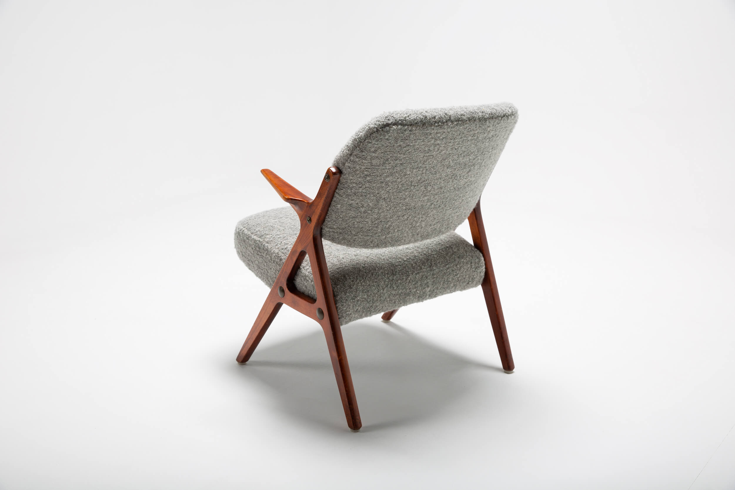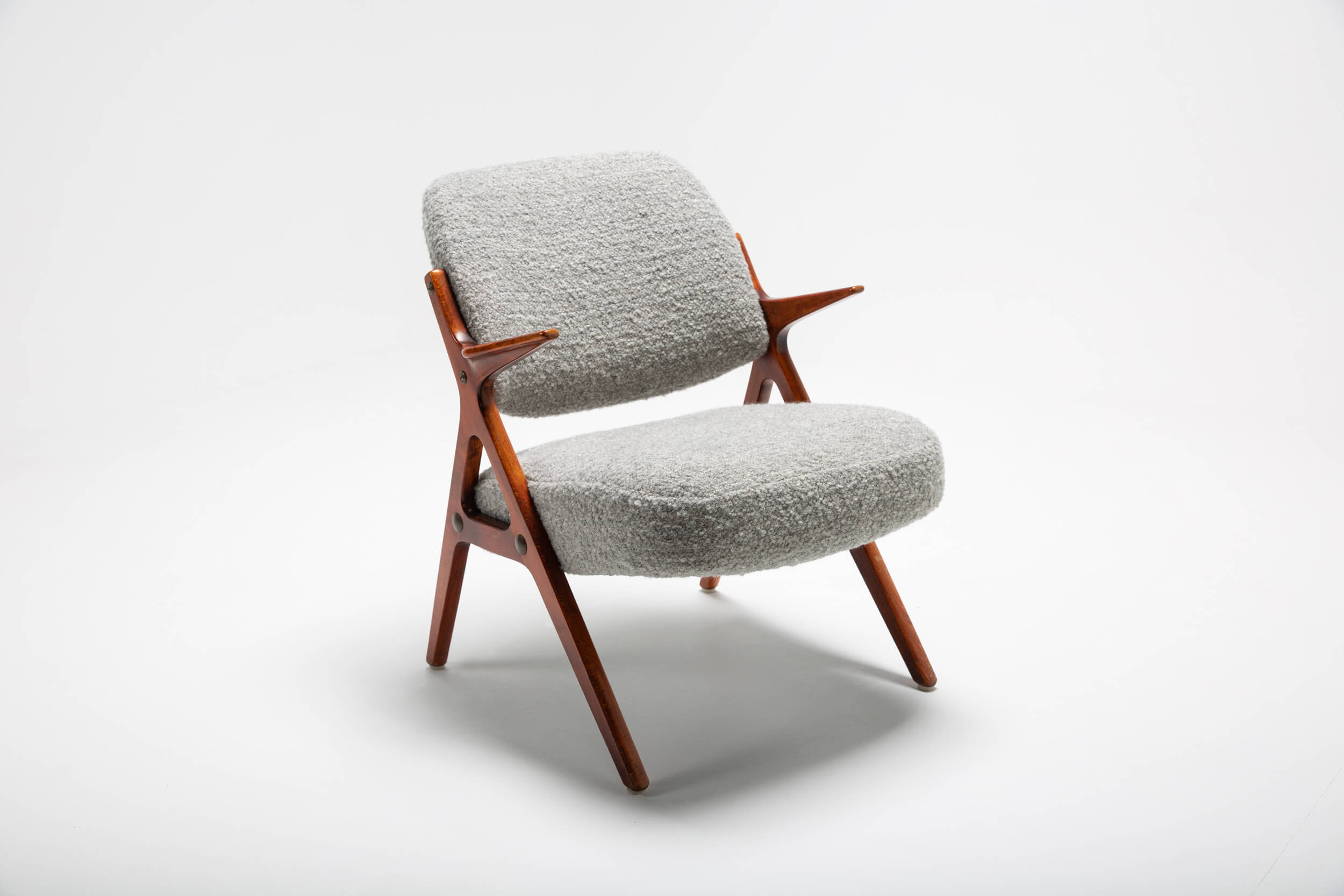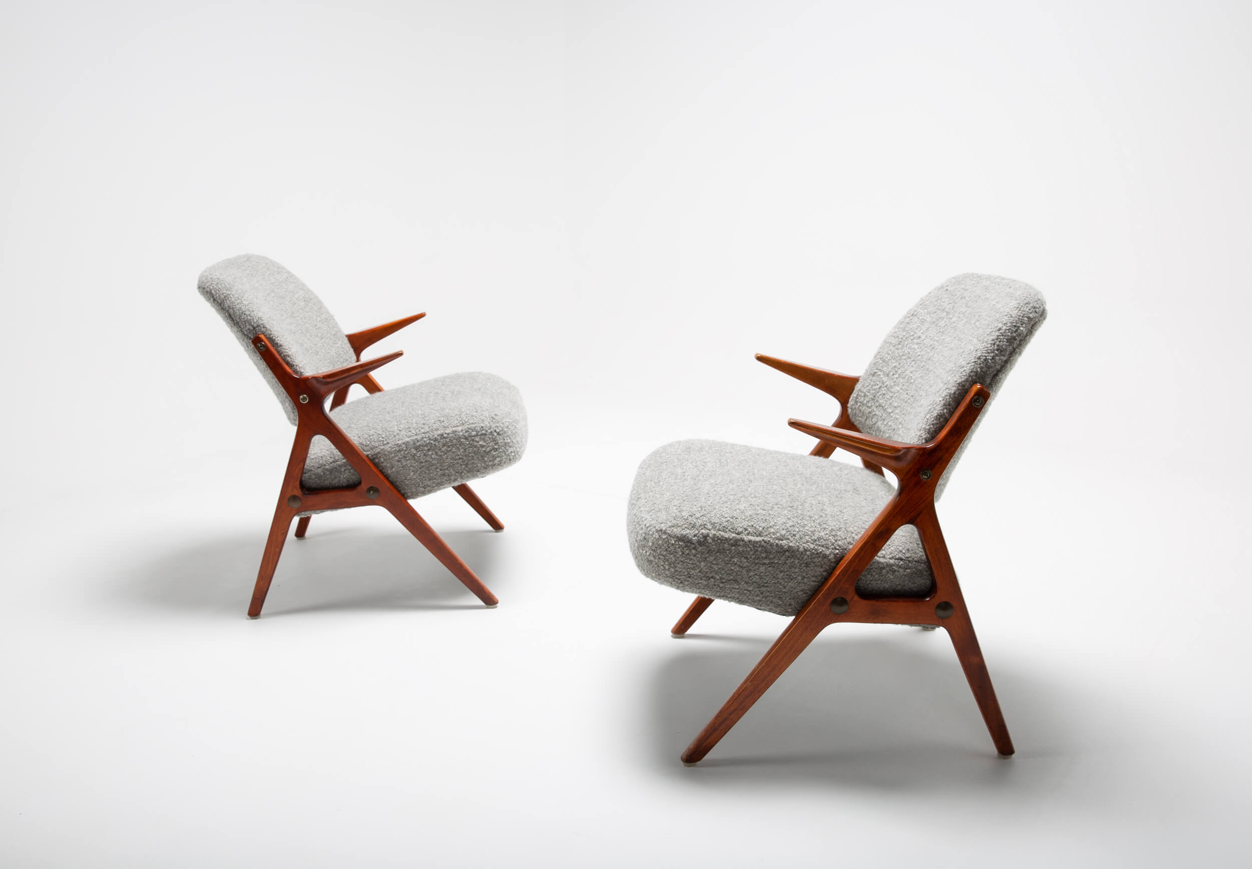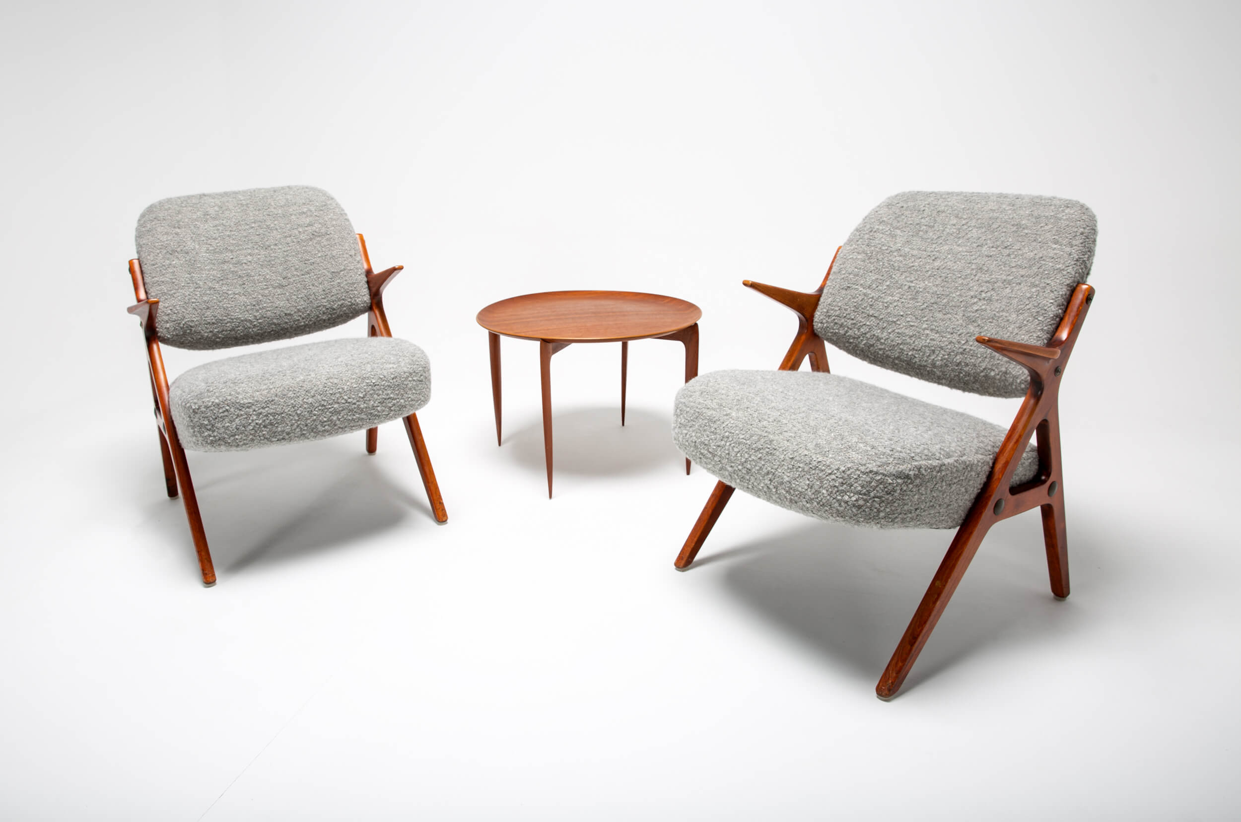 This set of vintage armchairs from Bröderna Andersson was designed in the 1950s. Like many Danish designs, they have clean and friendly shapes. The chairs are inspired by the more well-known Bengt Ruda chairs. This set is reupholstered in a rich heavy textural and irregular bouclé fabric by Dedar, containing only natural fibers (linen/virgin wool). The wood shows signs of aging, which we’ve intentionally left as part of its charm and original characteristic.