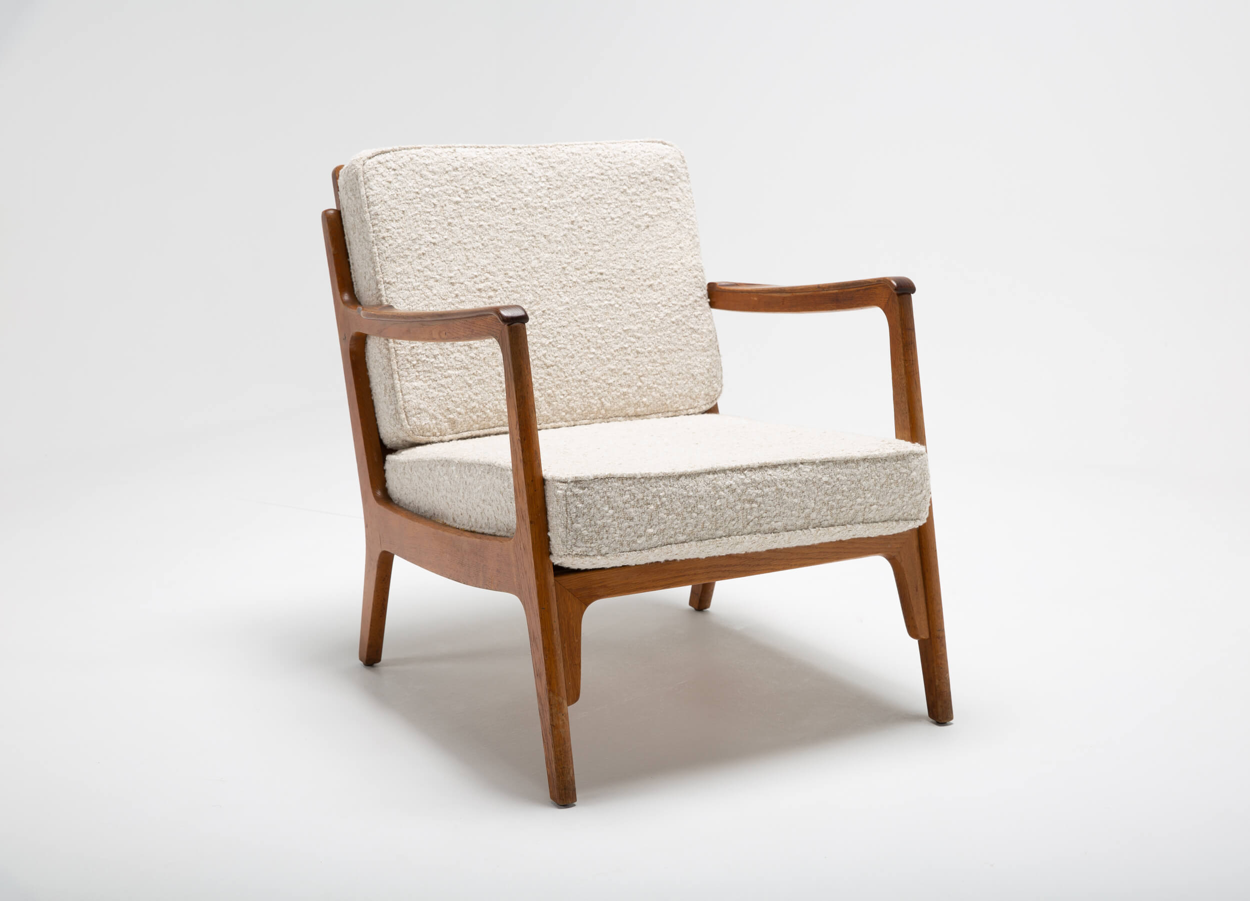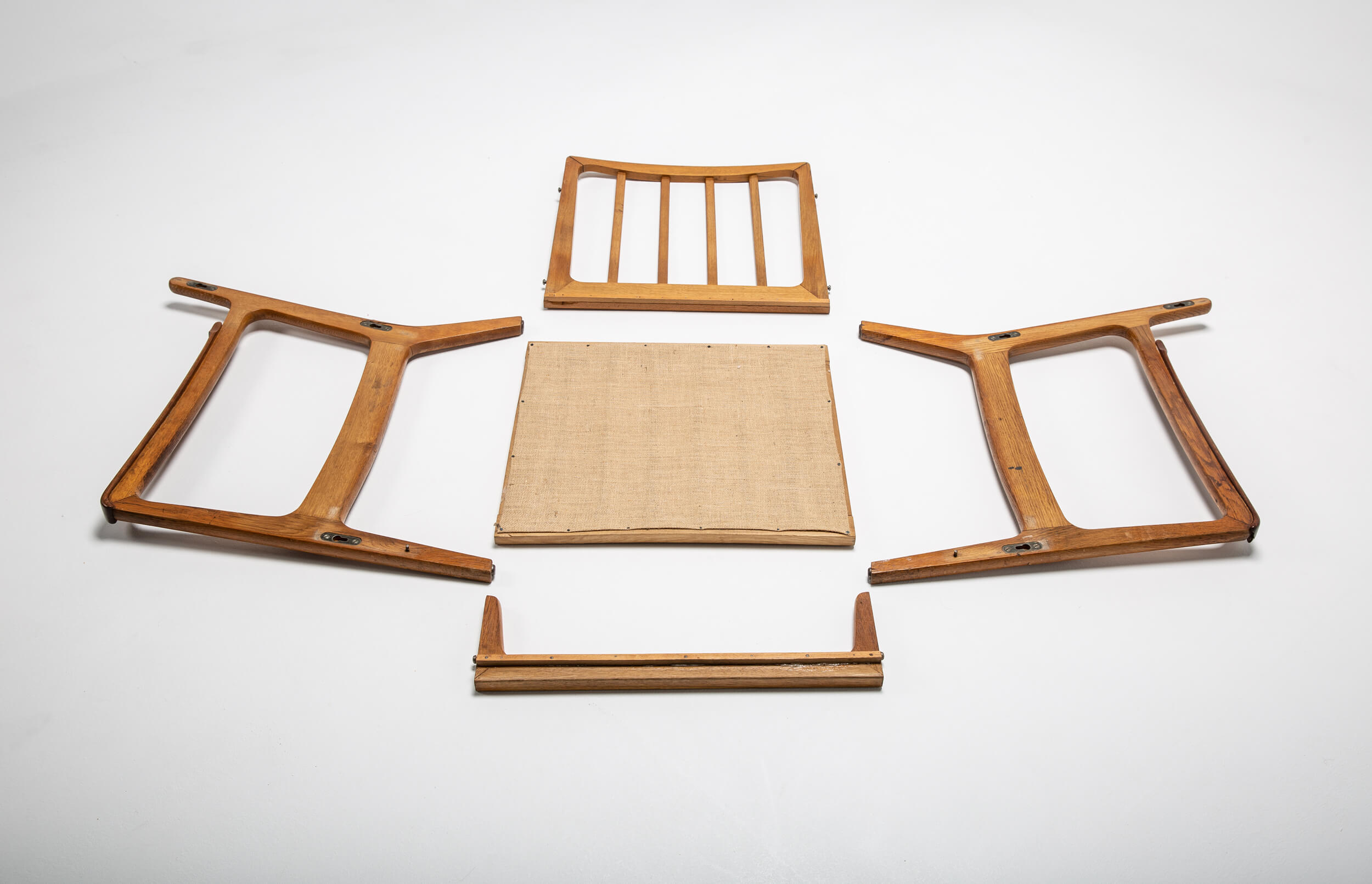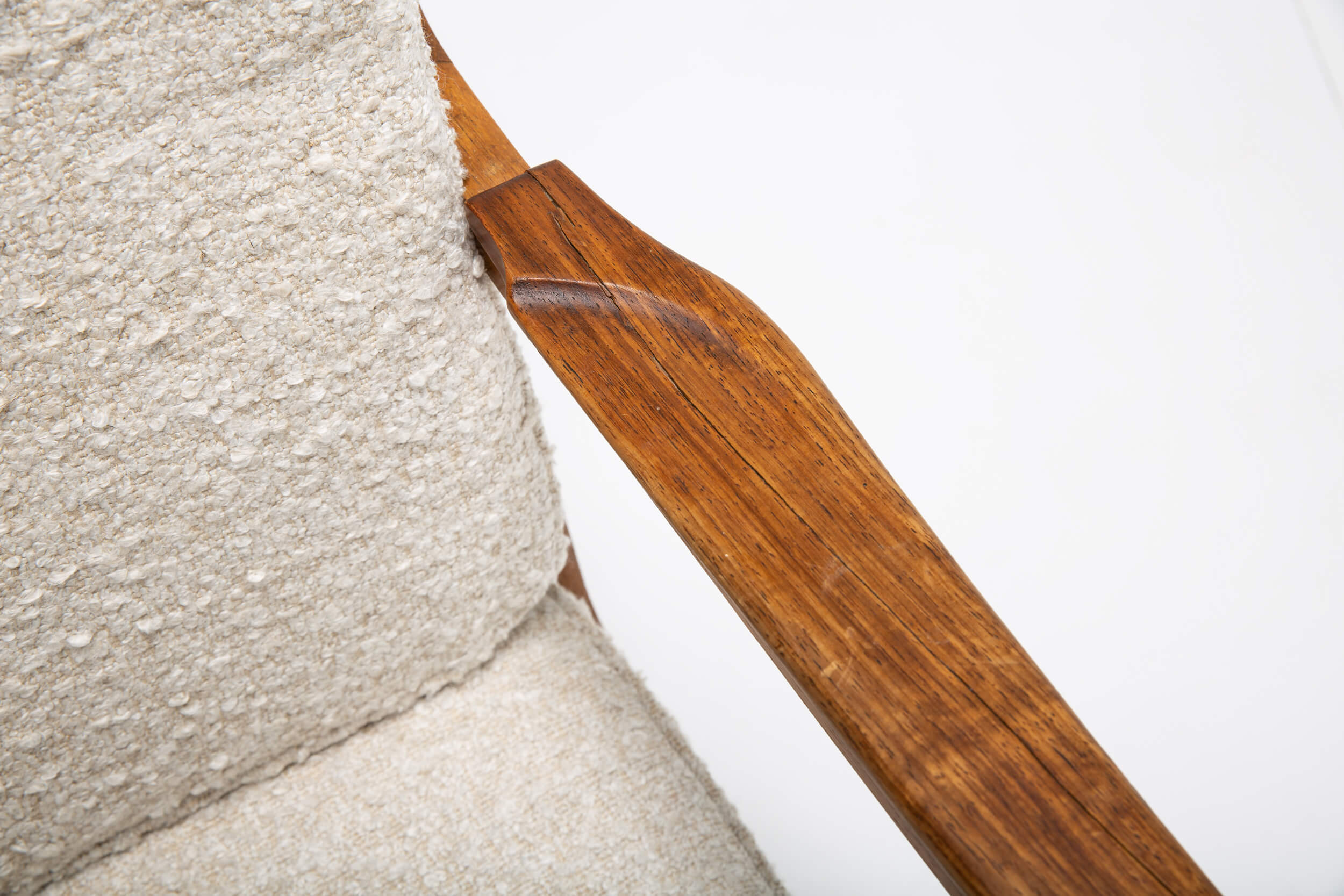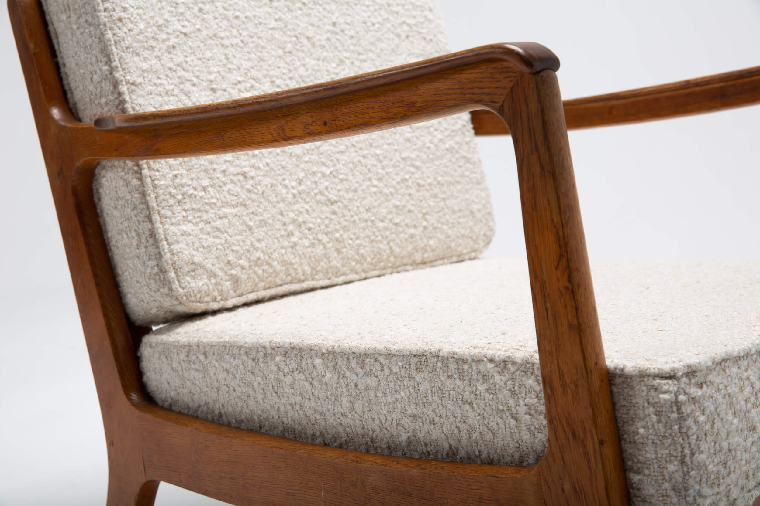 Danish design has always manifested itself through clean and friendly shapes. These lounge chairs are no exception. The new cushions are highly comfortable and reupholstered in a natural-colored fabric by Lelièvre. Also, its construction is quite special. Both chairs can be taken apart and stored flat. The craftsmanship of the woodwork is exquisite by the subtle way the wood is shaped and curved. The wood shows signs of aging, which we’ve intentionally left as part of its charm and original characteristic.