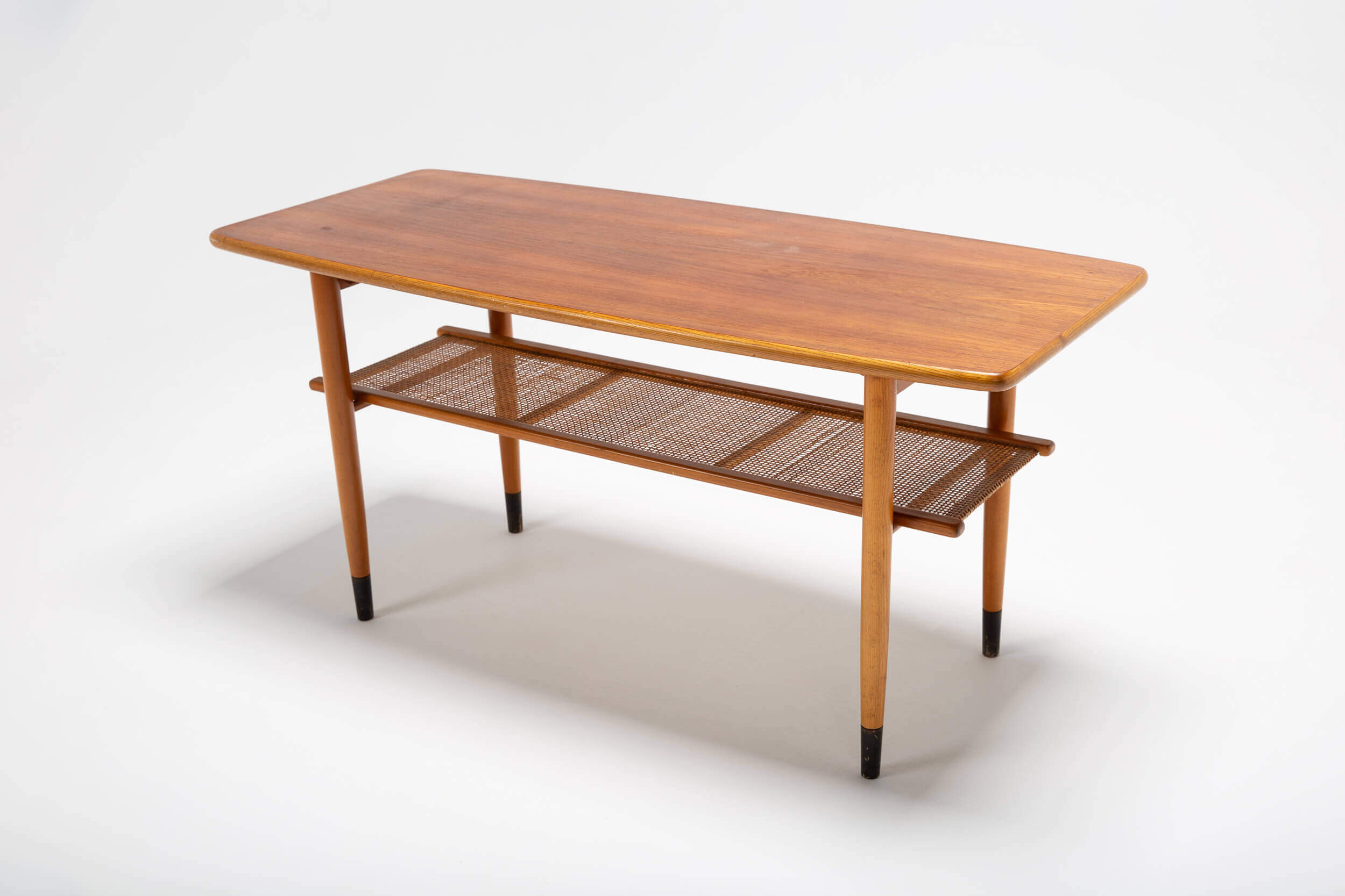 Coffee never tasted so good! This coffee table was designed by Hugo Troeds Bjärnum in Sweden. It features a wooden top and frame with a rattan shelf for storage. Hugo Troeds Bjärnum is a Swedish furniture manufacturer/designer.