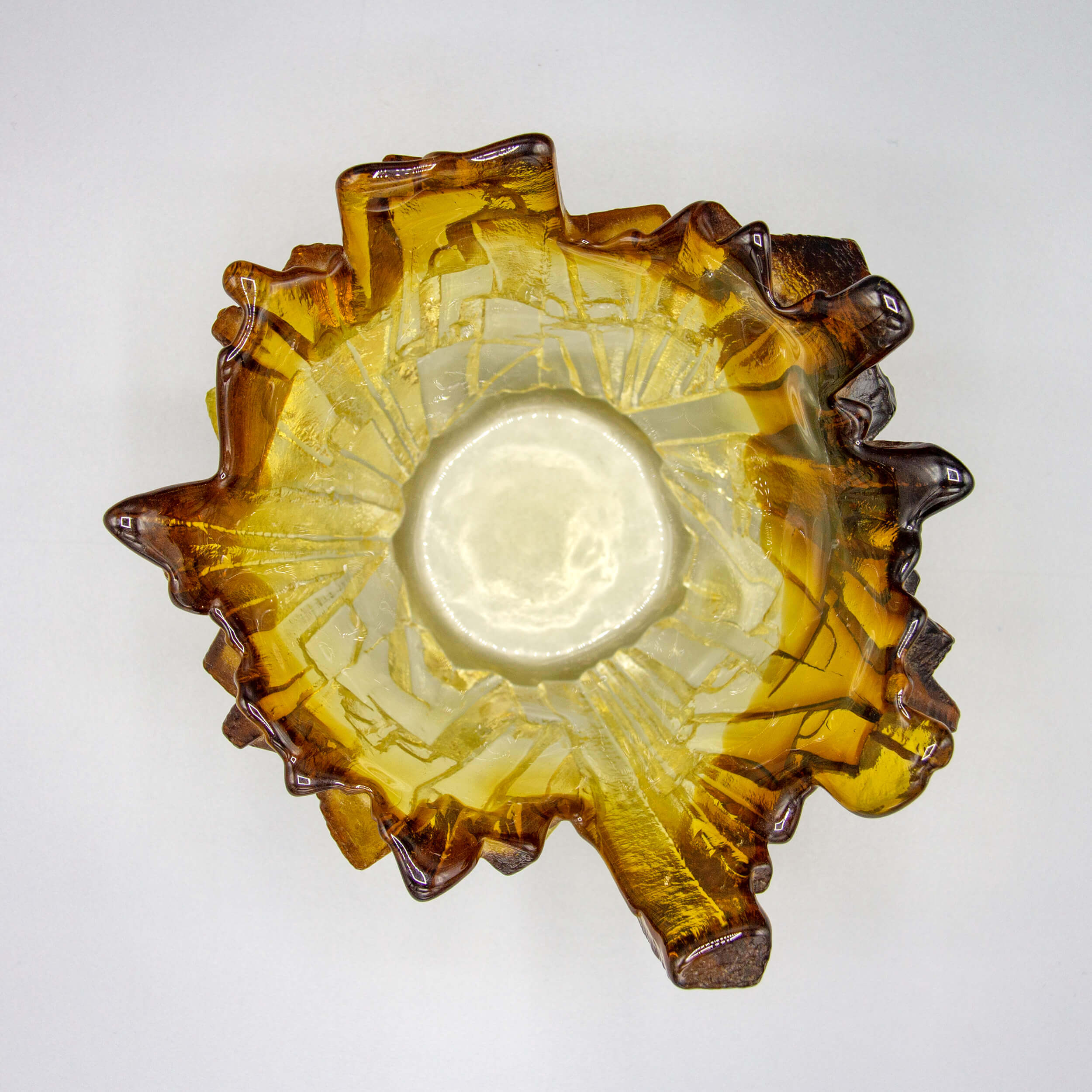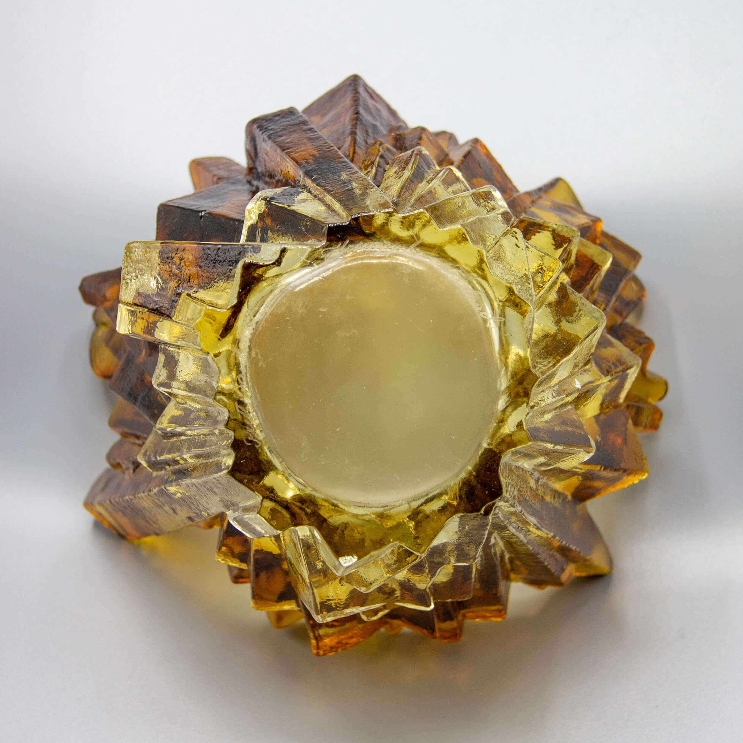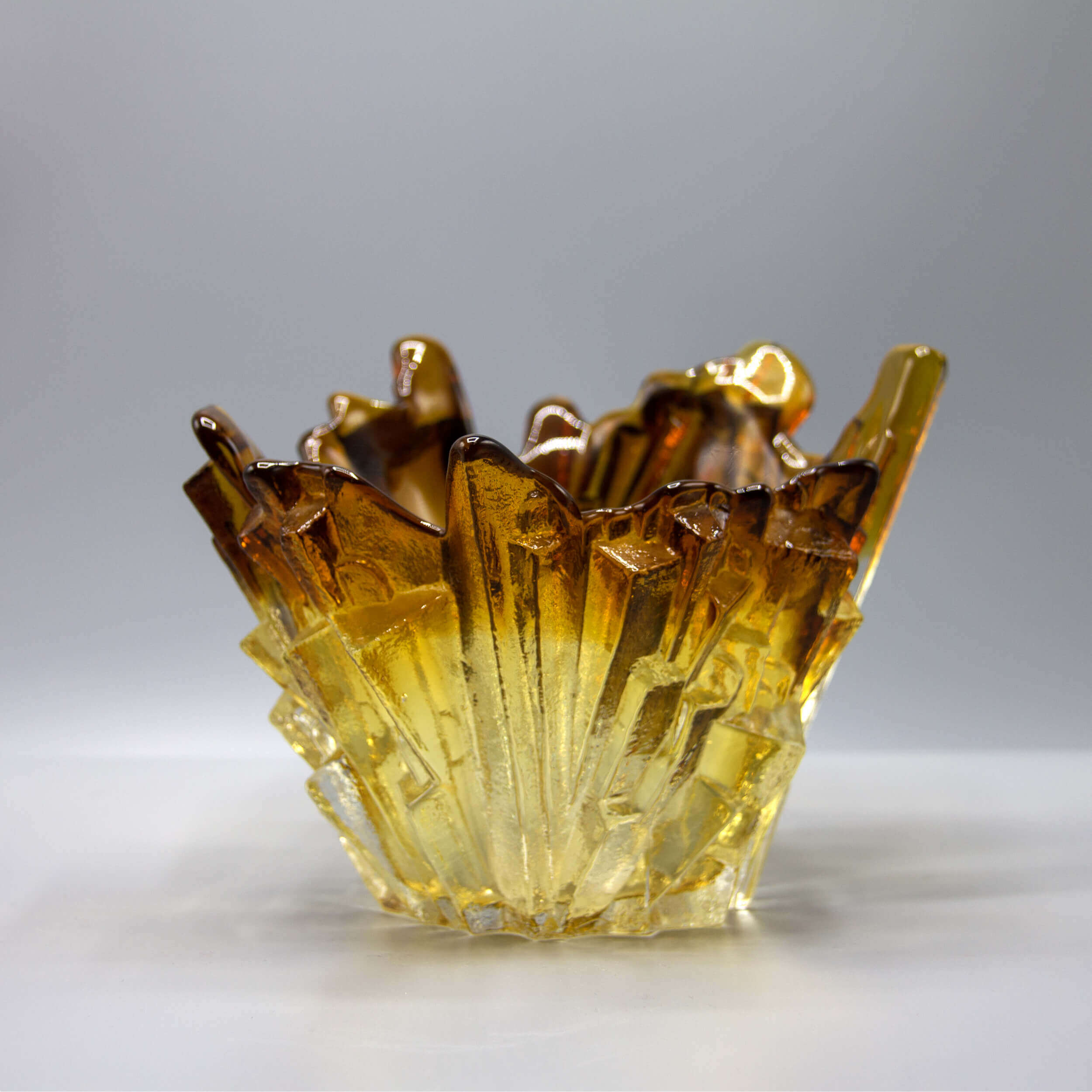This beautifully crafted, colored glass vase named “Ice” is one of the famous designs from Pertti Santalahti. In this design, geometric and organic shapes come together in an asymmetrical statement. A bold piece for any interior or office. The glass shows a colored gradient from brown/ocher to near transparent at the bottom. This piece has an etched attribution mark from the designer.