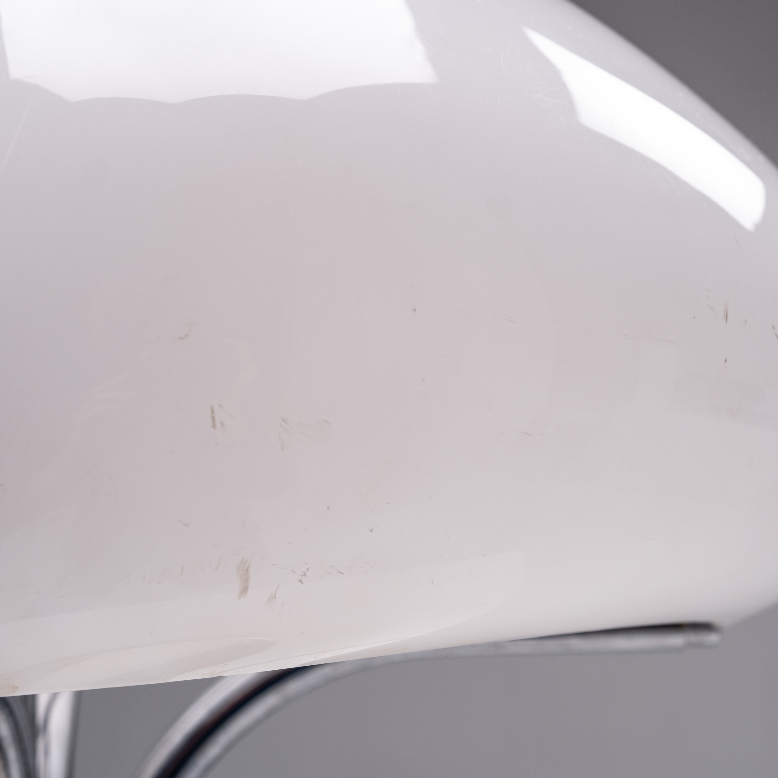 The lamp is in very good vintage condition. There are a few small black streaks visible on the white shade. It has no brand or sticker, but does have a mark where a sticker used to be. The frame shows light signs of use consistent with age, but nothing that detracts from its overall appearance or functionality.